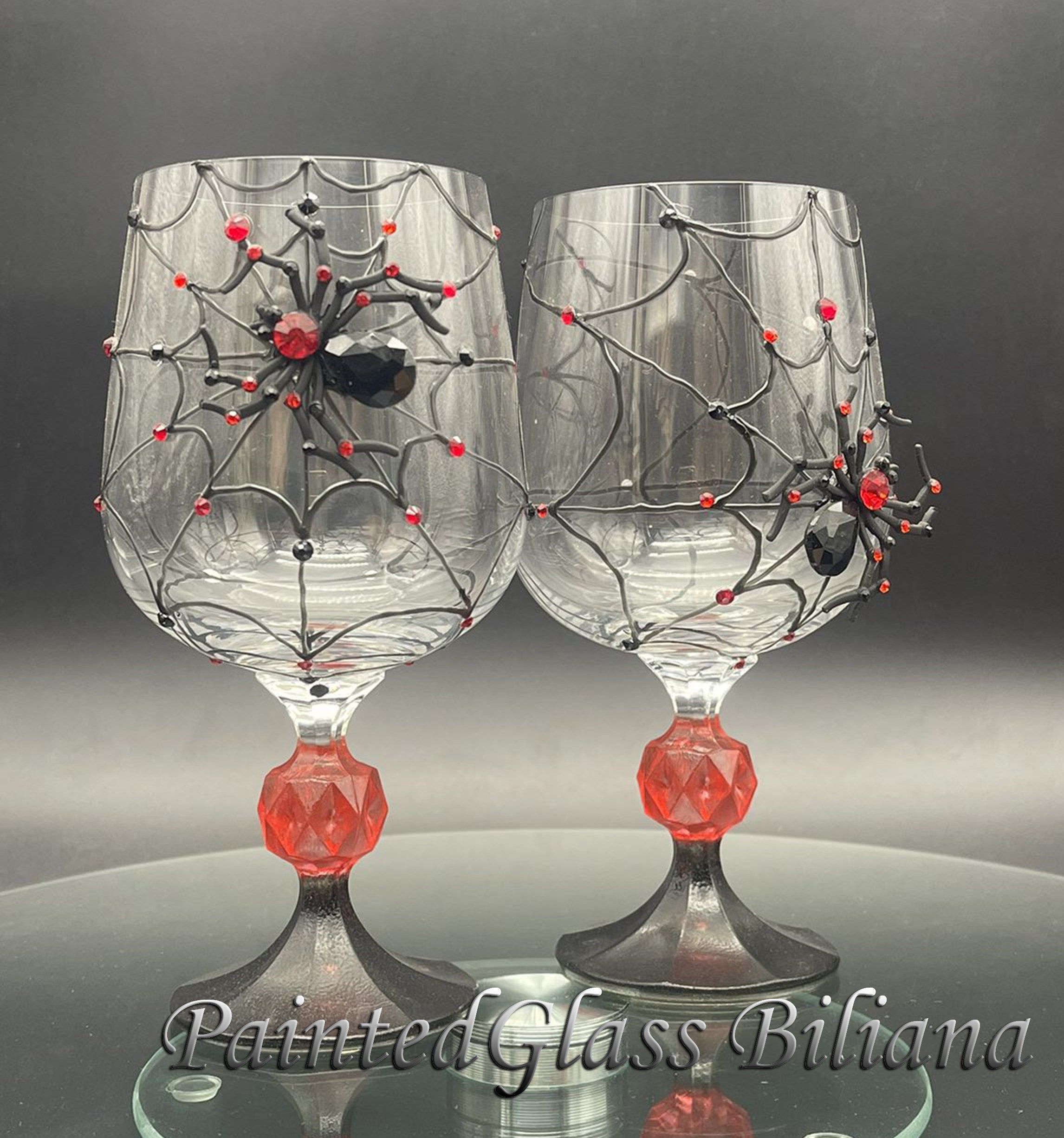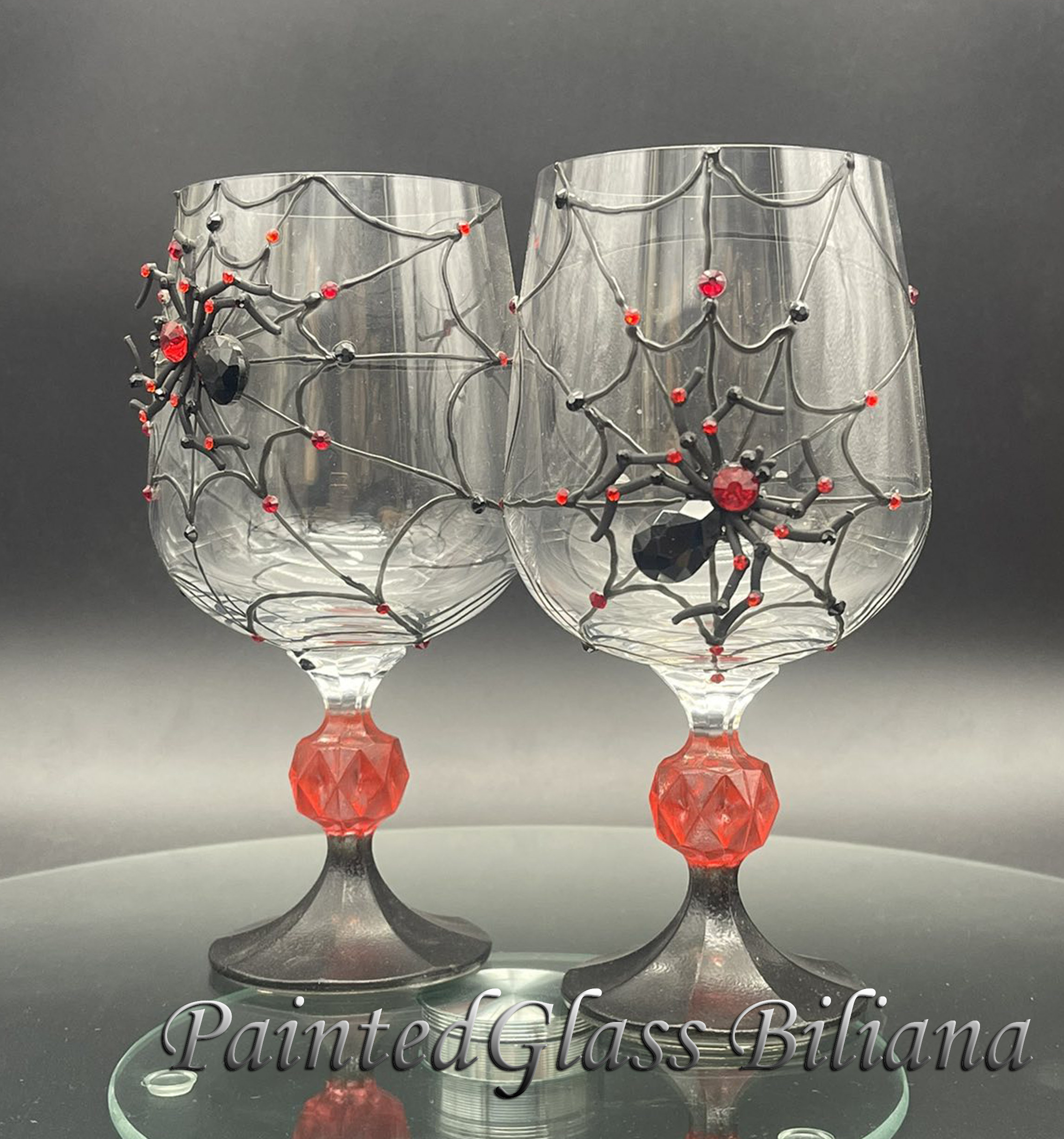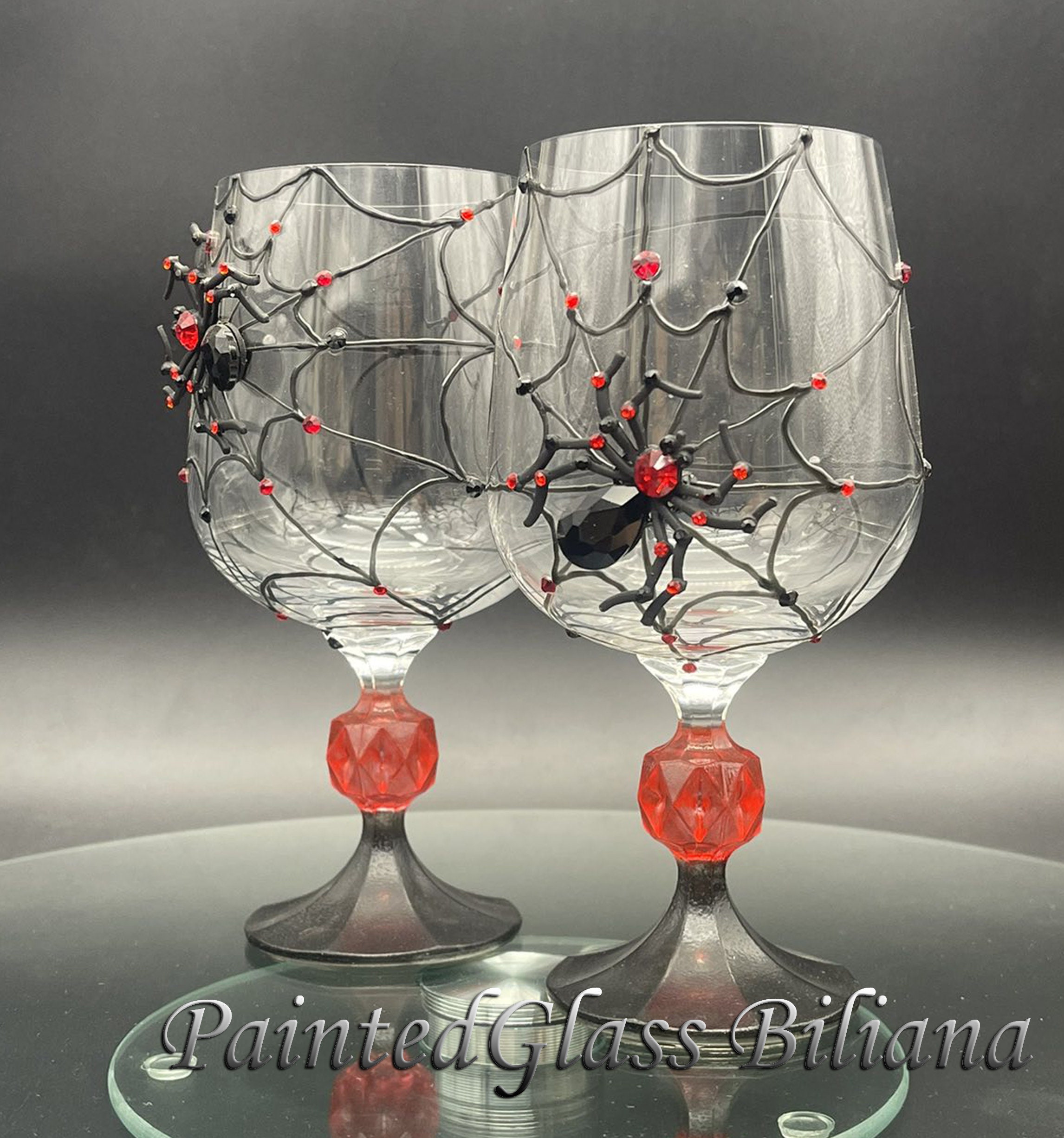 Hand painted wine glasses, decorated with crystals spider, swarovski crystals .