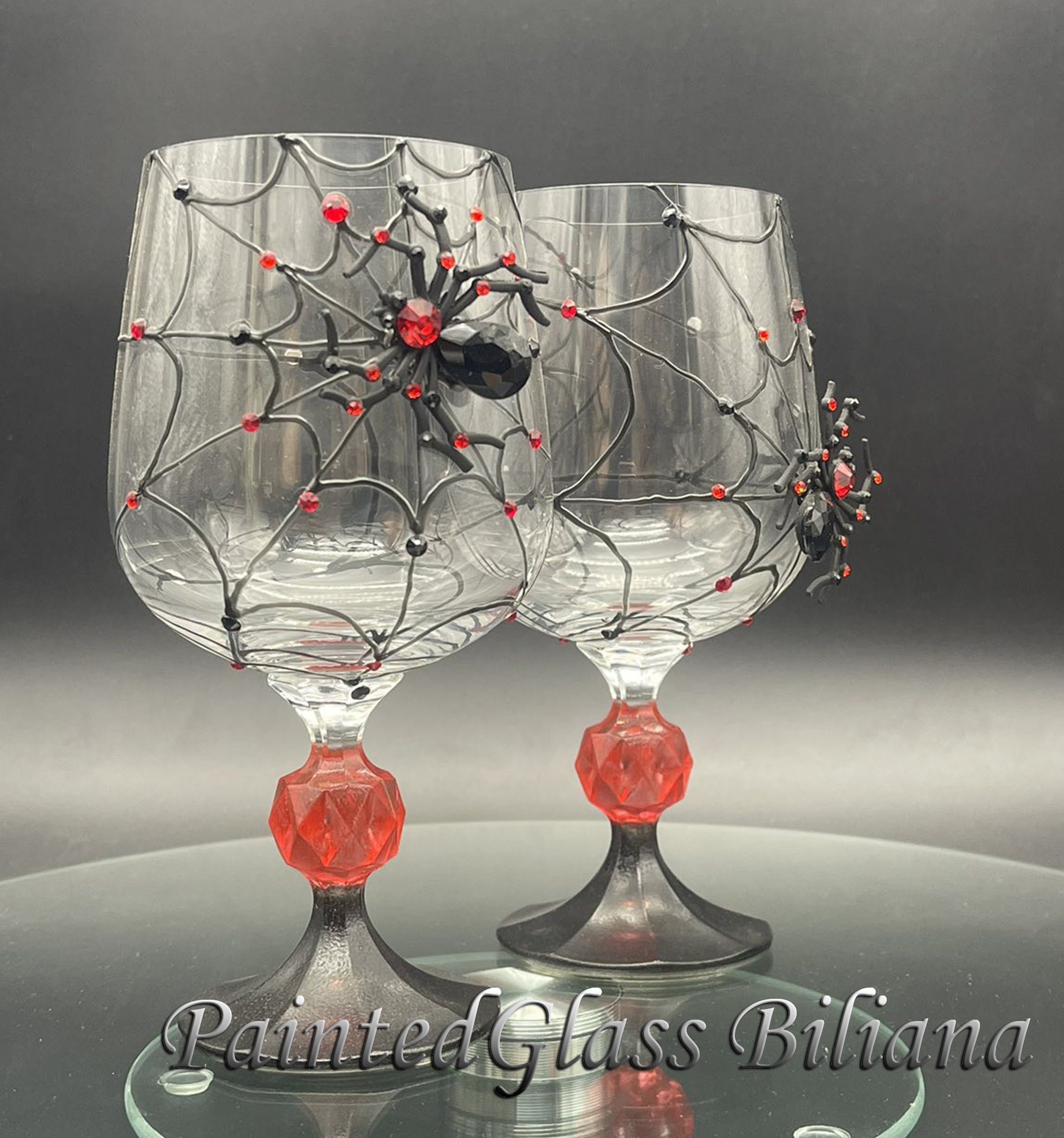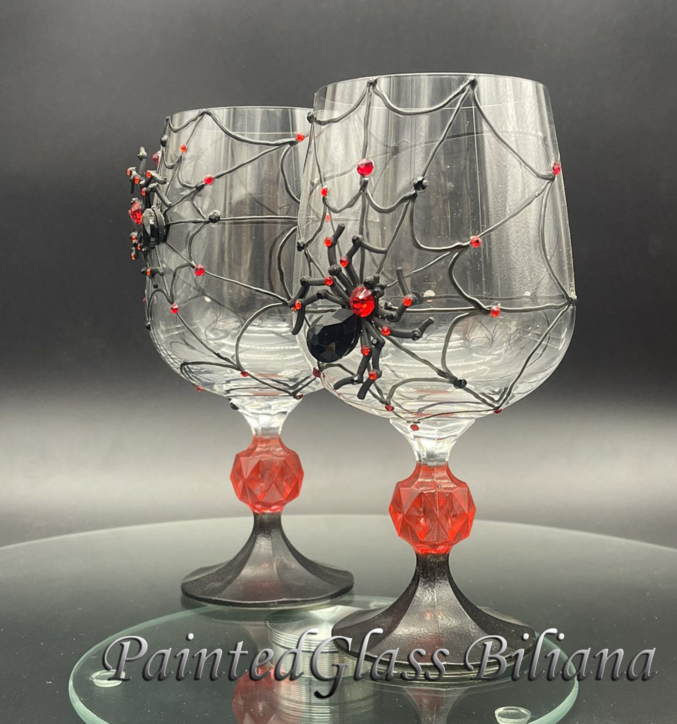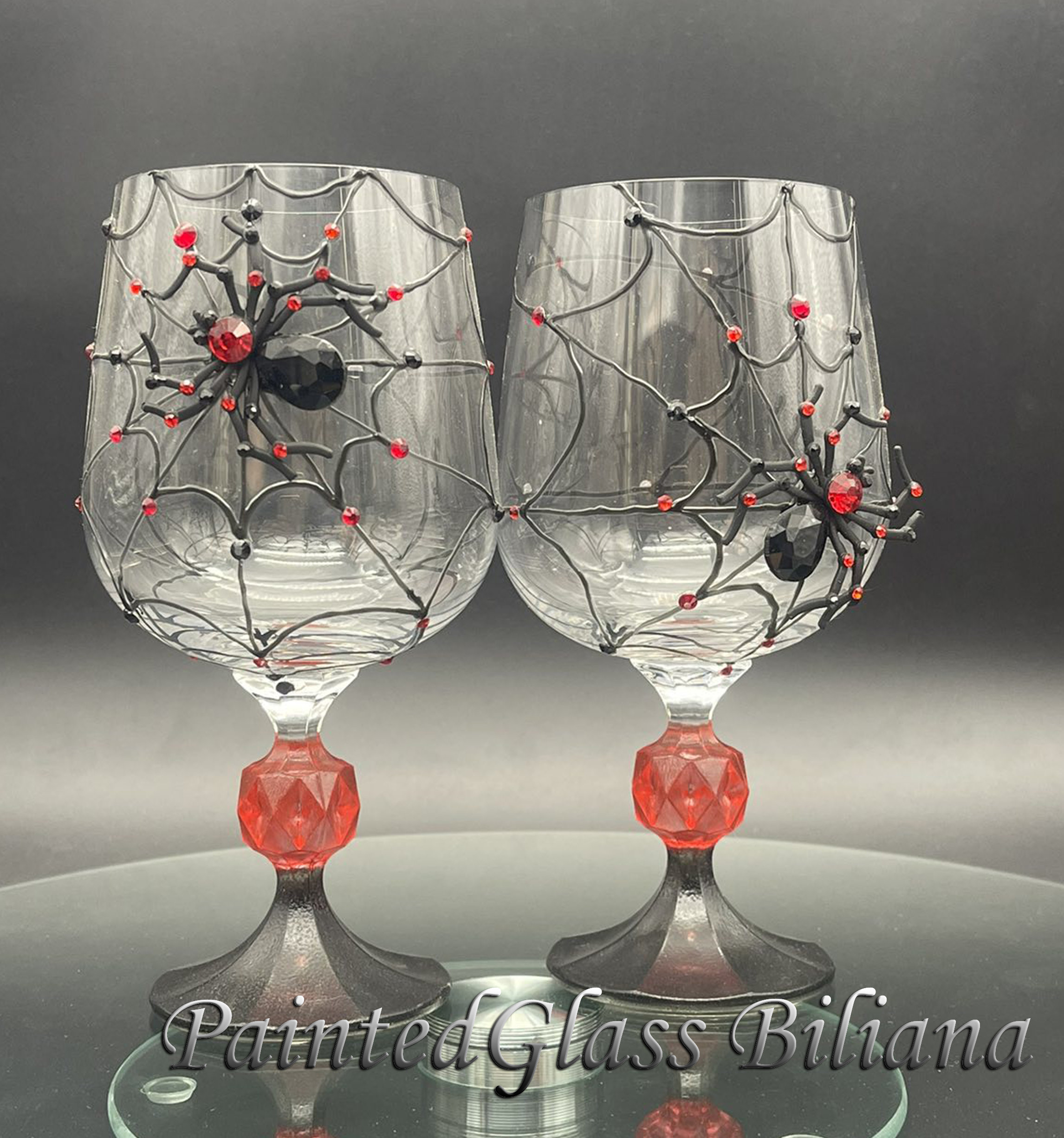 Hand painted wine glasses, decorated with crystals spider, swarovski crystals .