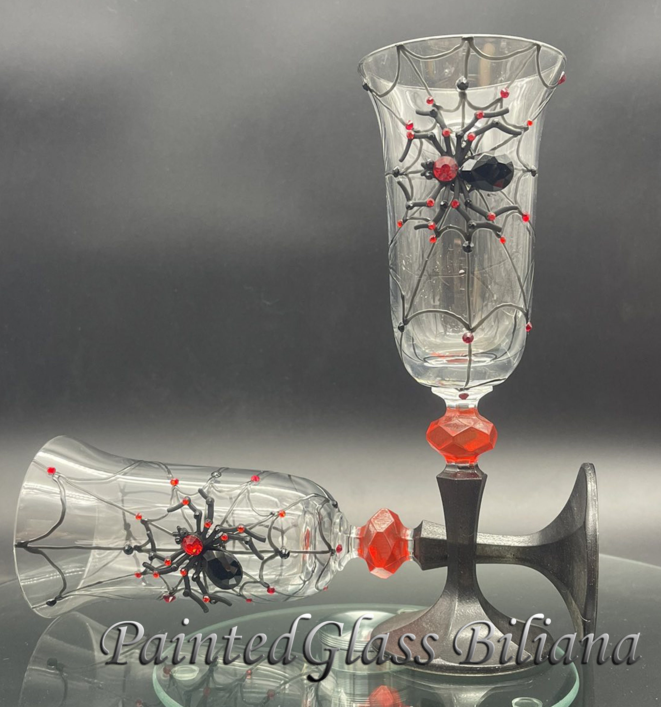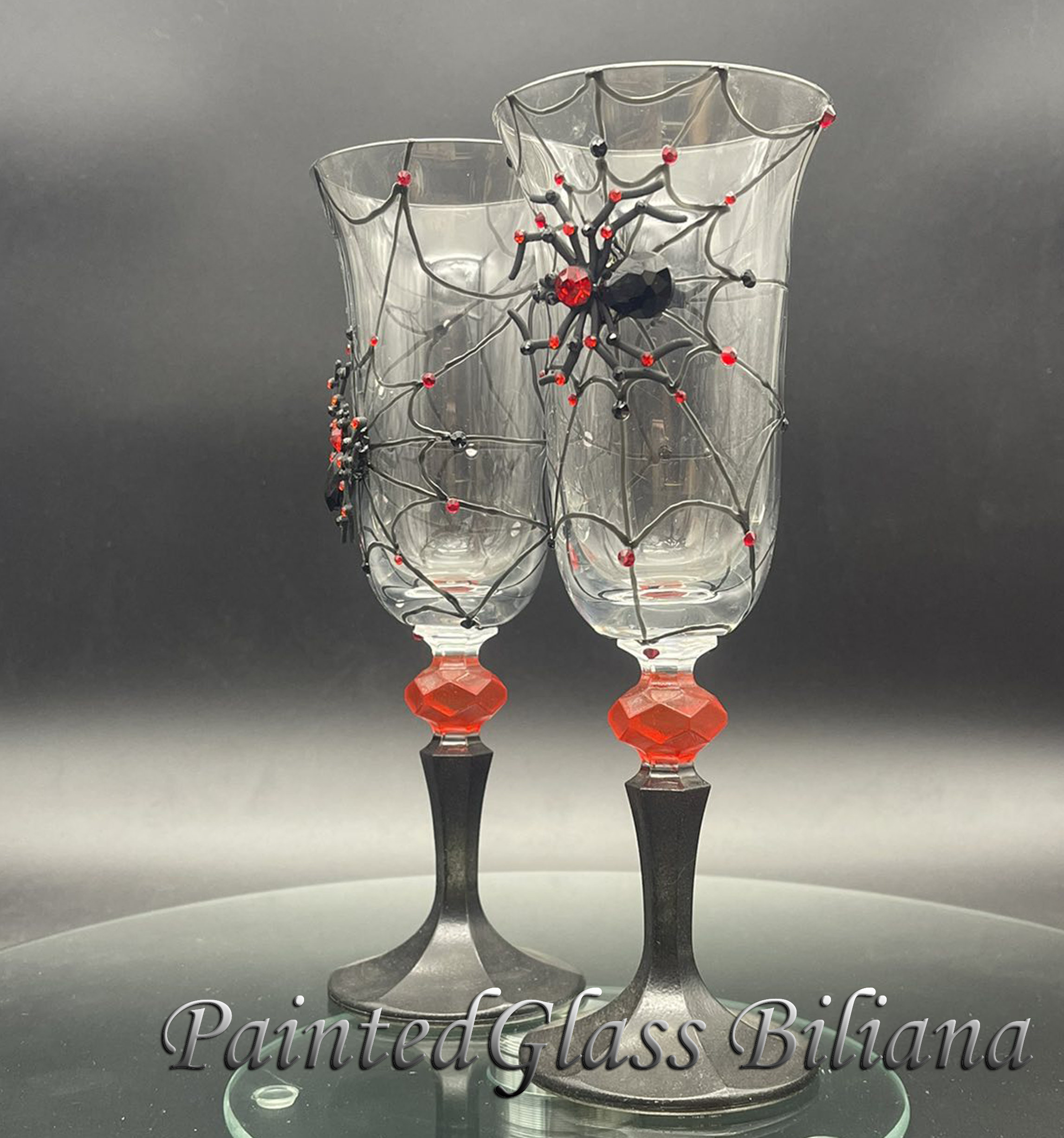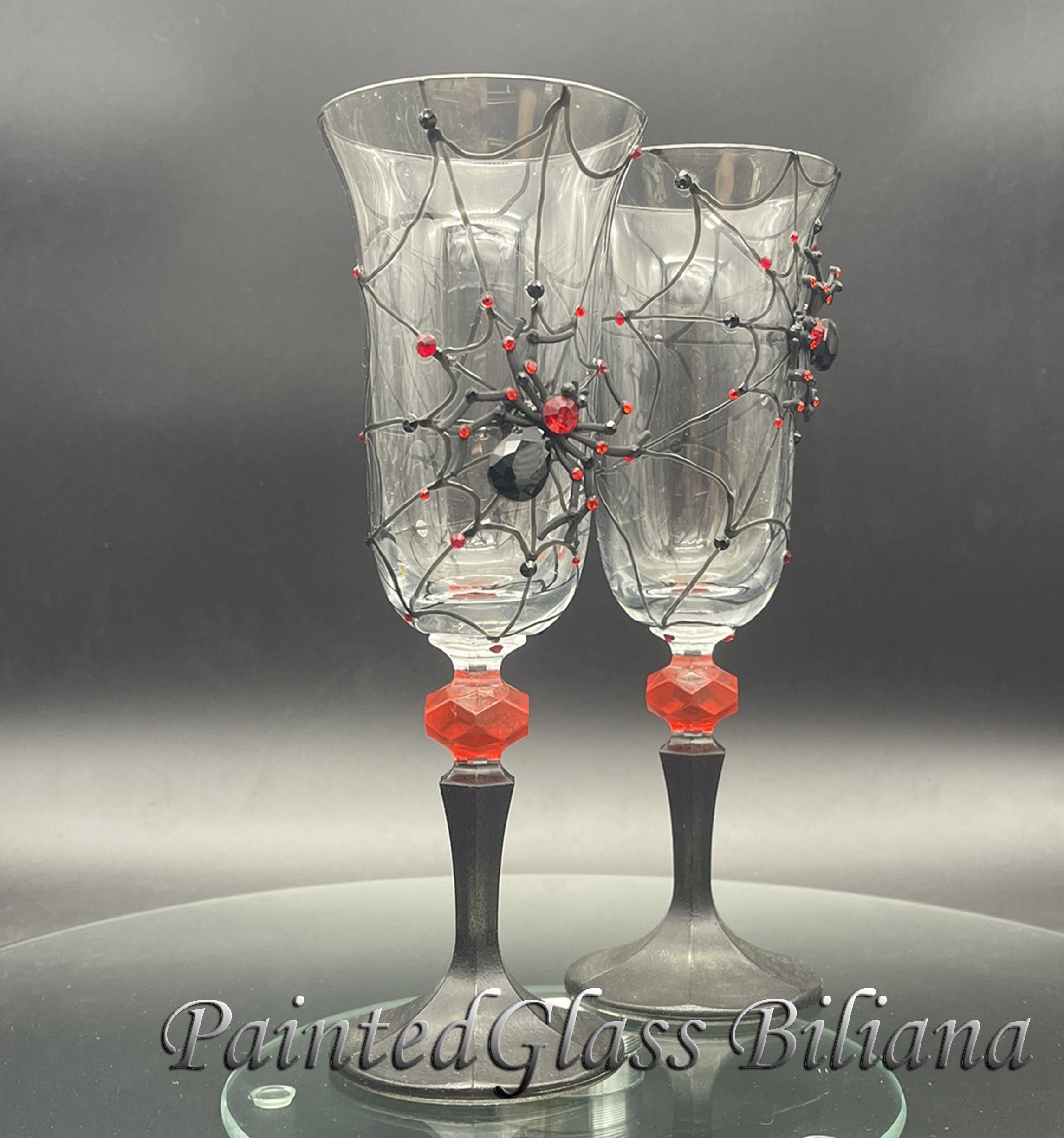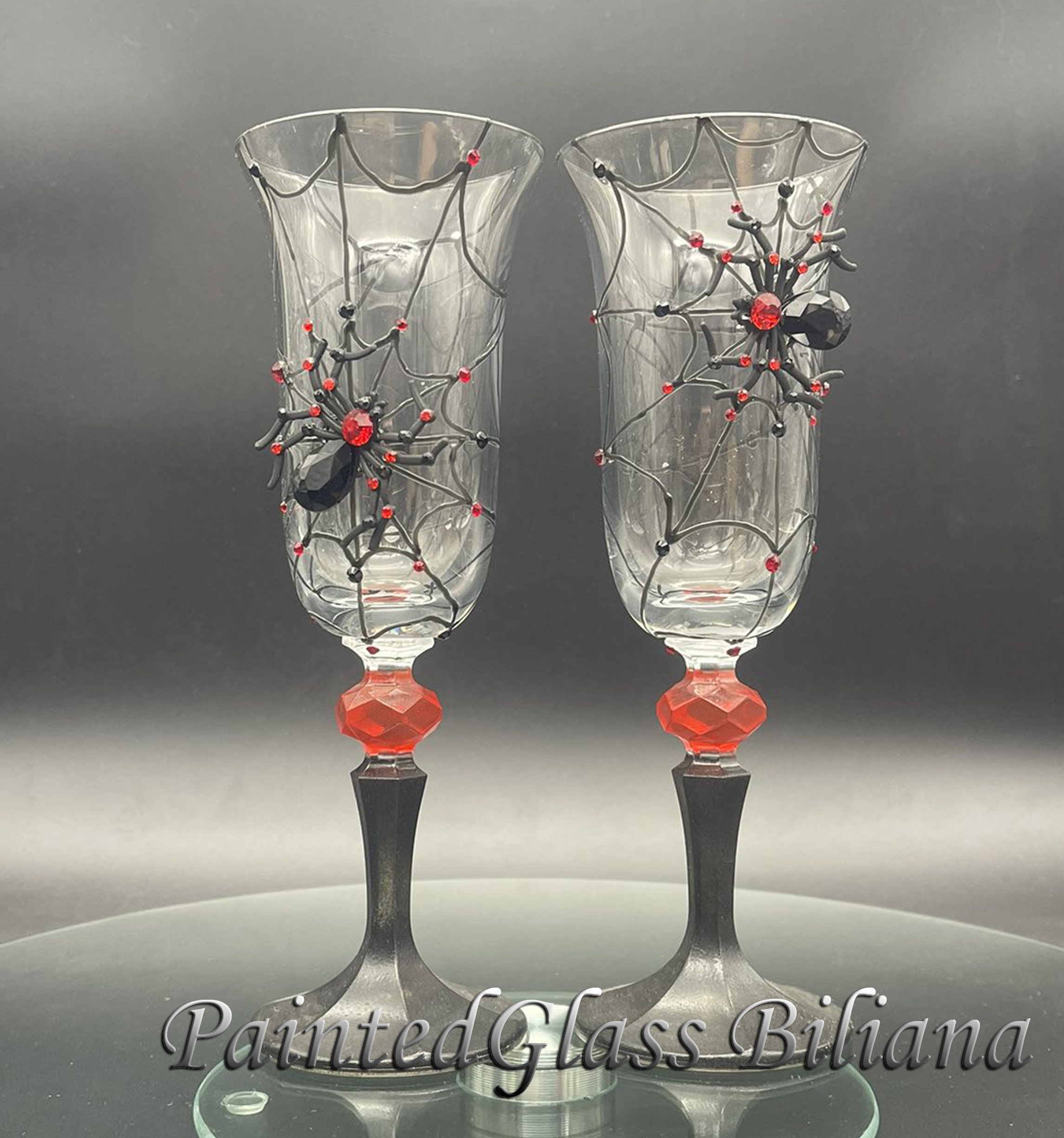 Hand painted champagne flues, decorated with crystals spider .