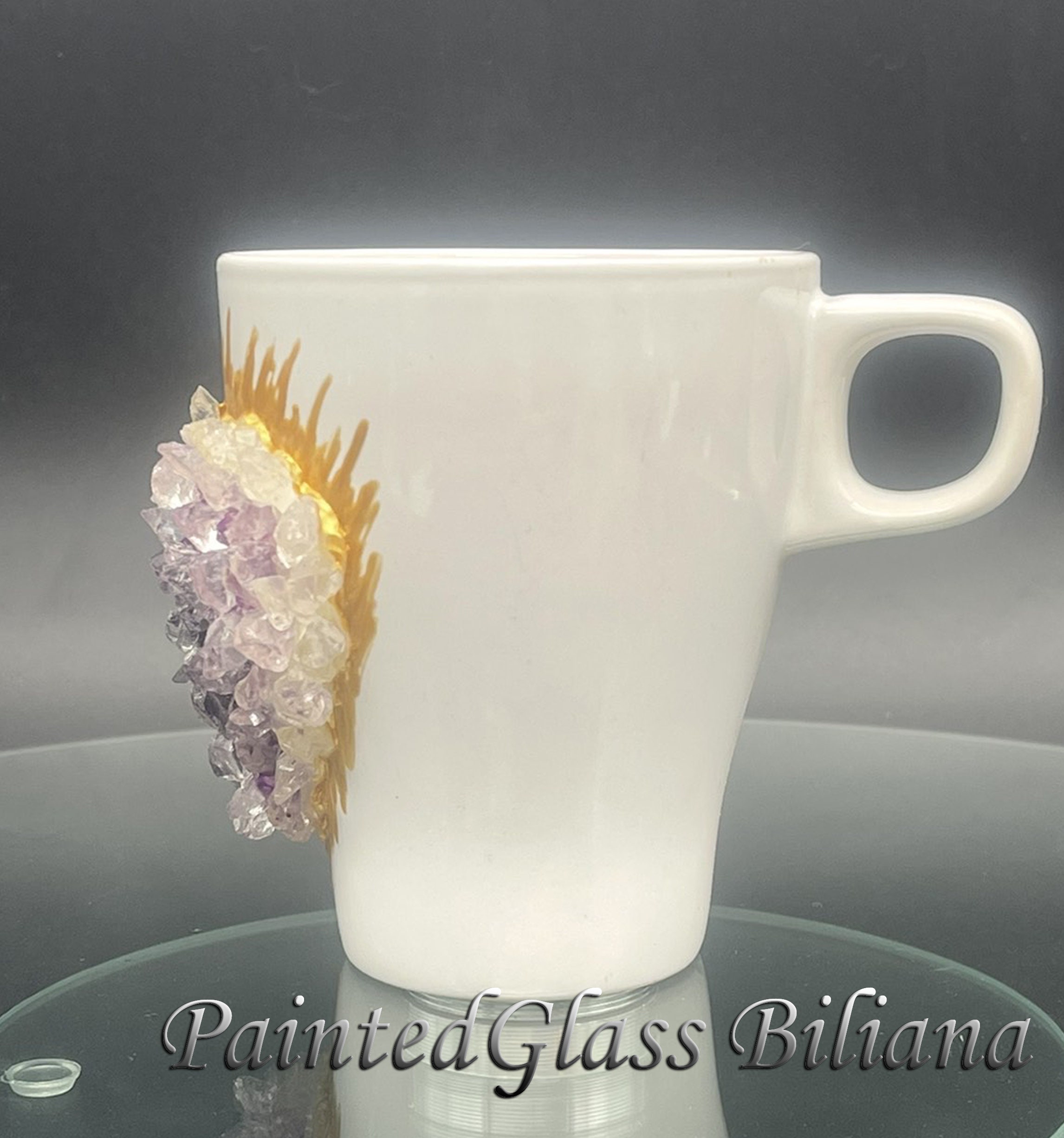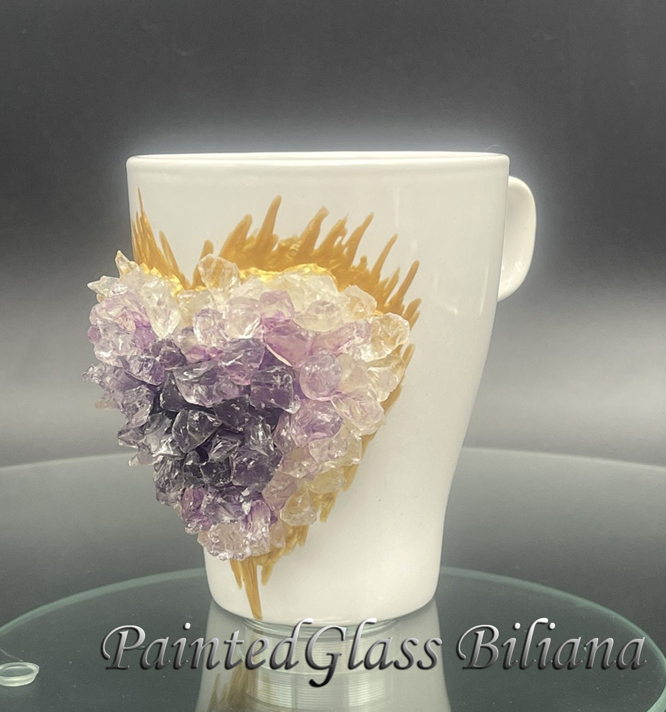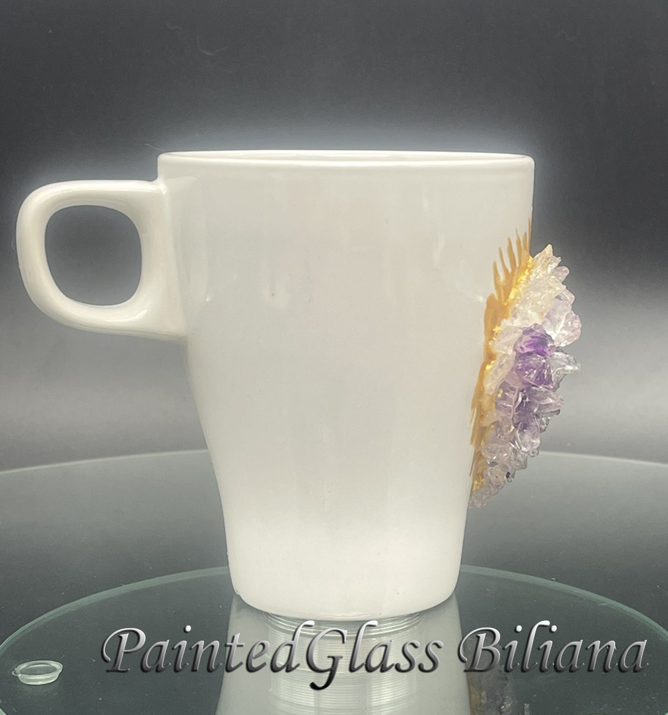 Beautiful amethyst purple coffee ceramic mug with heart geode design, decorated with crystals in amethyst color with gold accents.