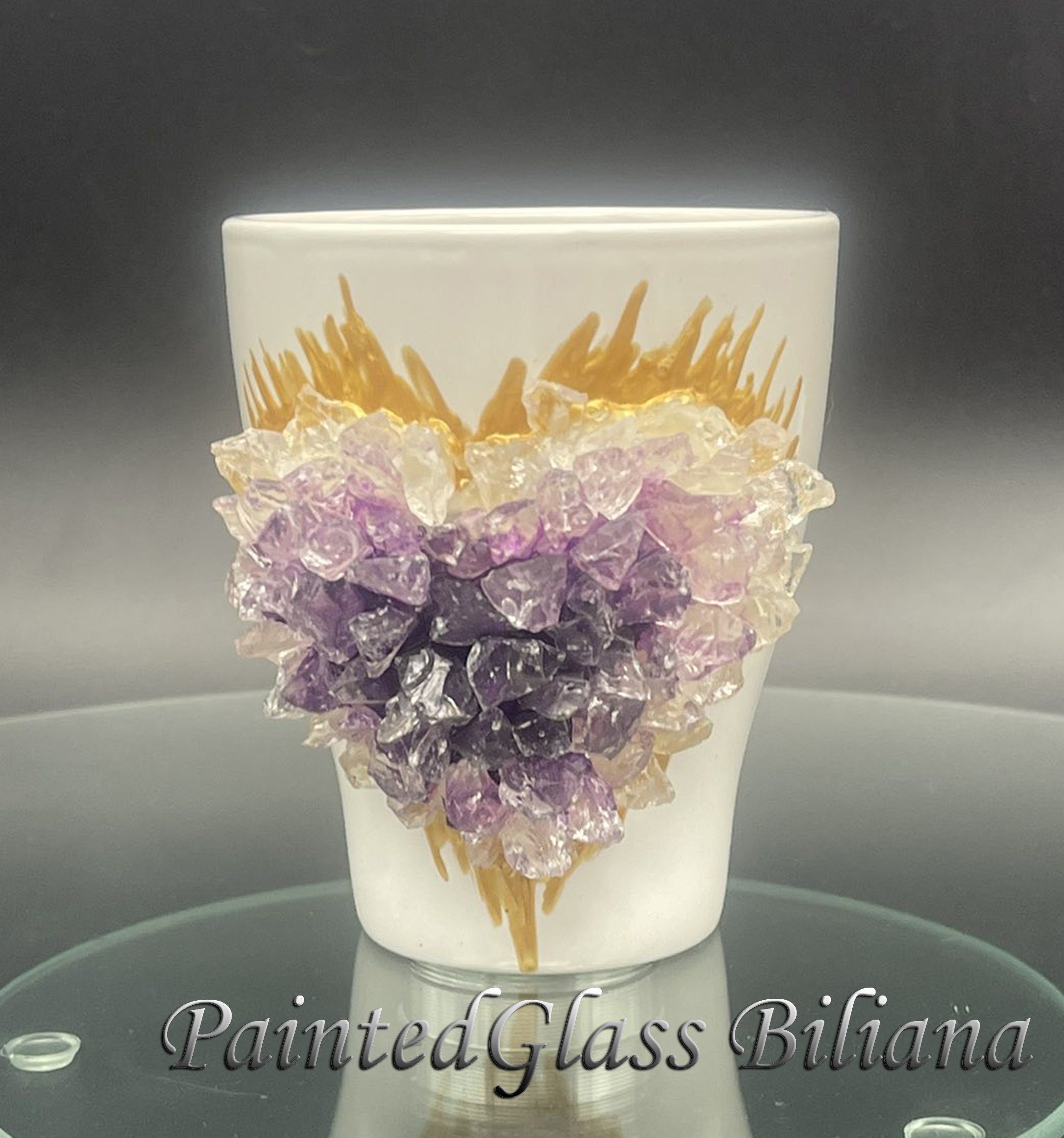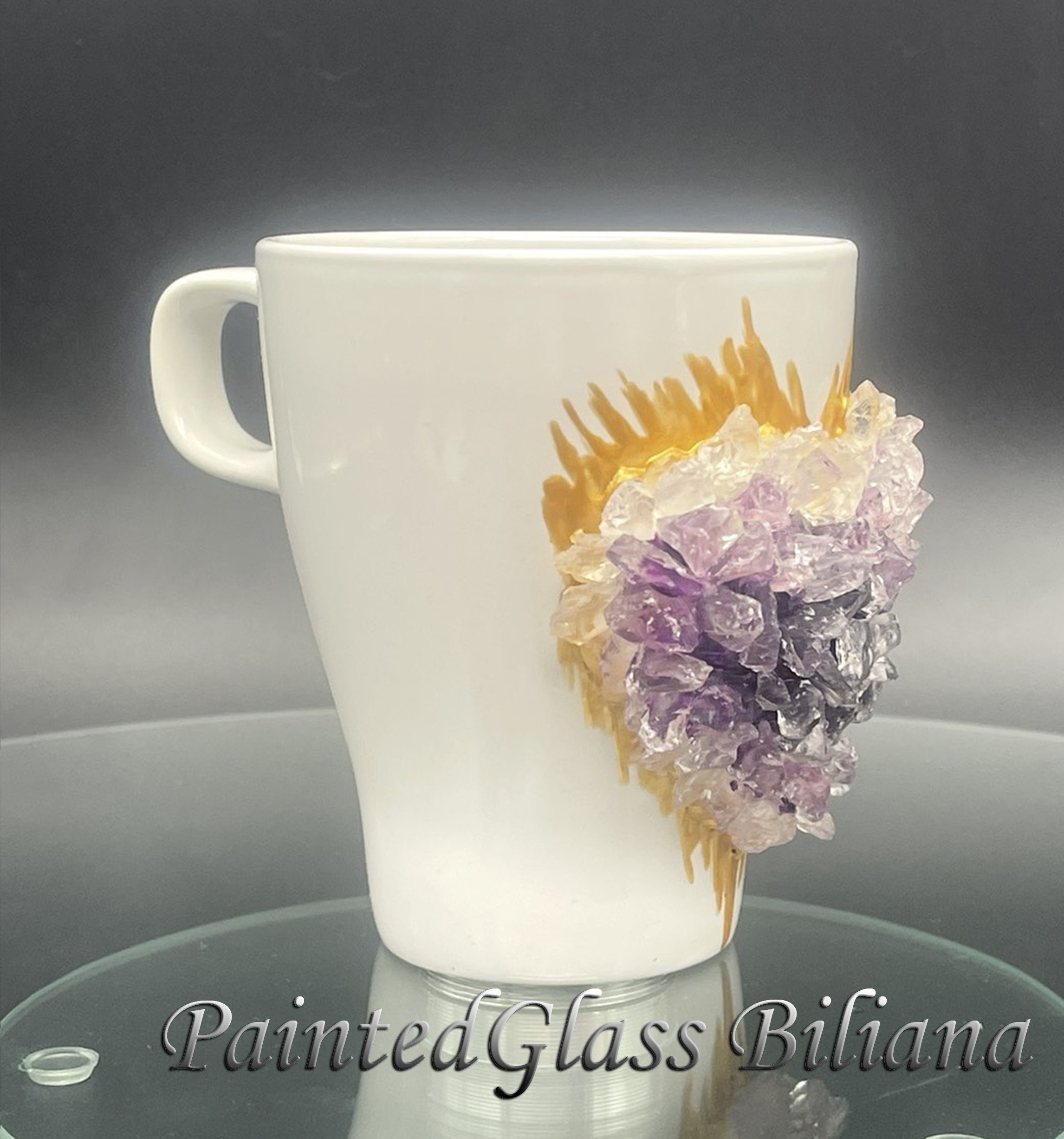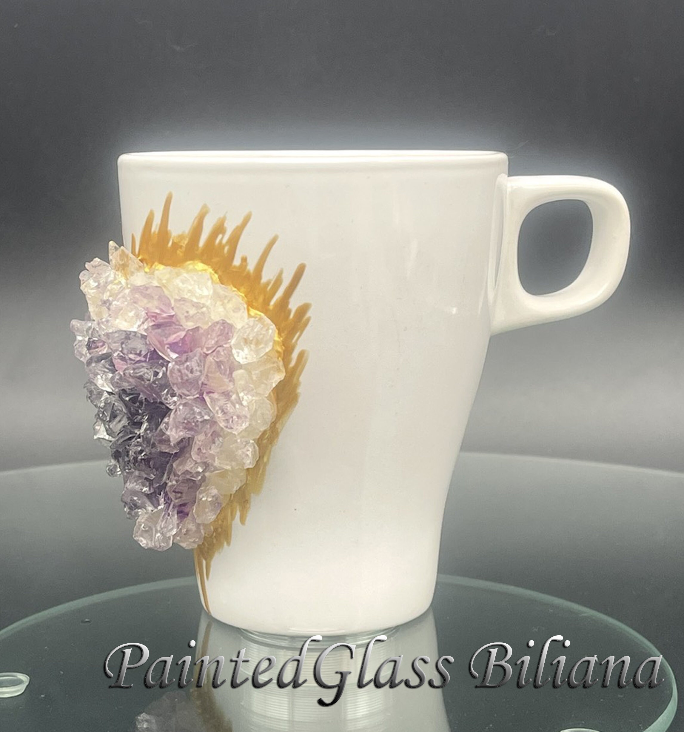 Beautiful amethyst purple coffee ceramic mug with heart geode design, decorated with crystals in amethyst color with gold accents.