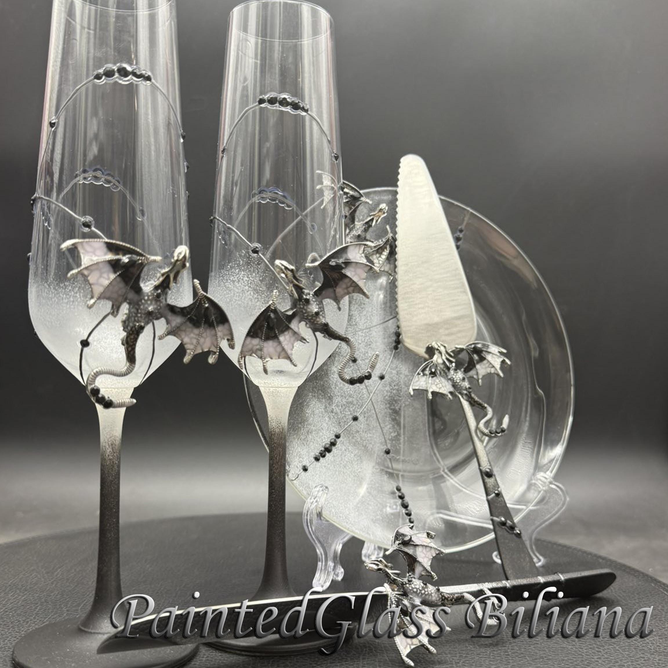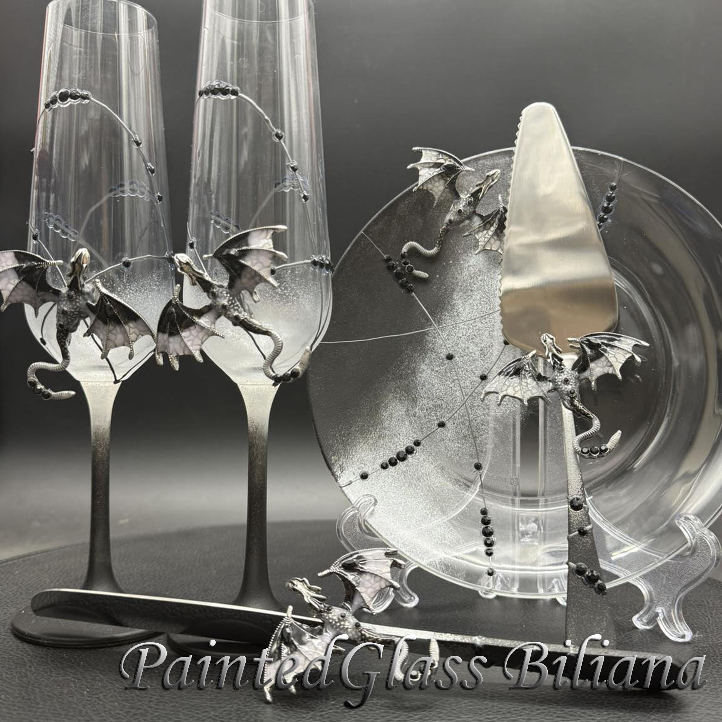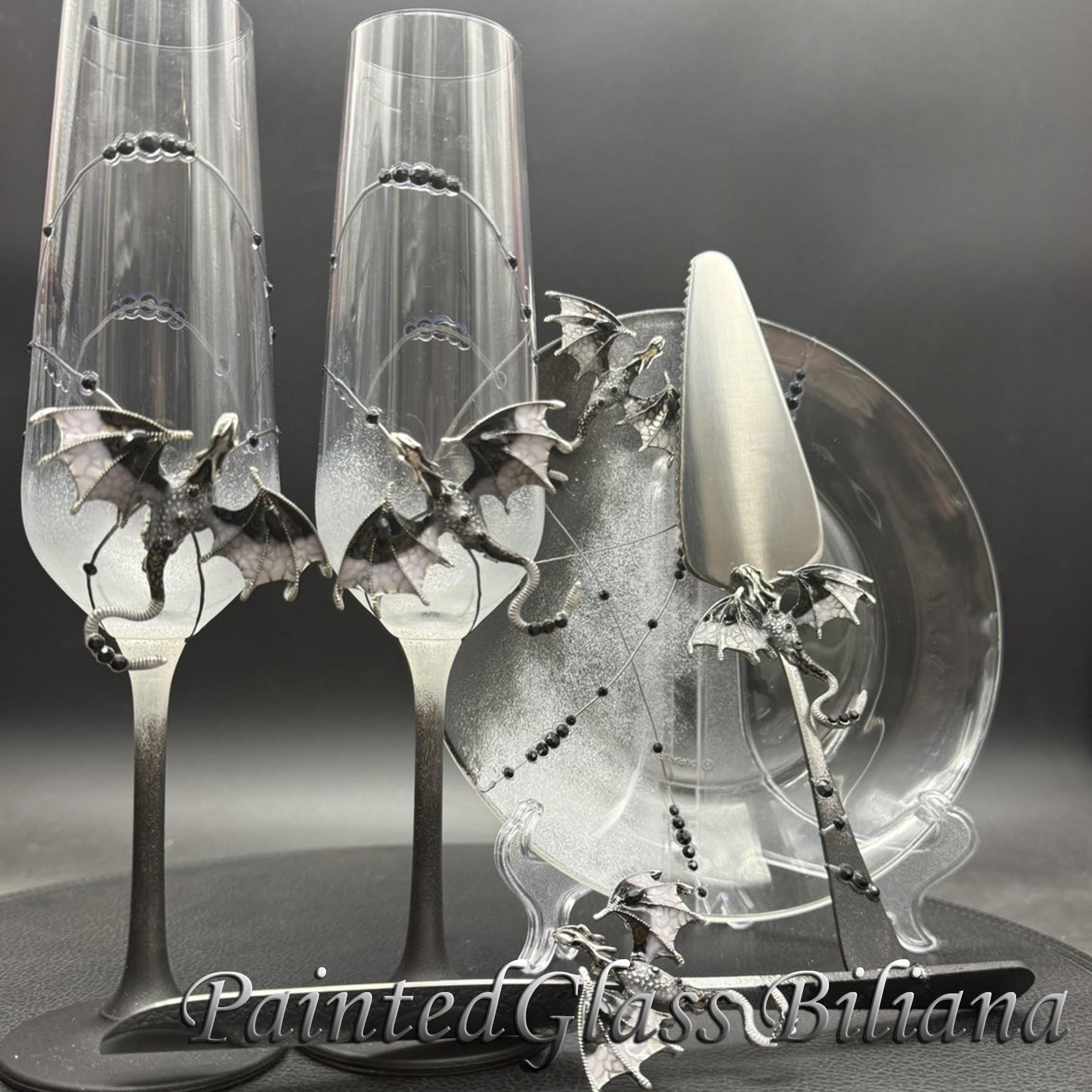 Set of 2 hand painted toasting champagne flutes with black color dragons and red crystals