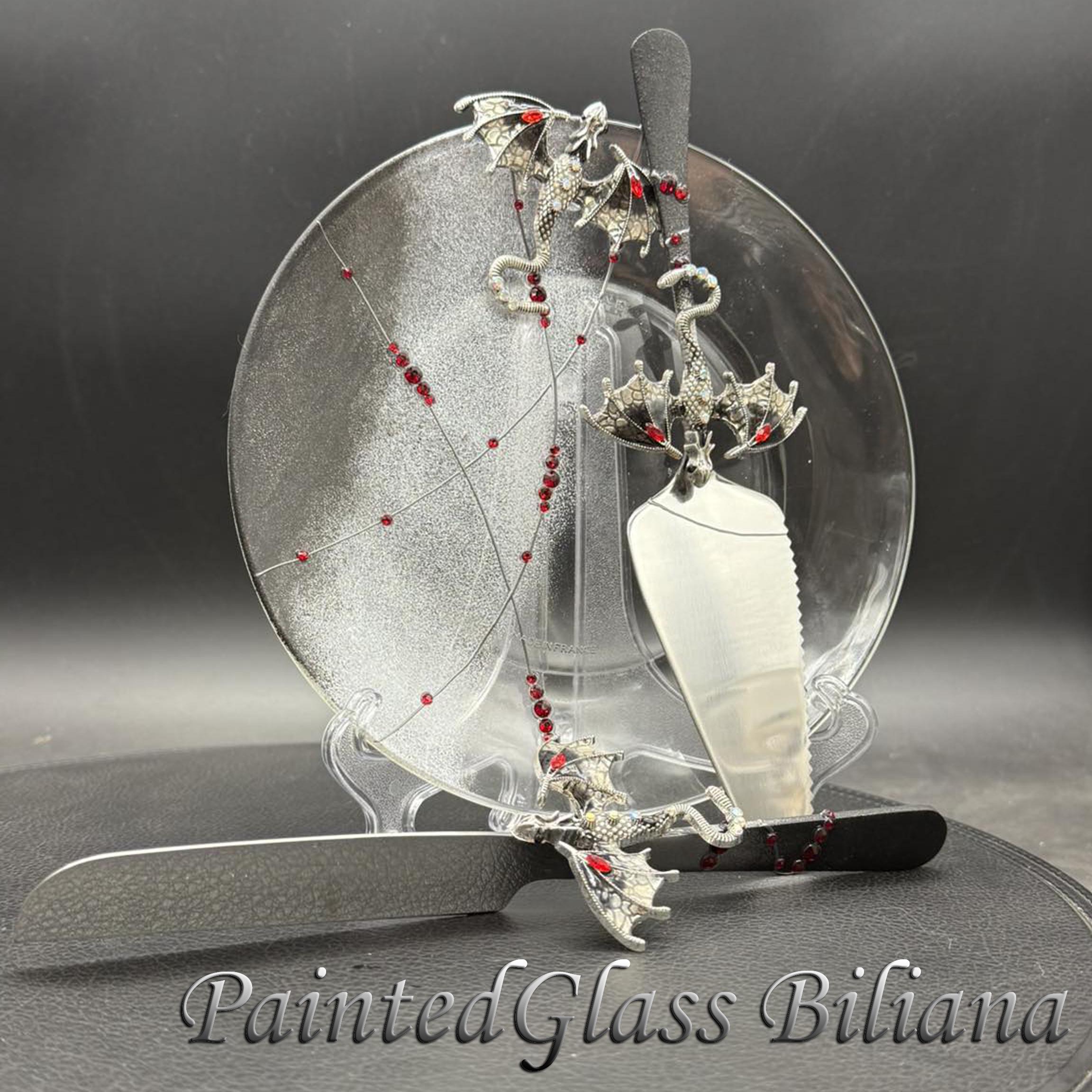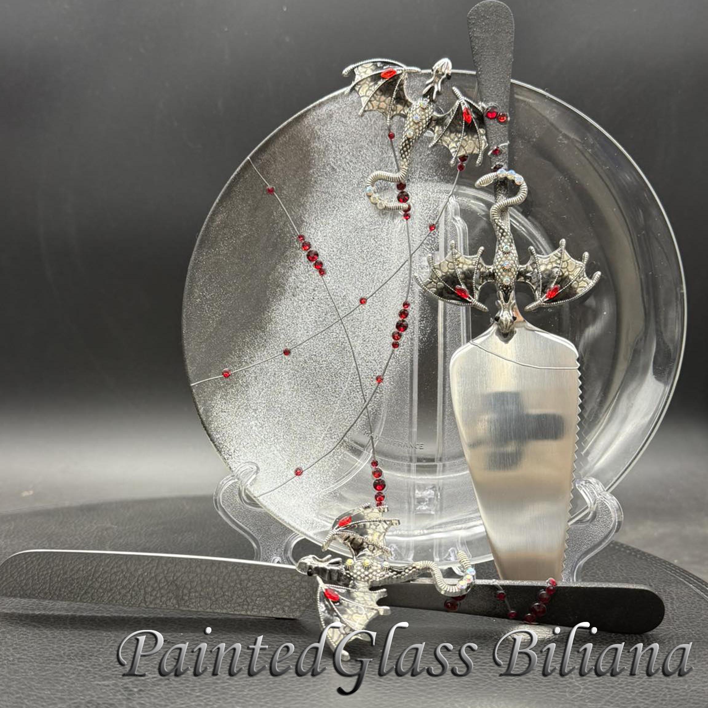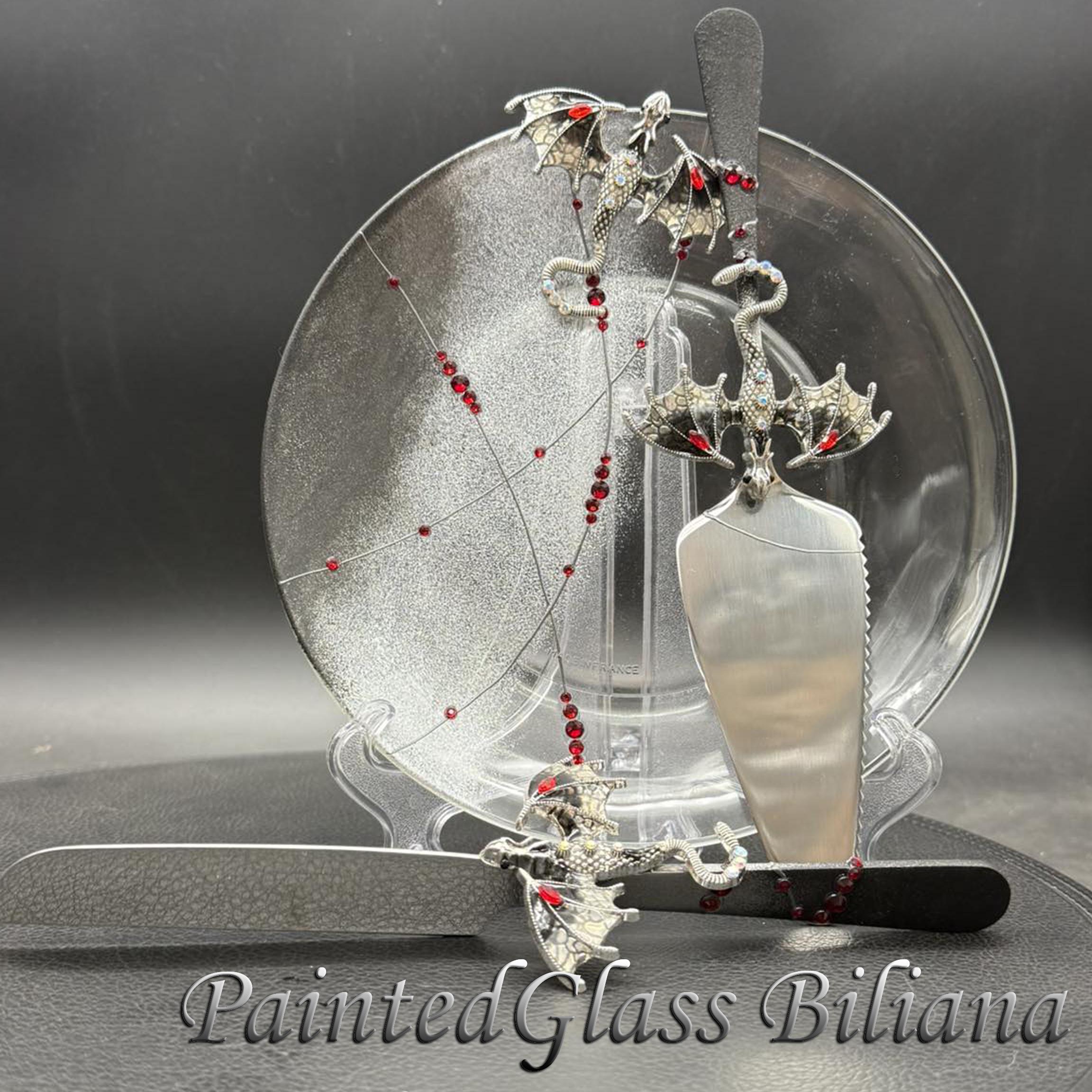 Set of 2 hand painted cake serving sets with silver & black color dragons and red crystals