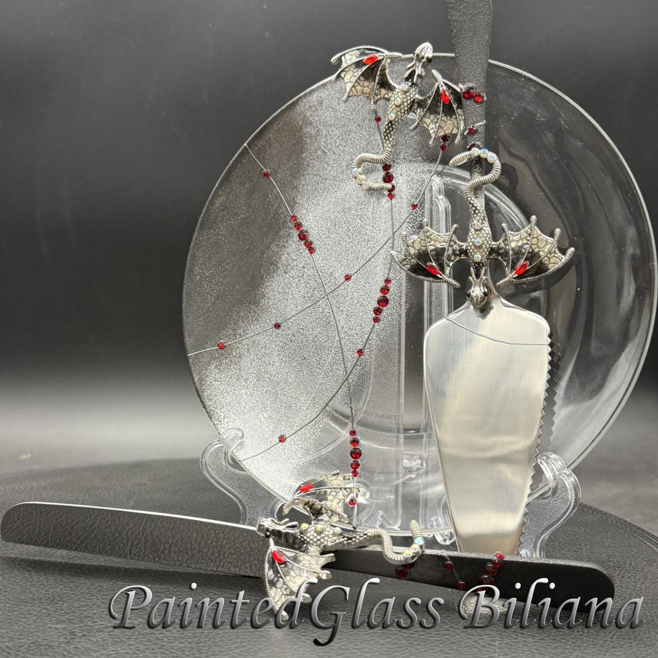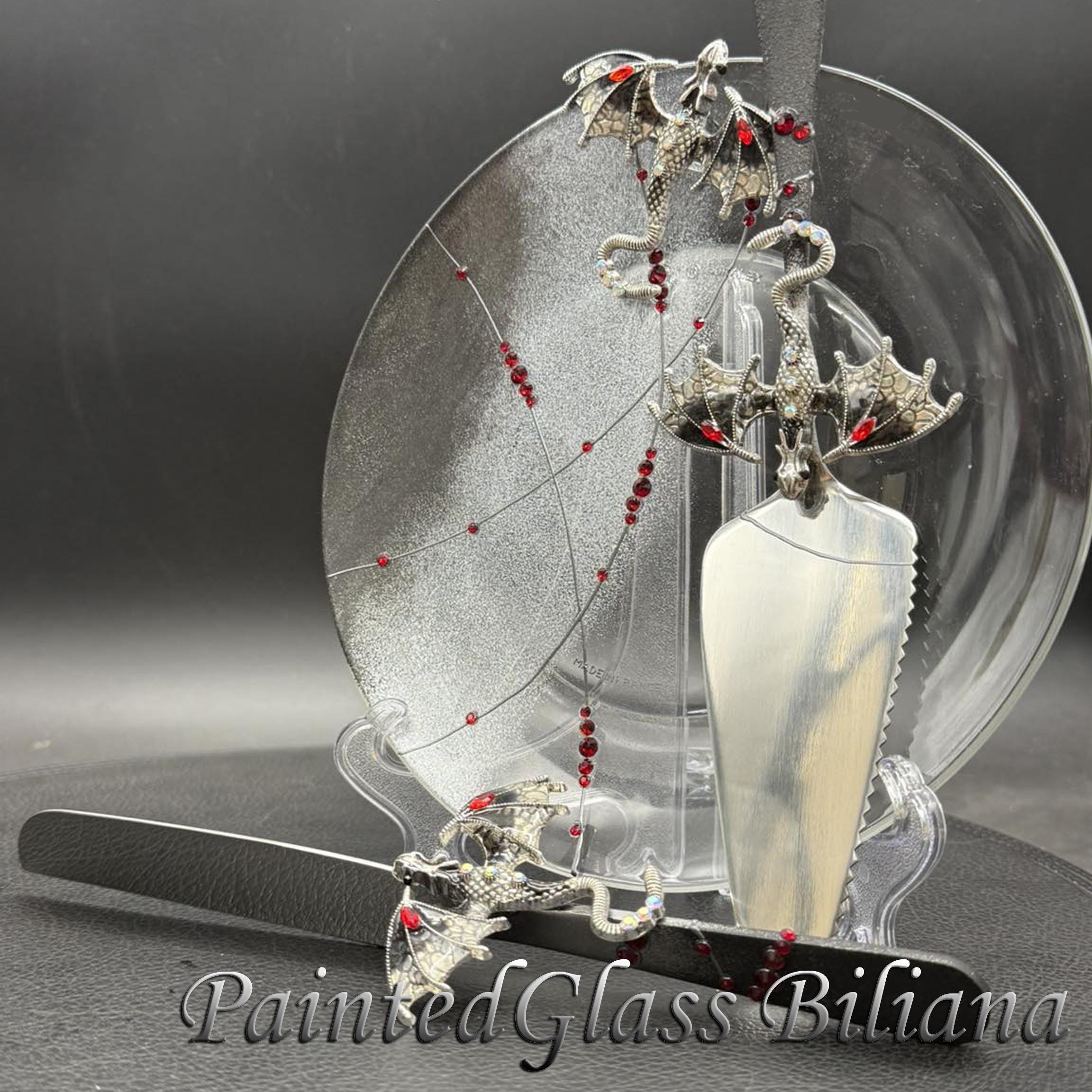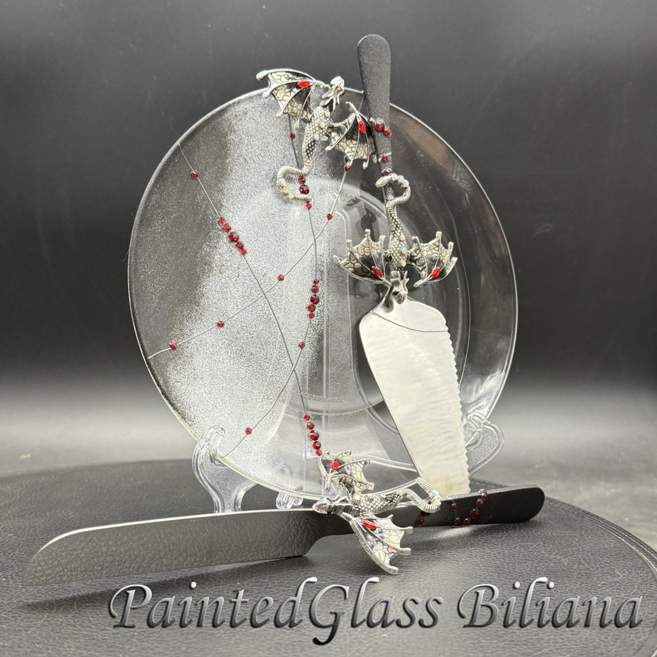 Set of 2 hand painted cake serving sets with silver & black color dragons and red crystals