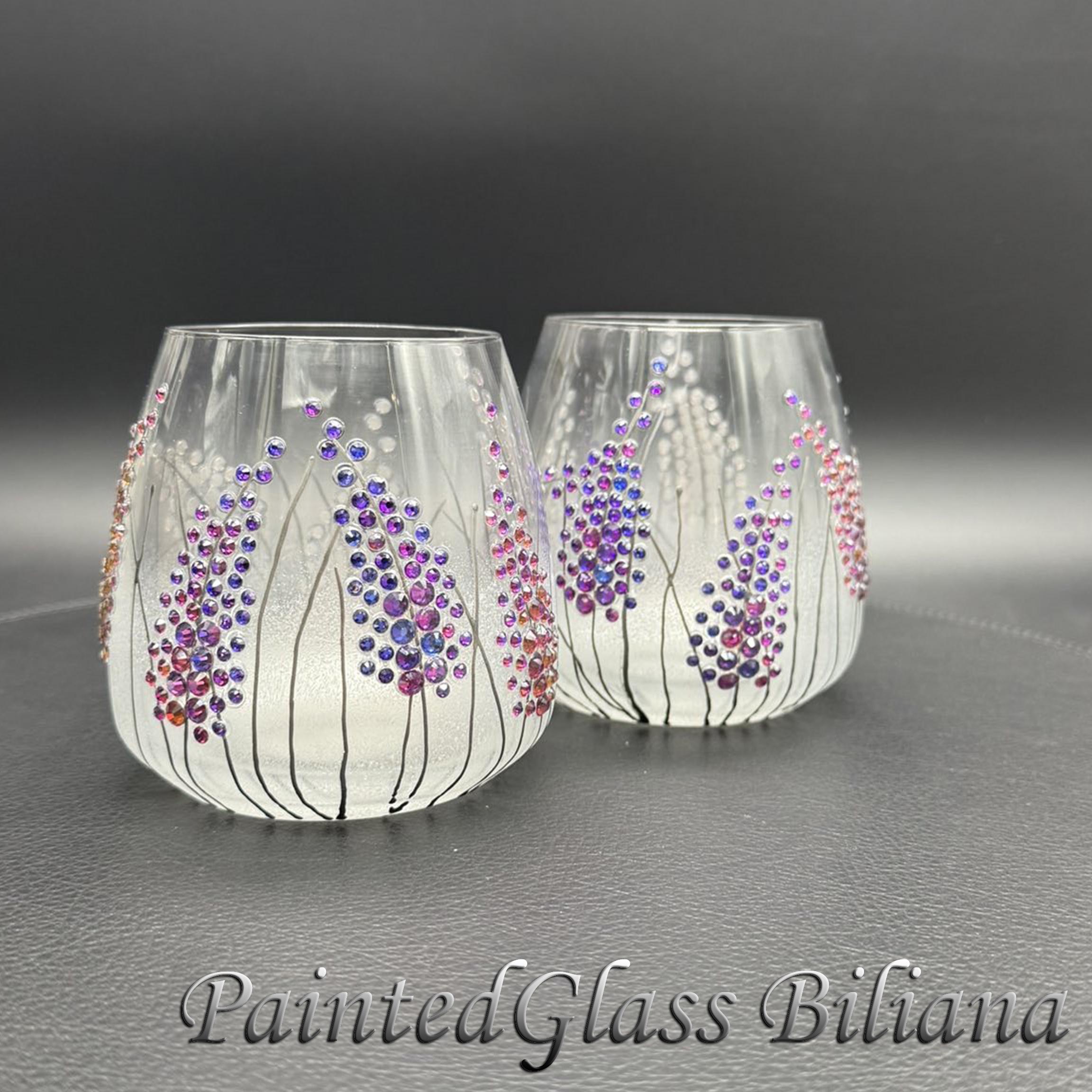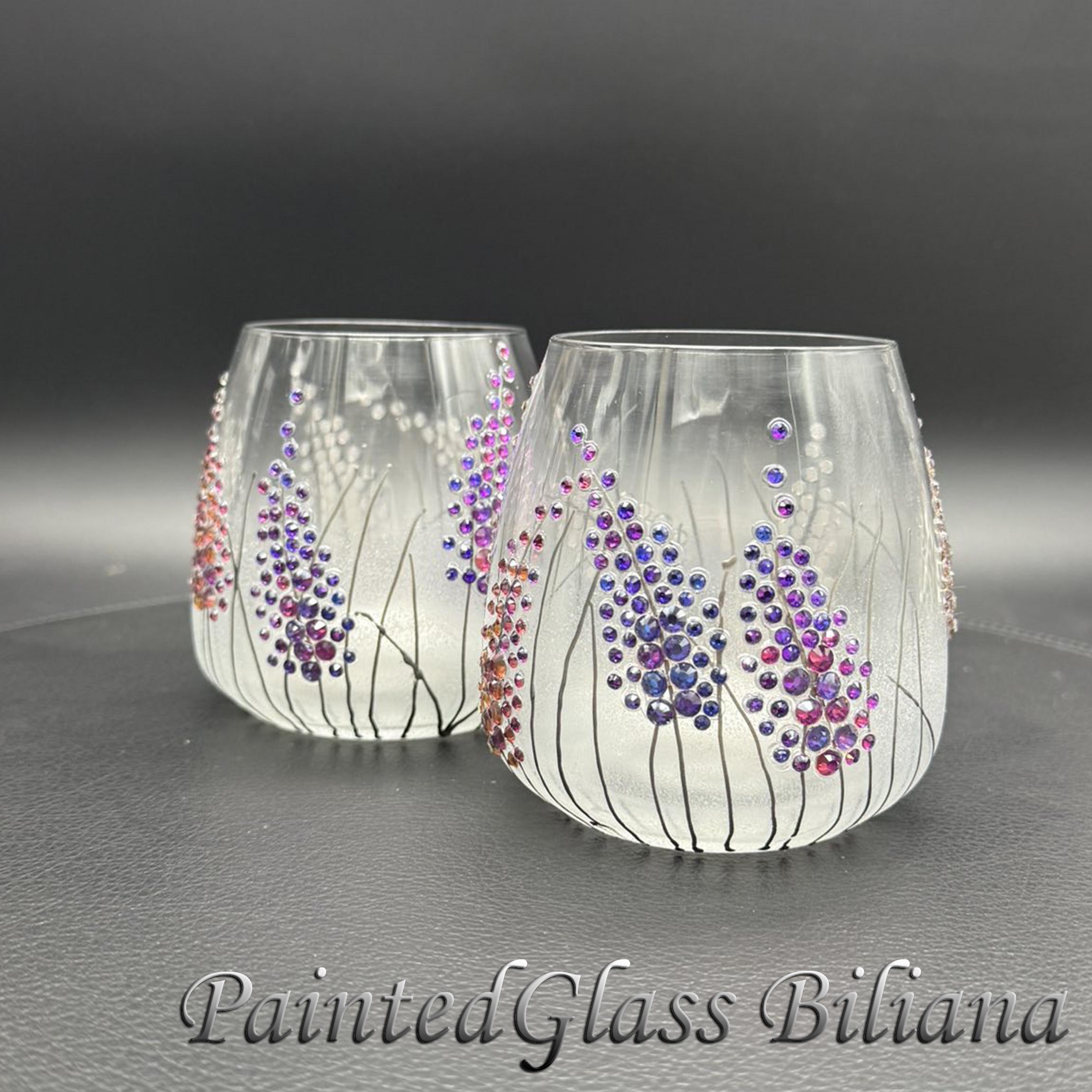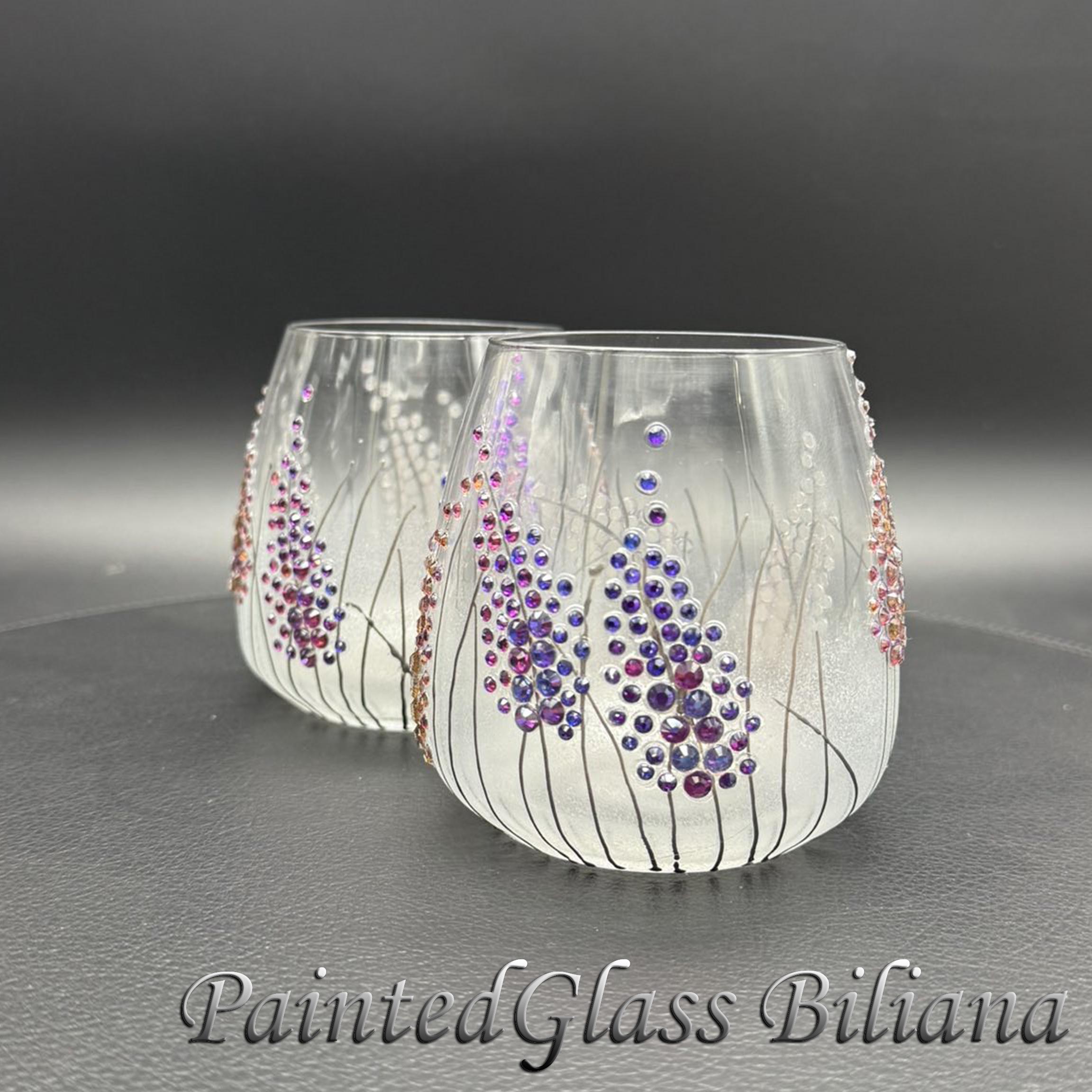 Set of 2 hand painted toasting stemless wine whiskey glasses with delicate purple crystals lavender haze