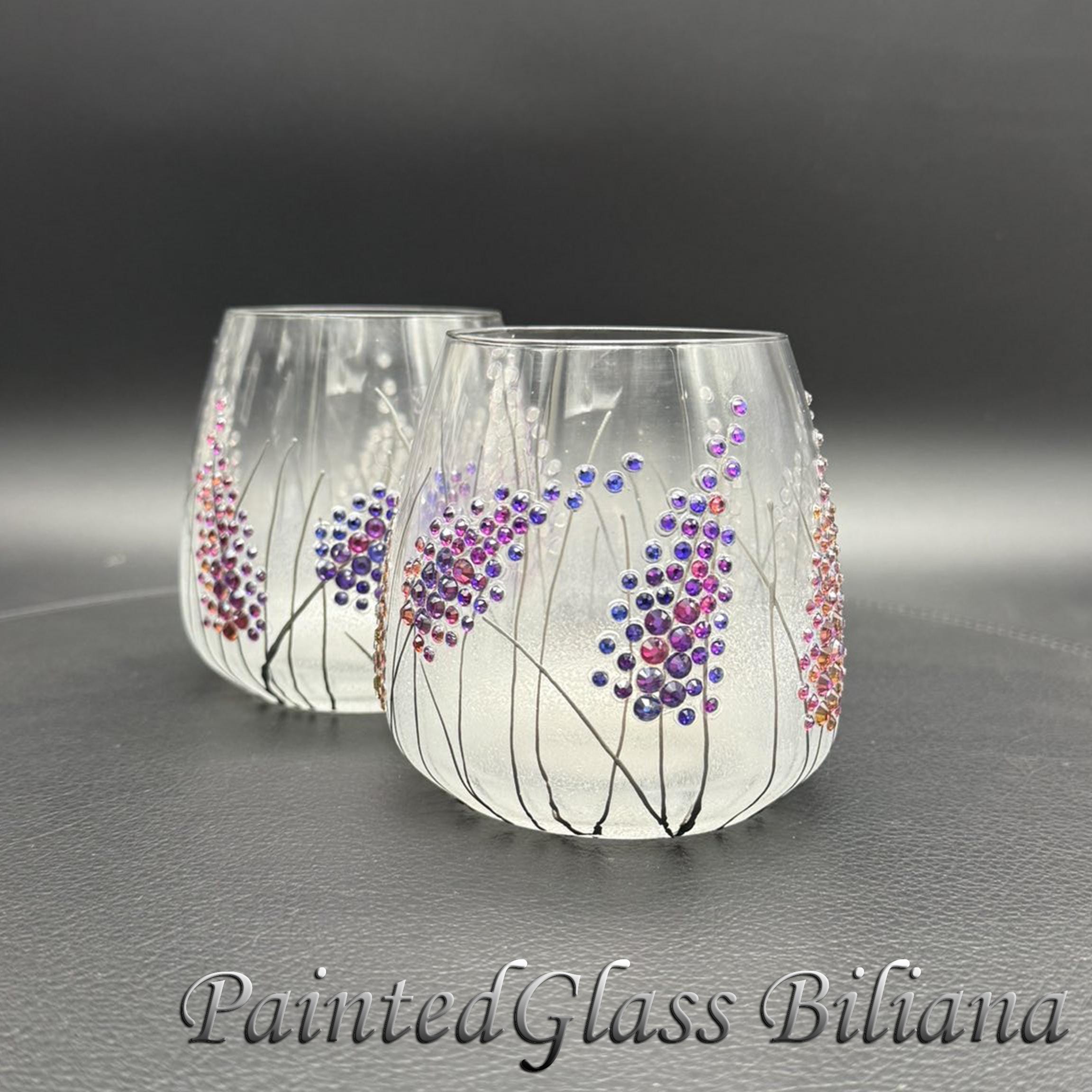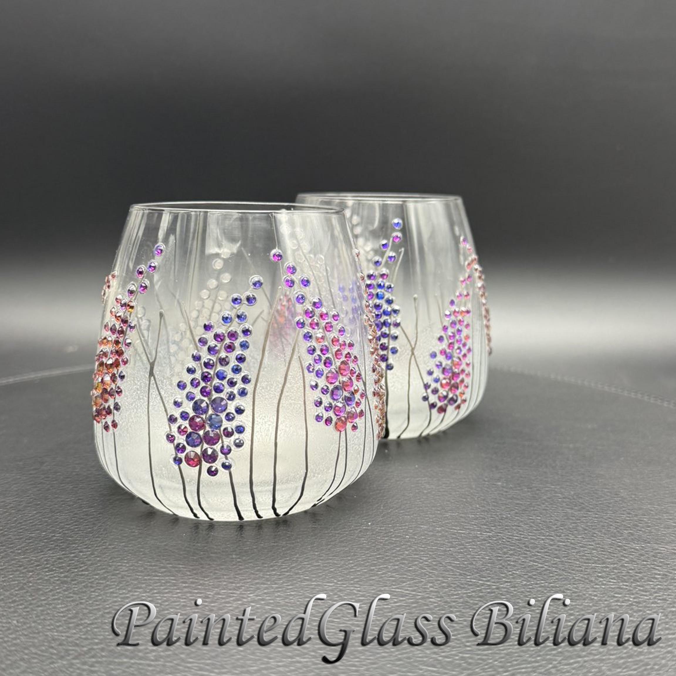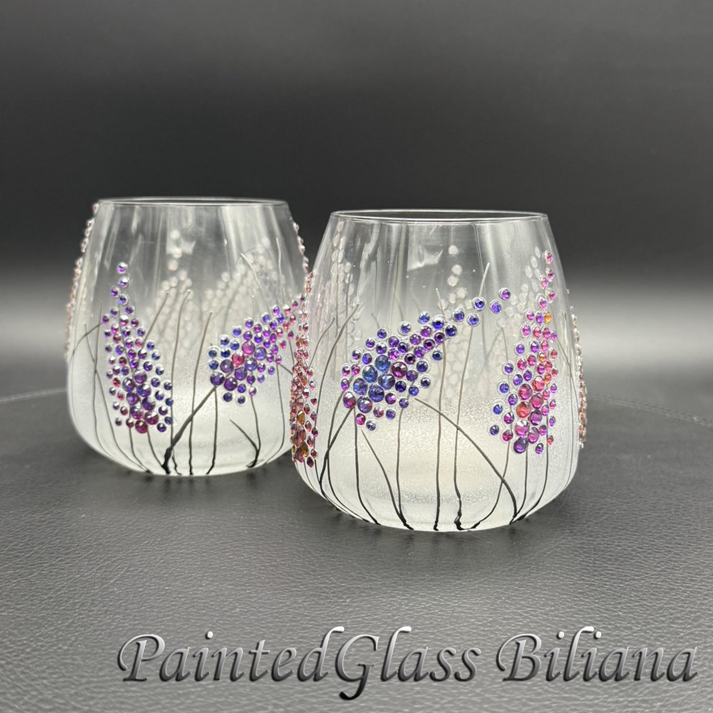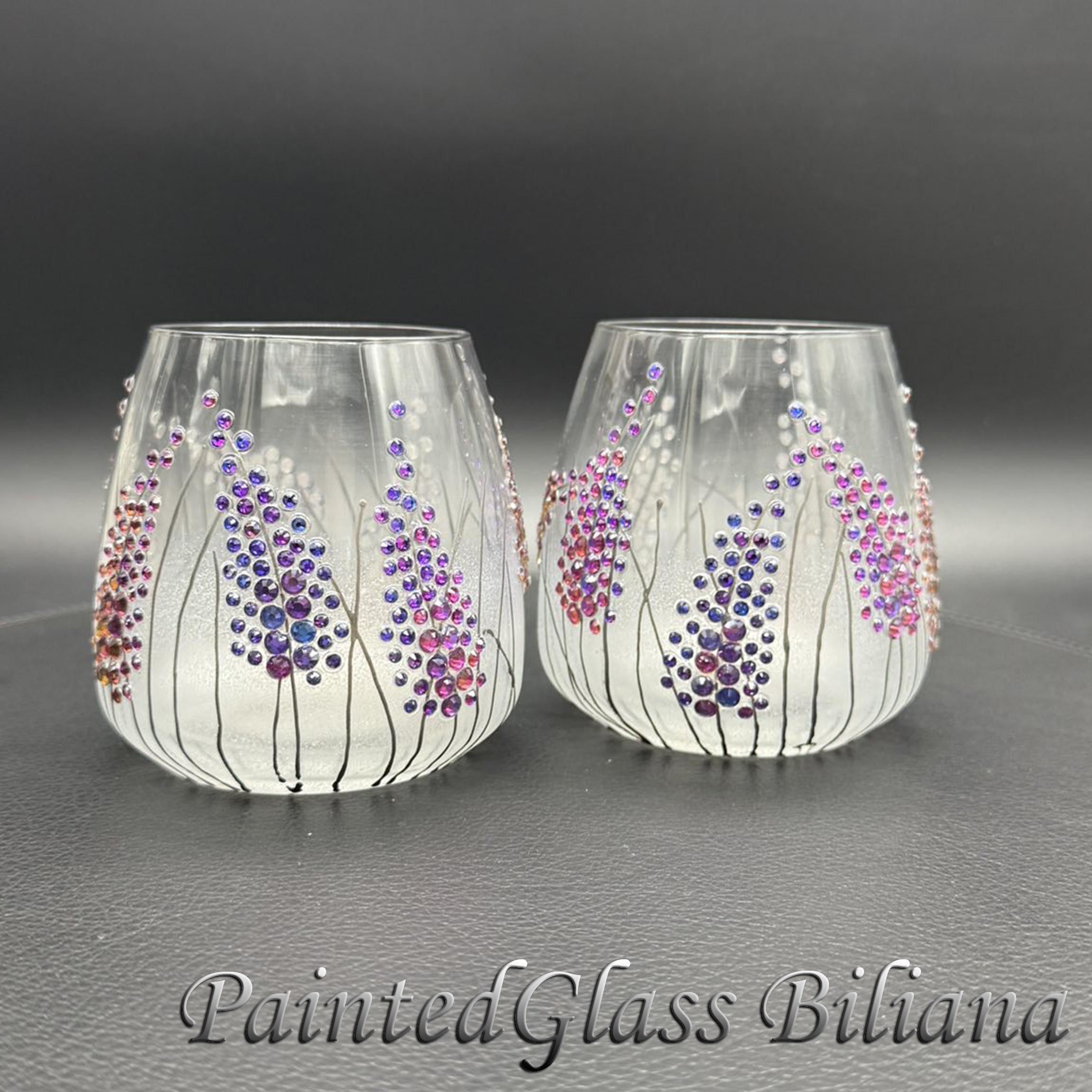 Set of 2 hand painted toasting stemless wine whiskey glasses with delicate purple crystals lavender haze