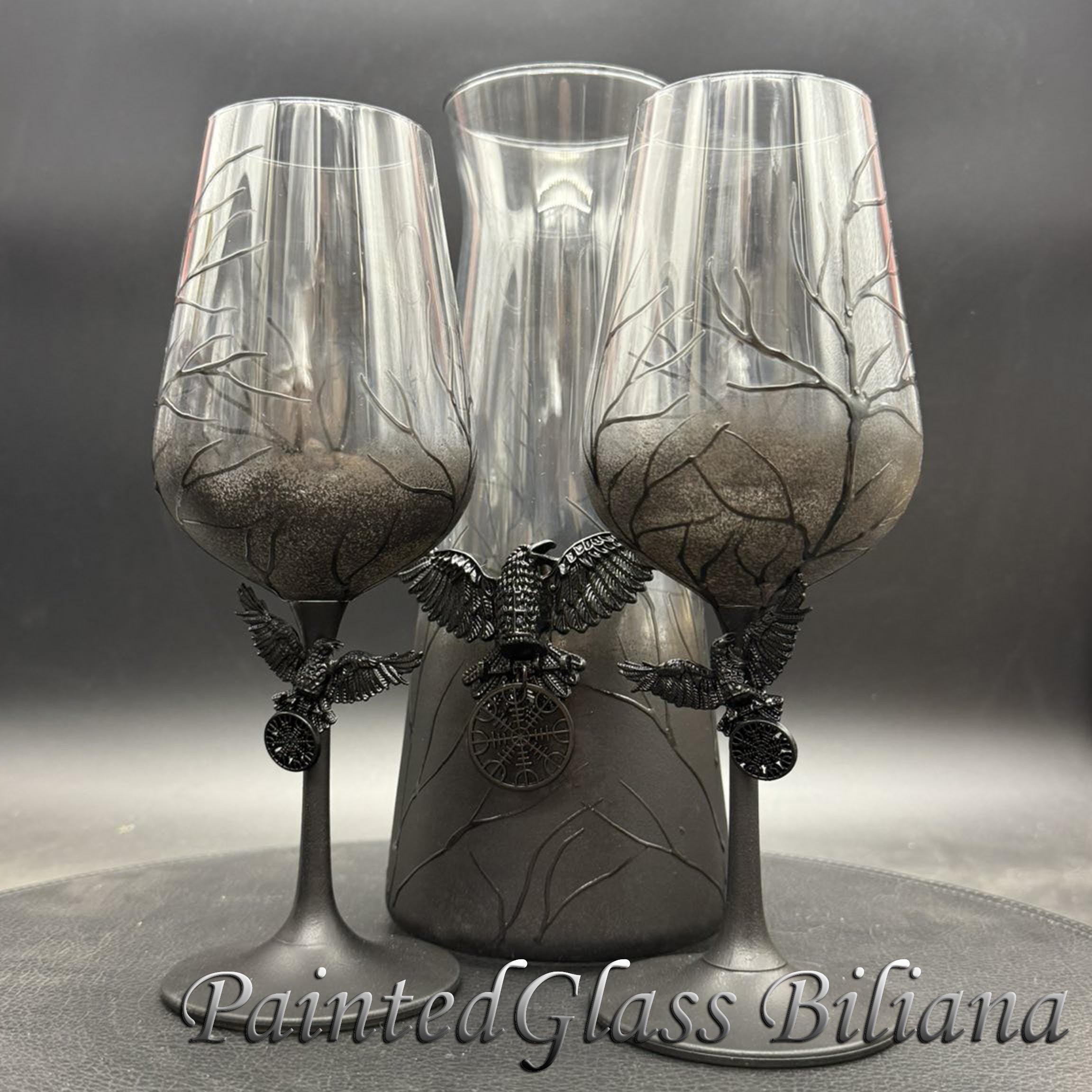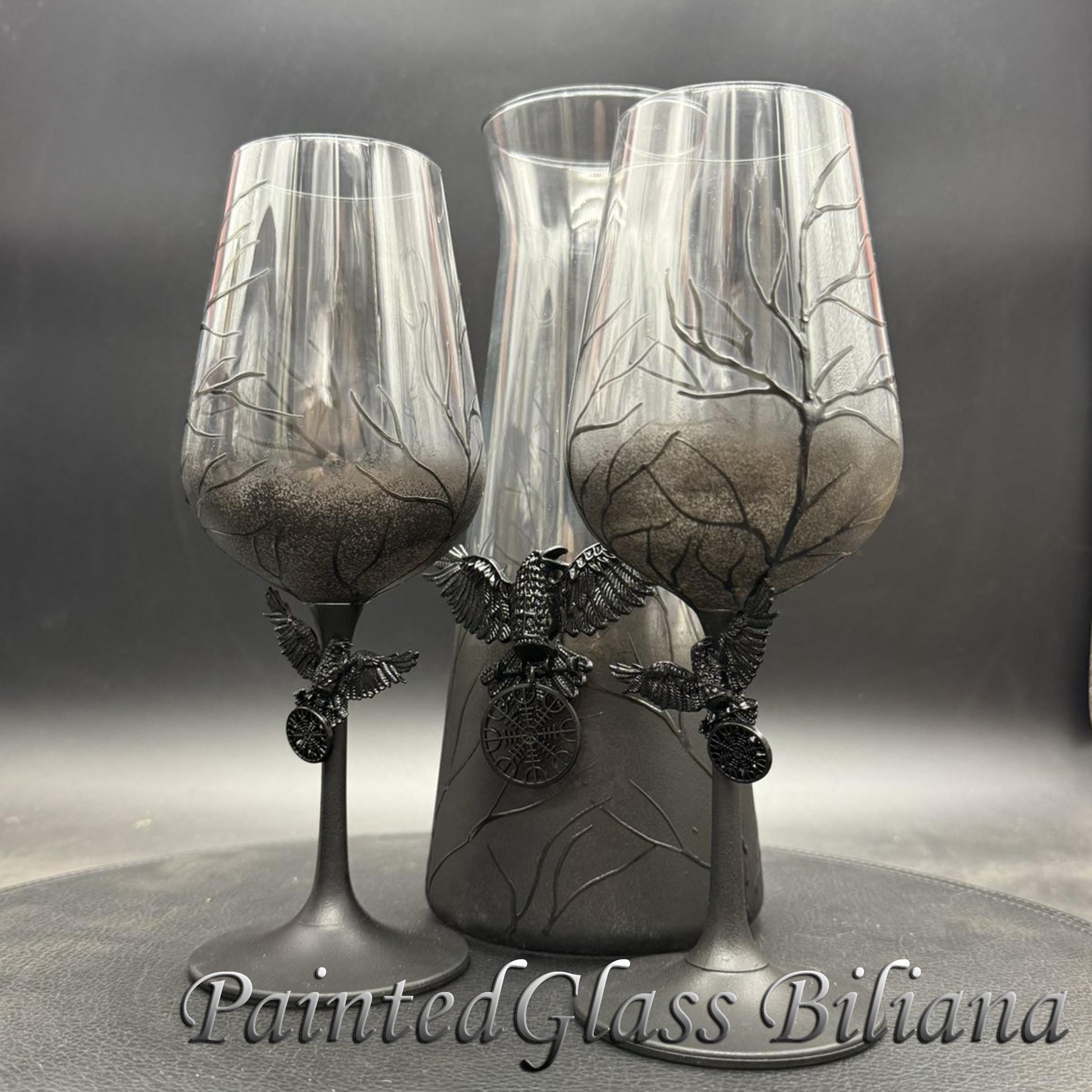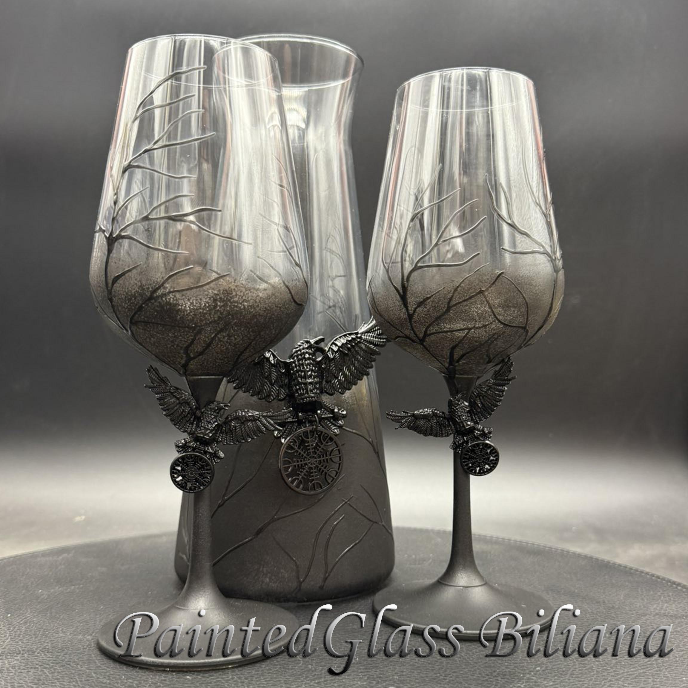 Hand painted wine glasses, decorated with black ravens, set of 2.