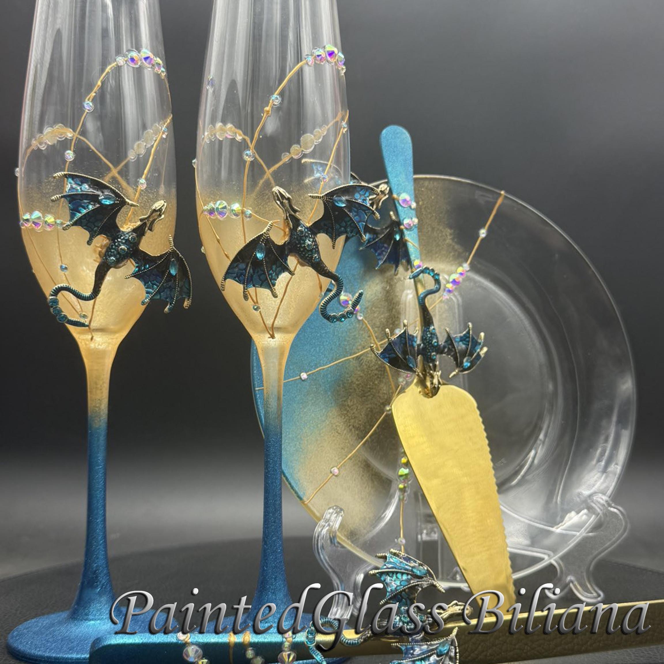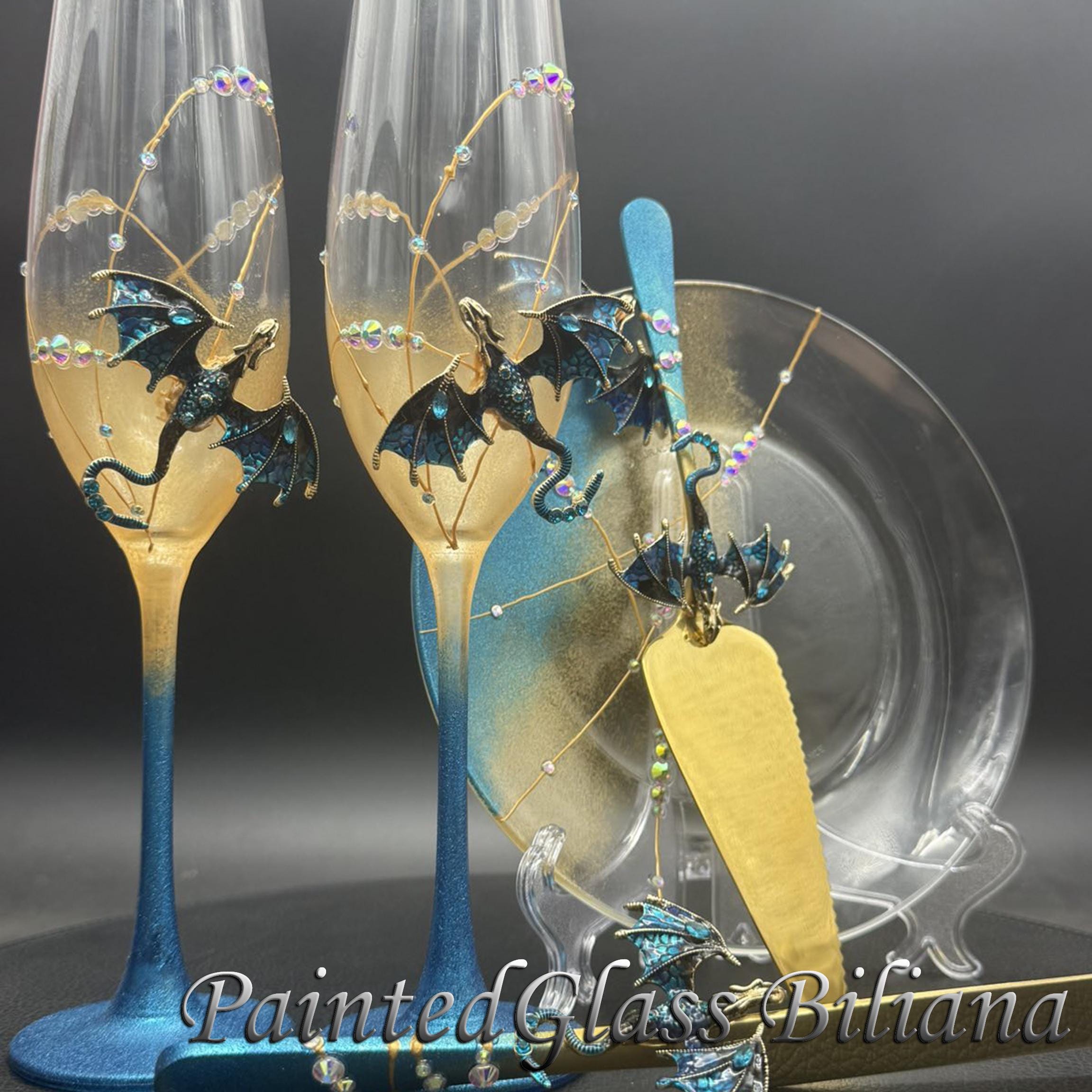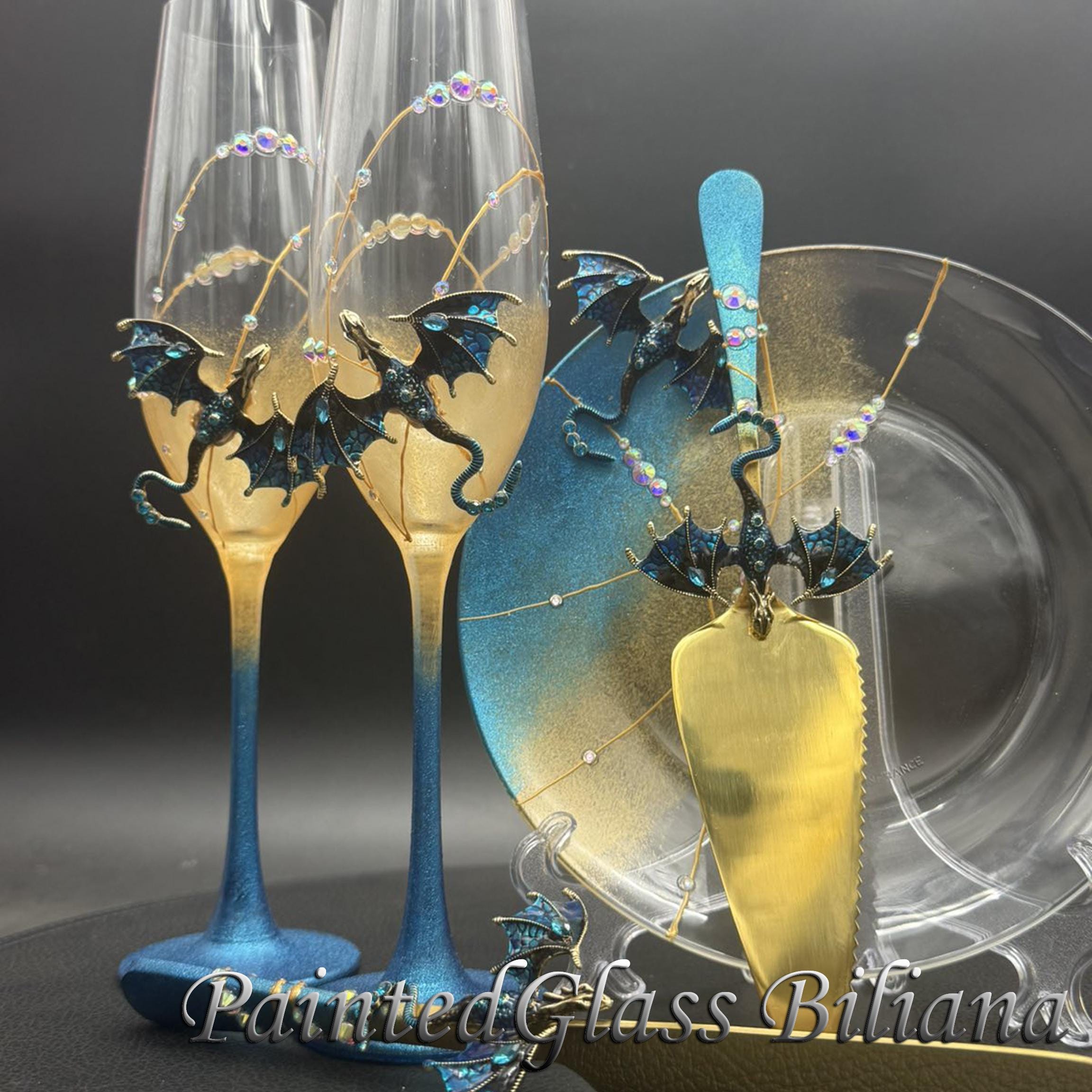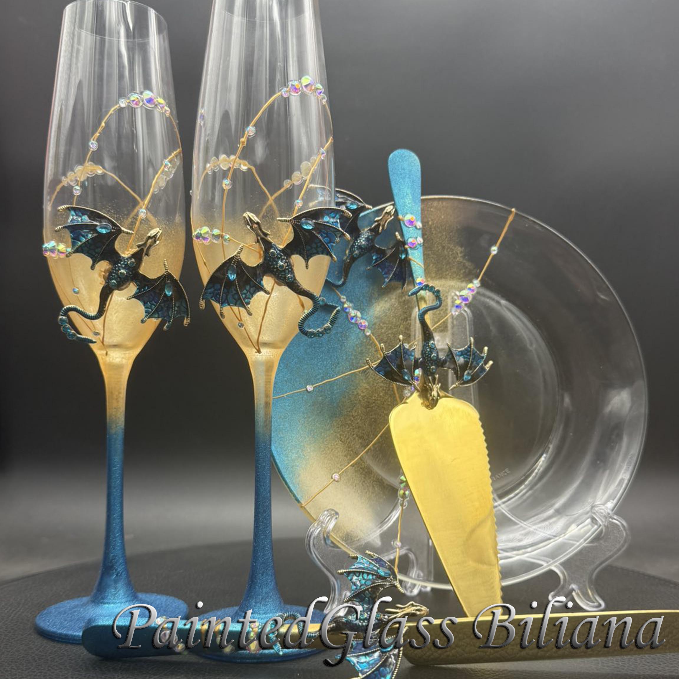 Set of 2 hand painted toasting champagne flutes with blue color dragons and crystals