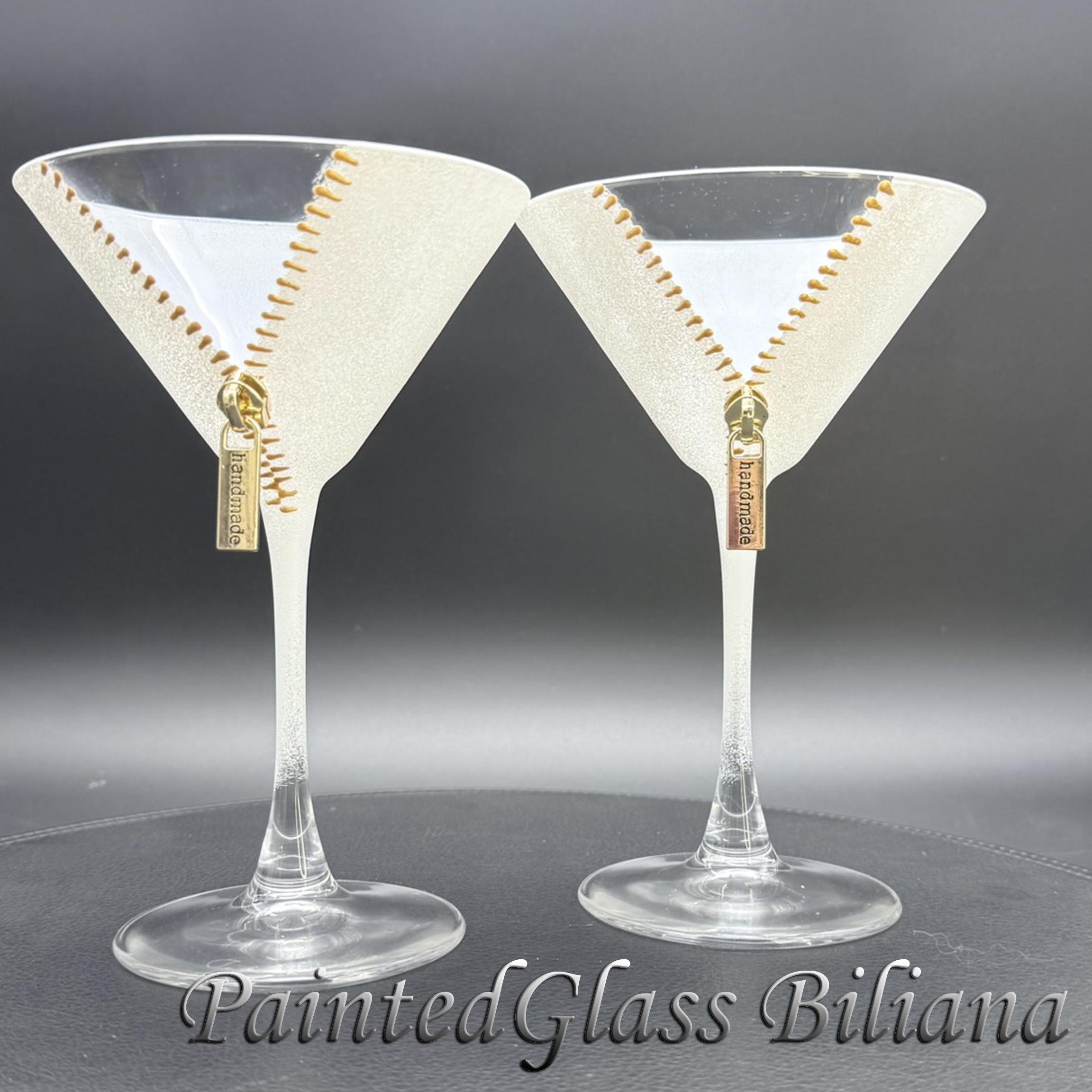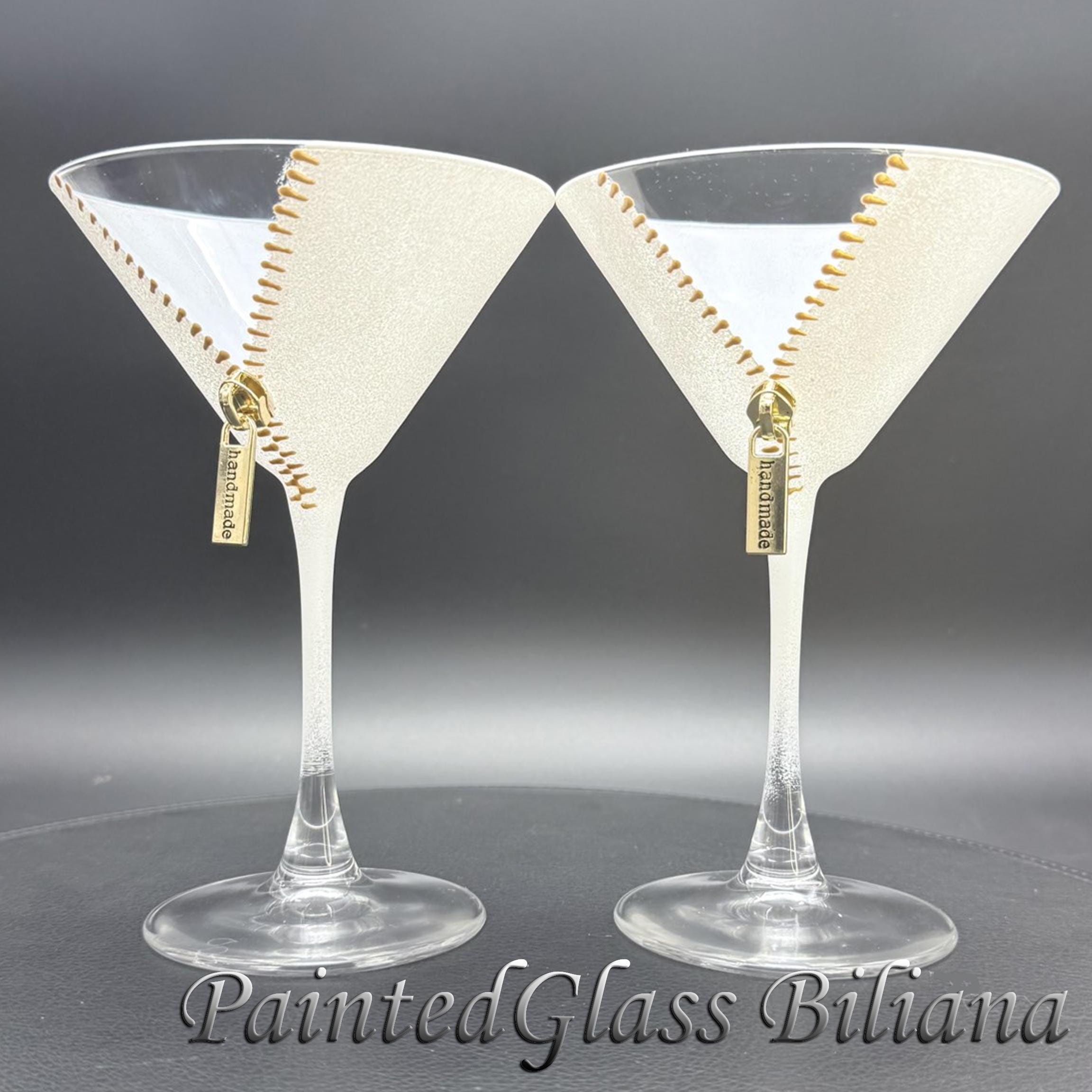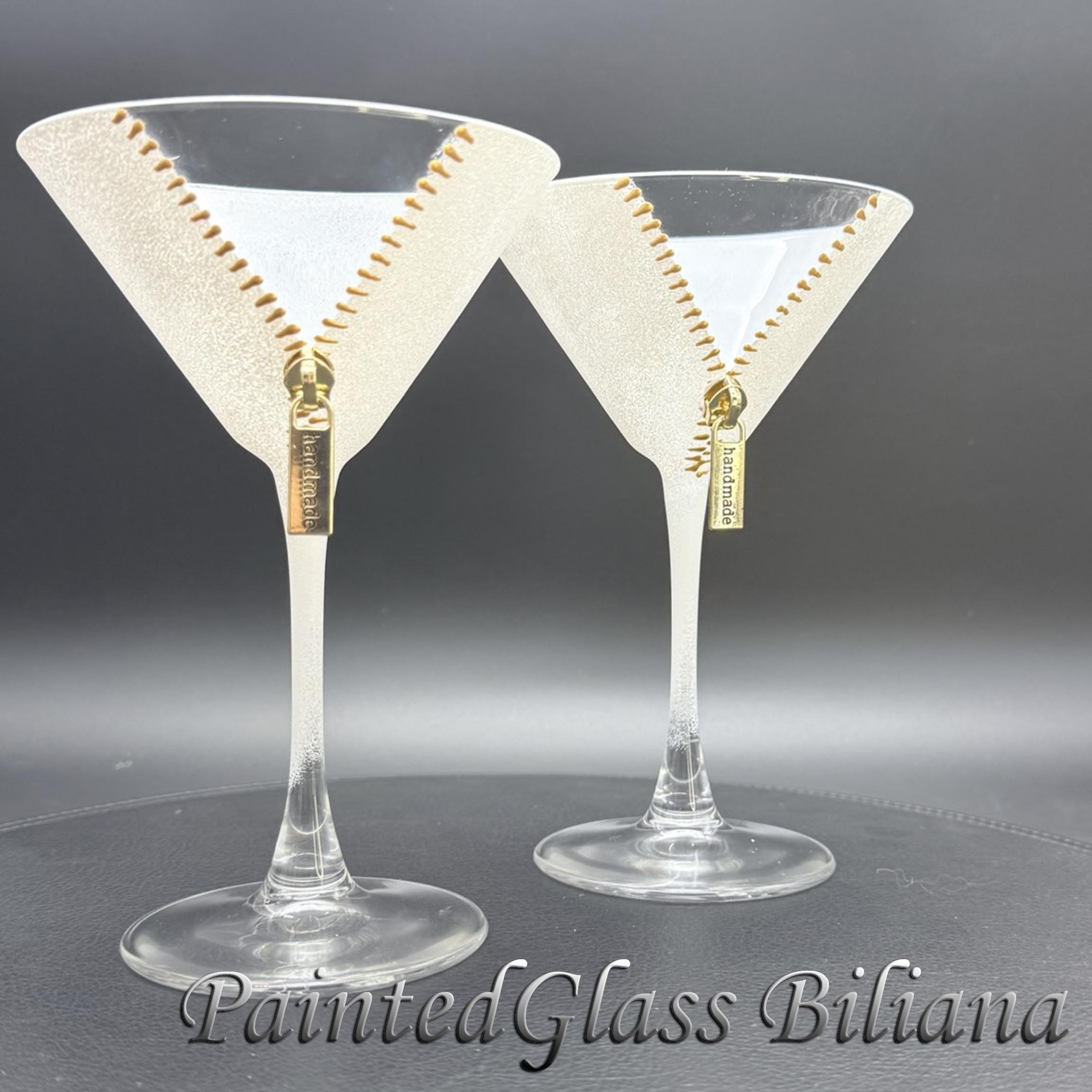 Set of 2 hand painted martini glasses with modern zipper design, made with god paints and white frost effect.
