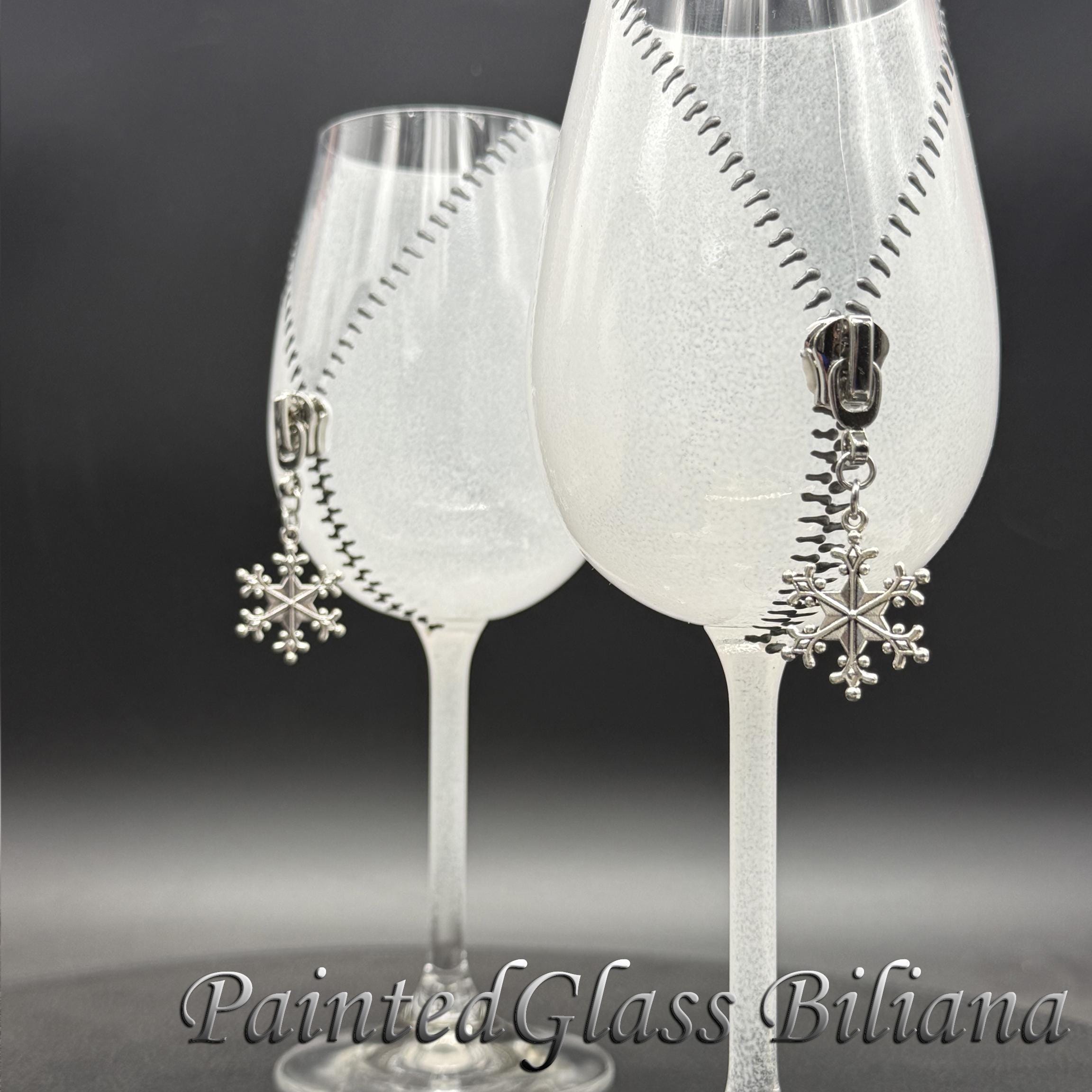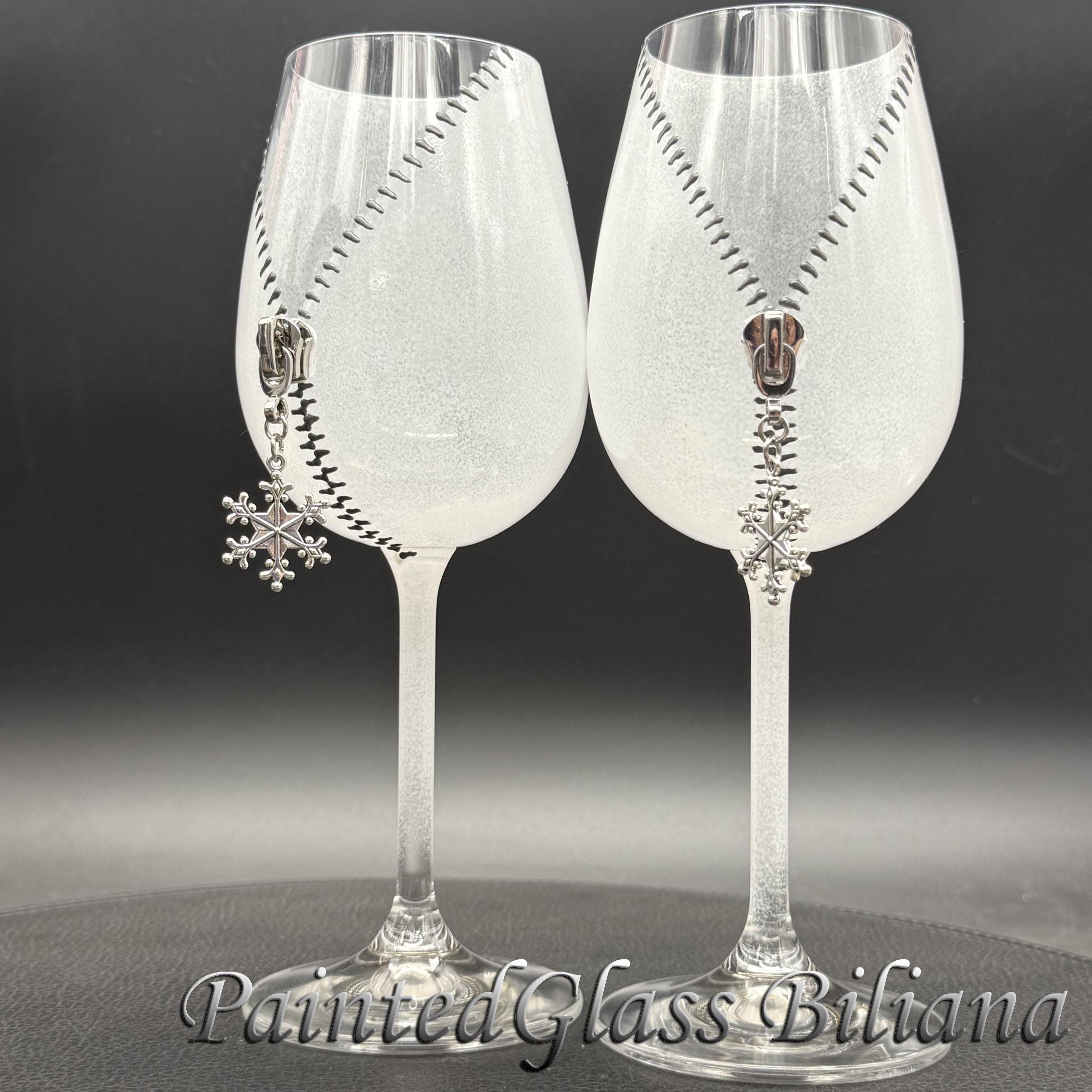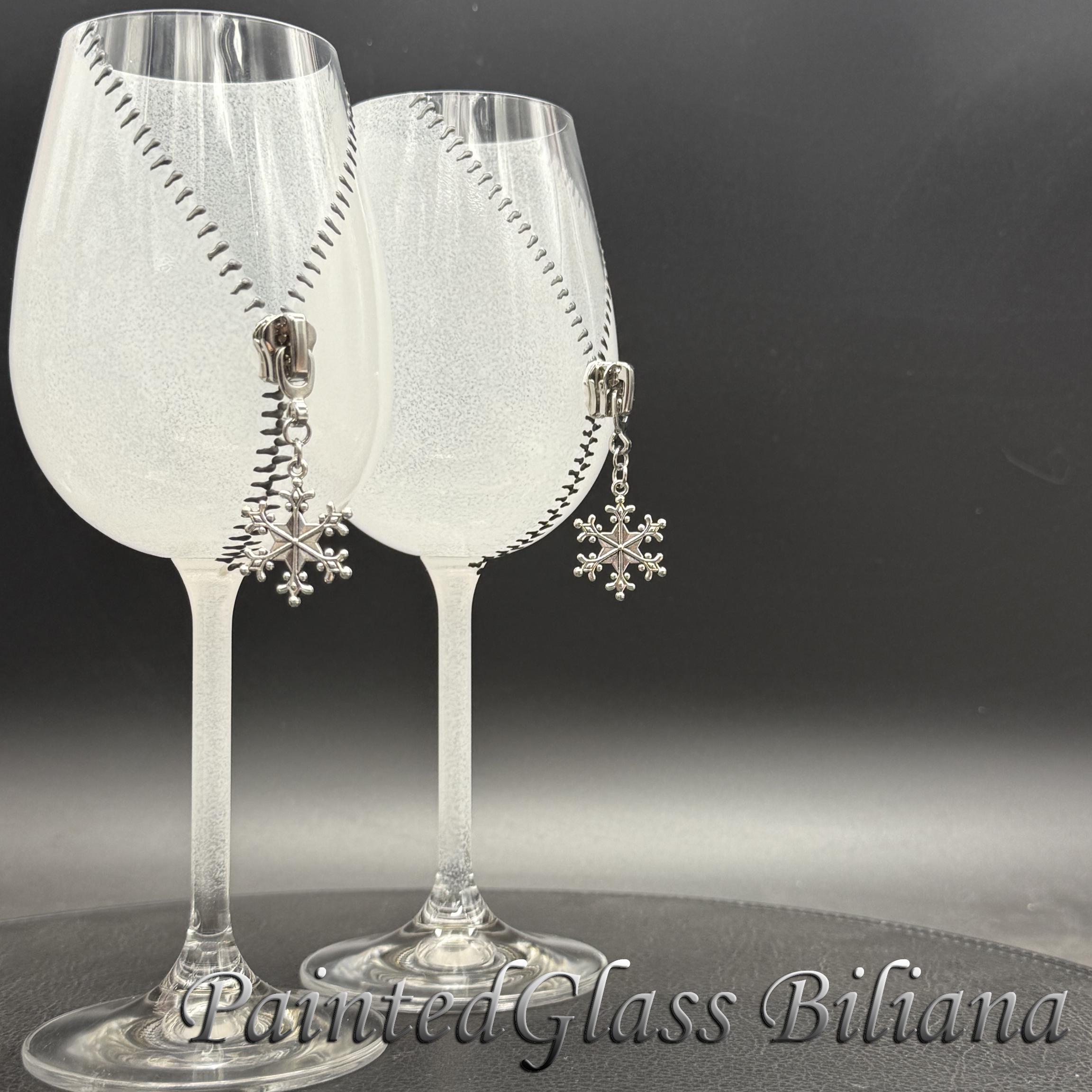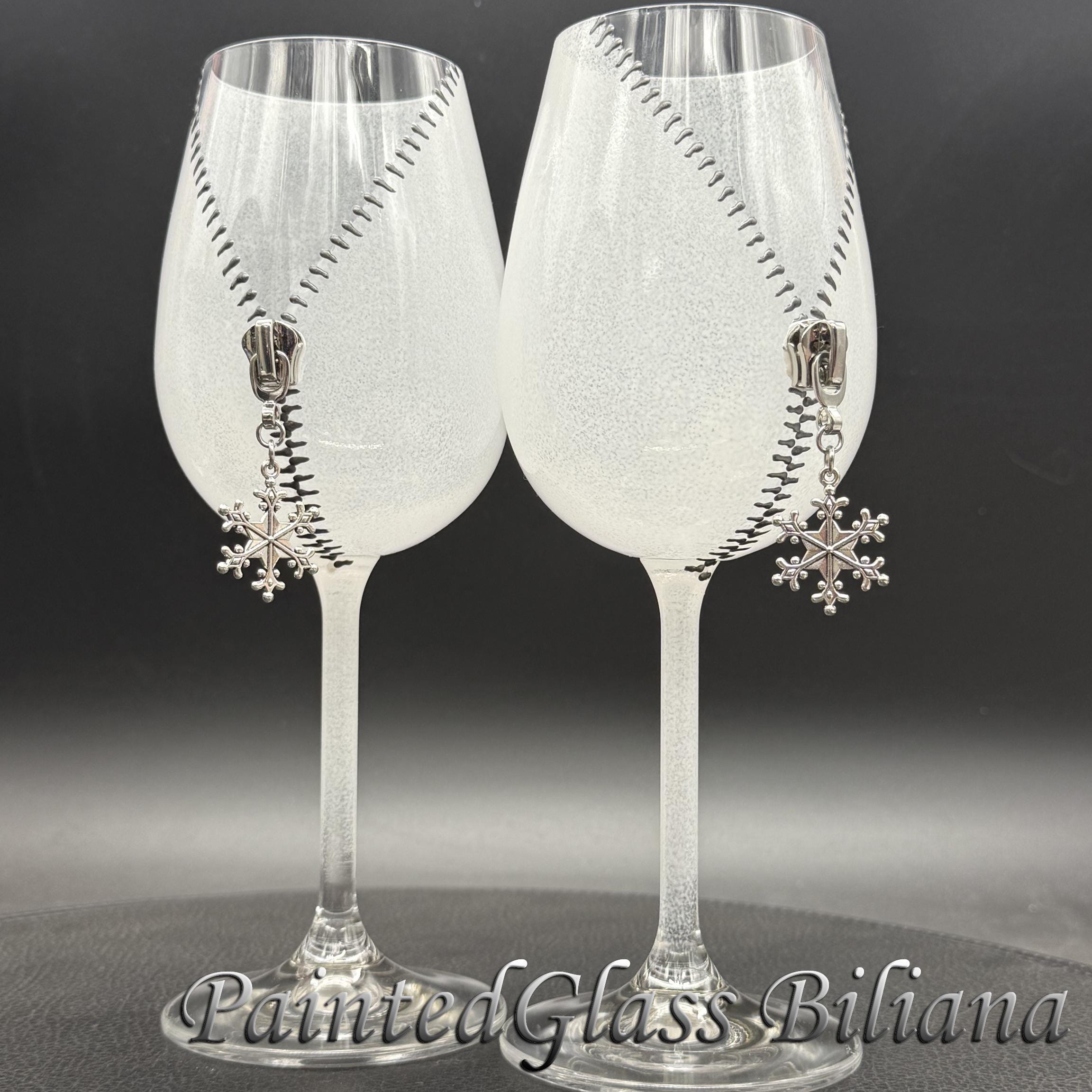 Set of 2 hand painted wine glasses with modern zipper snowflake design, made with silver paints and white frost effect.