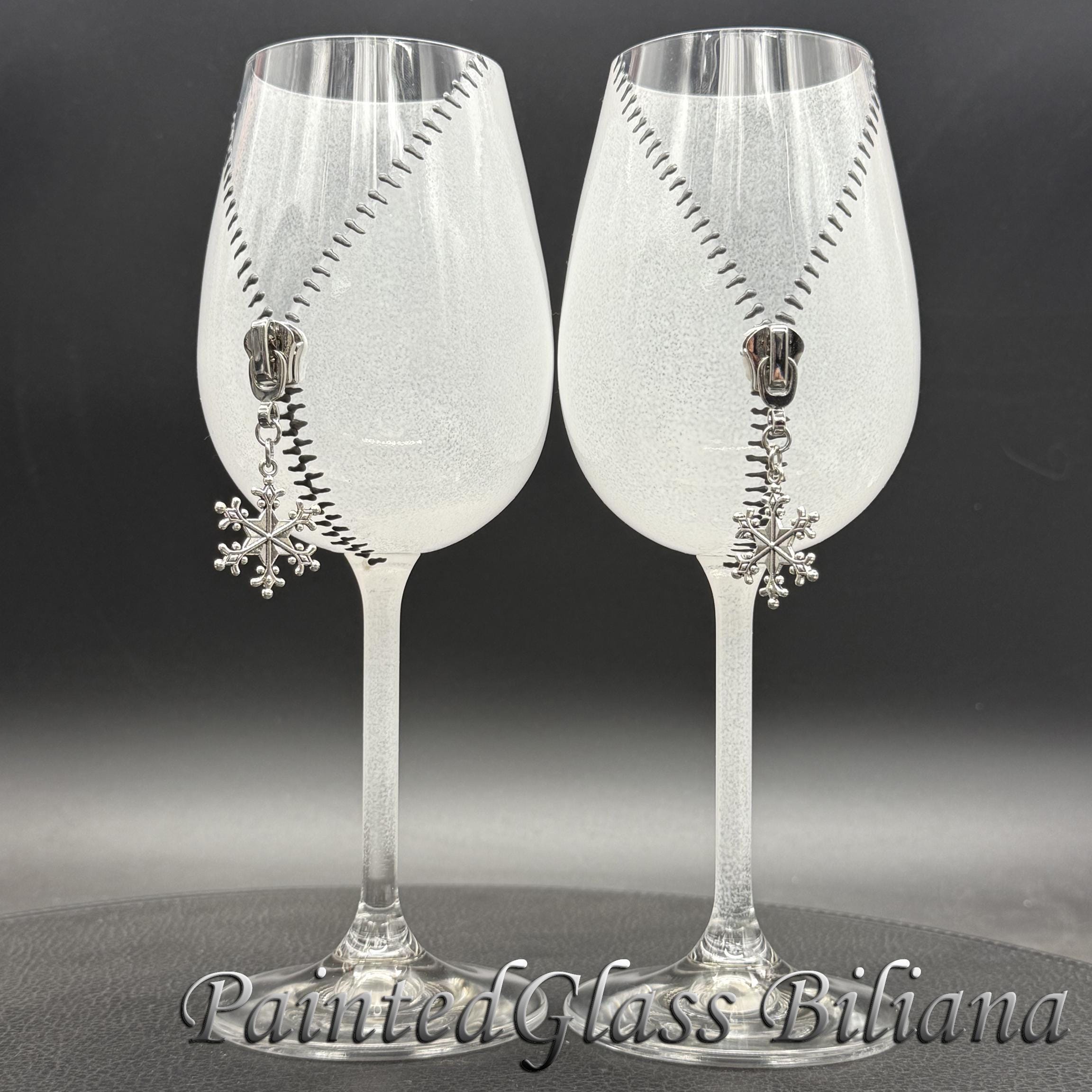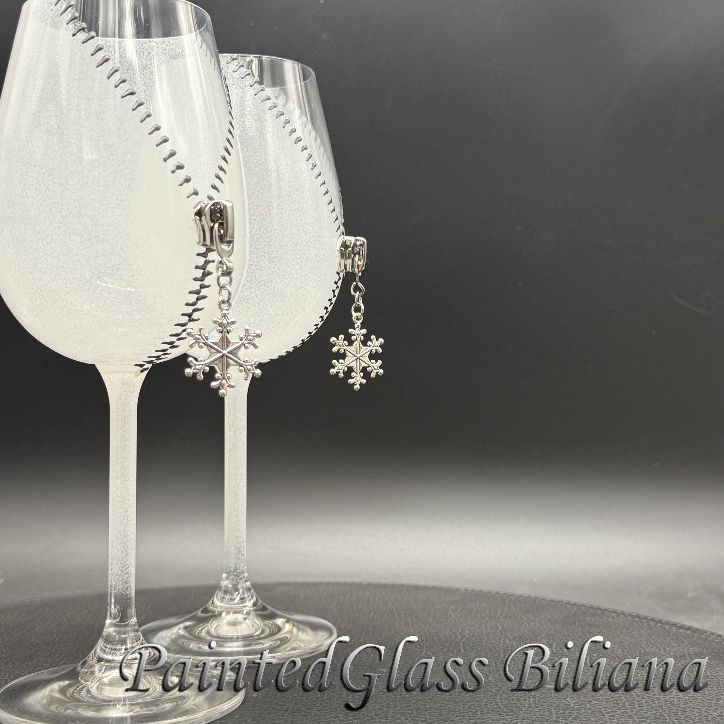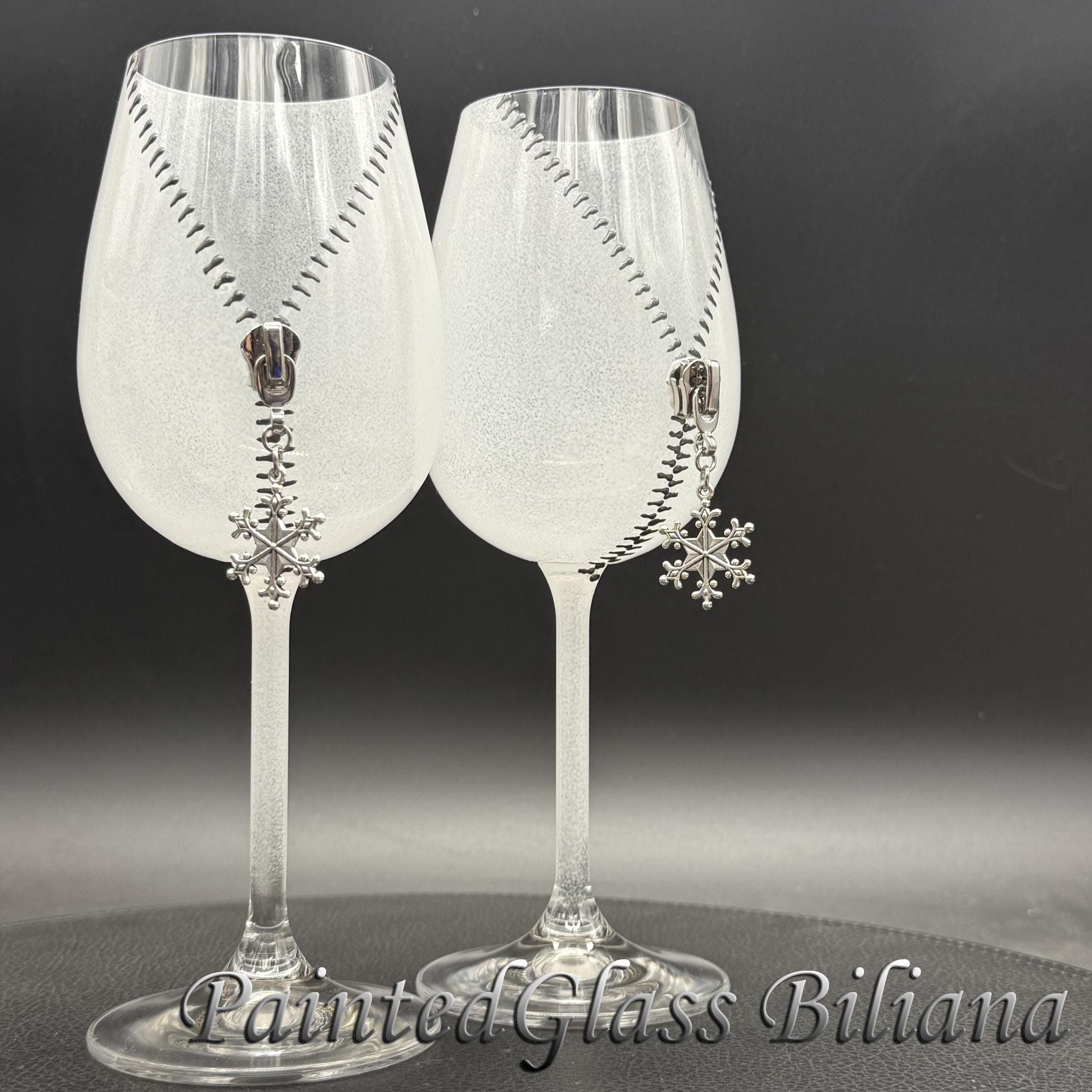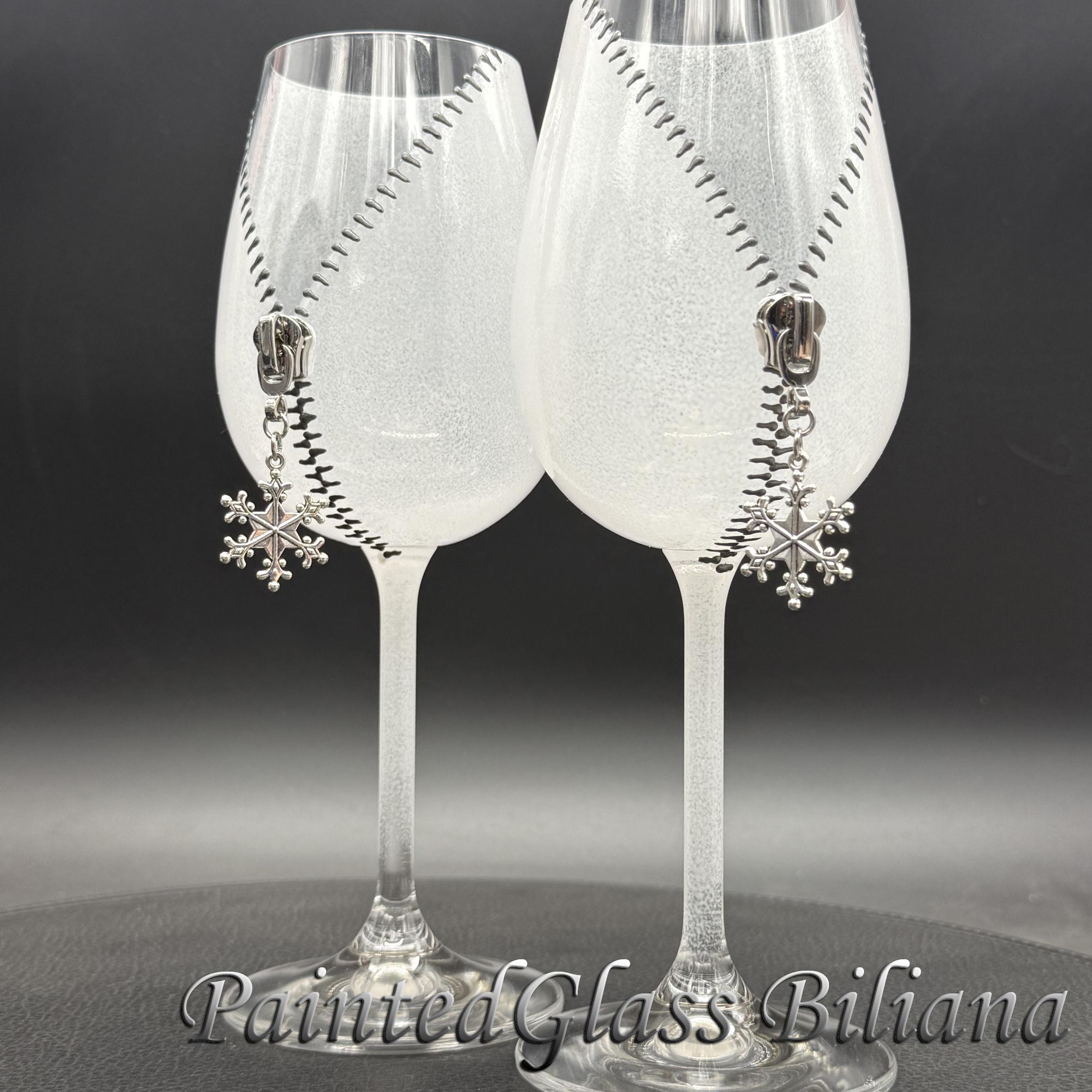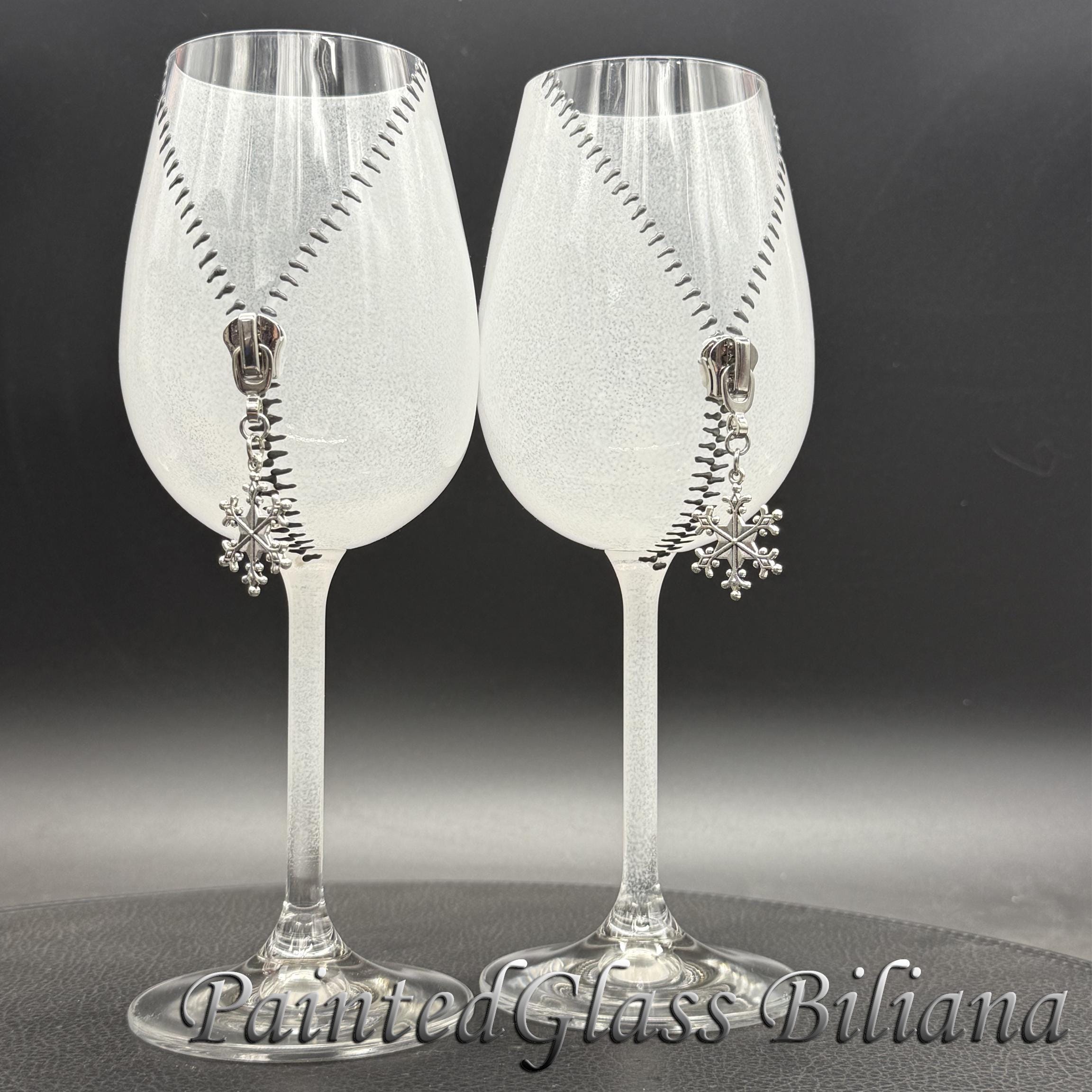 Set of 2 hand painted wine glasses with modern zipper snowflake design, made with silver paints and white frost effect.