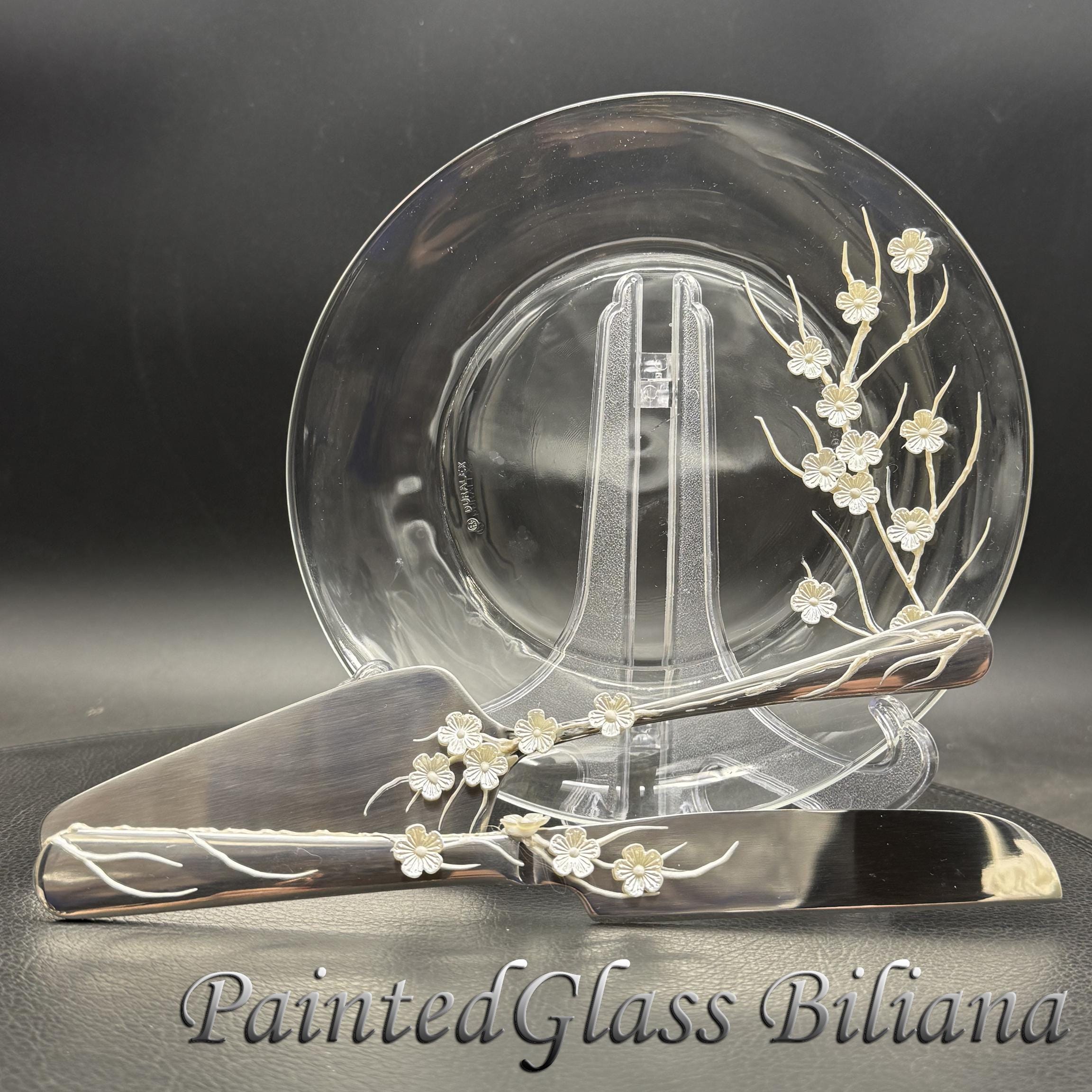 Set of 2 hand painted cake serving sets with gold color dragons and white crystals