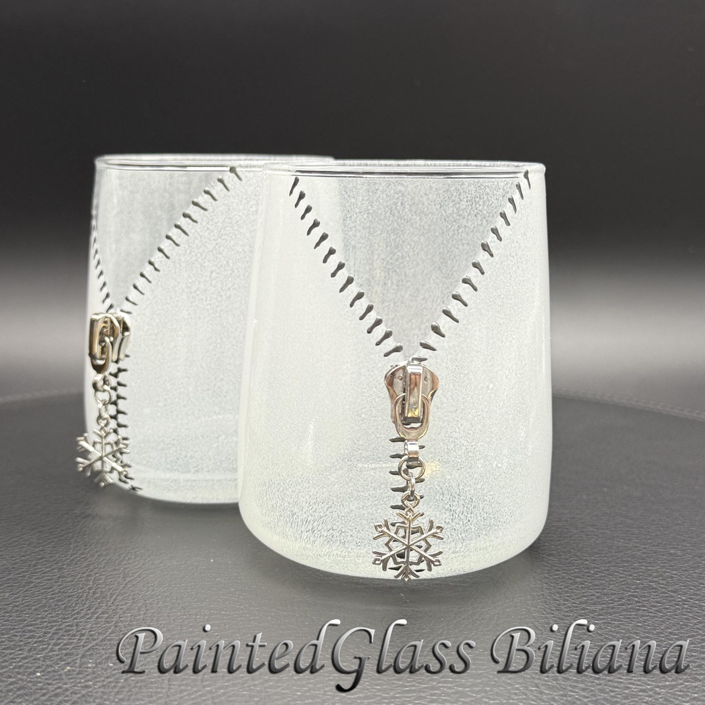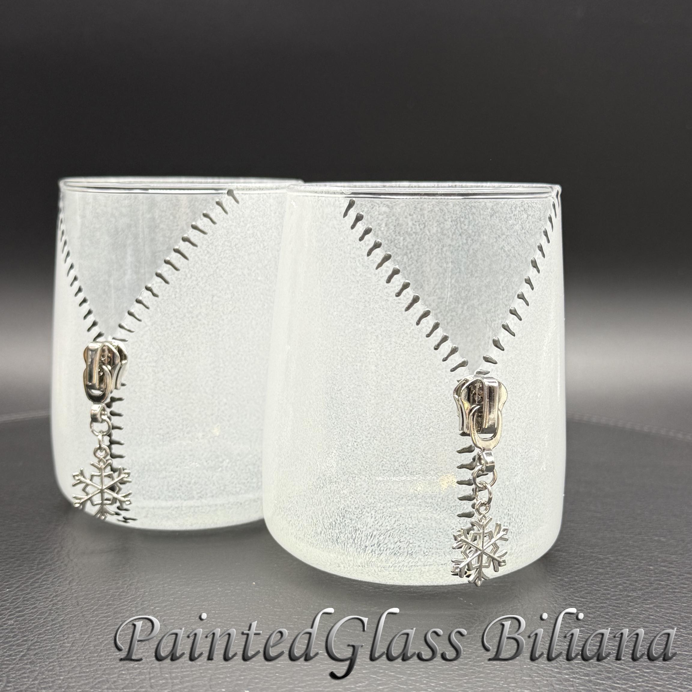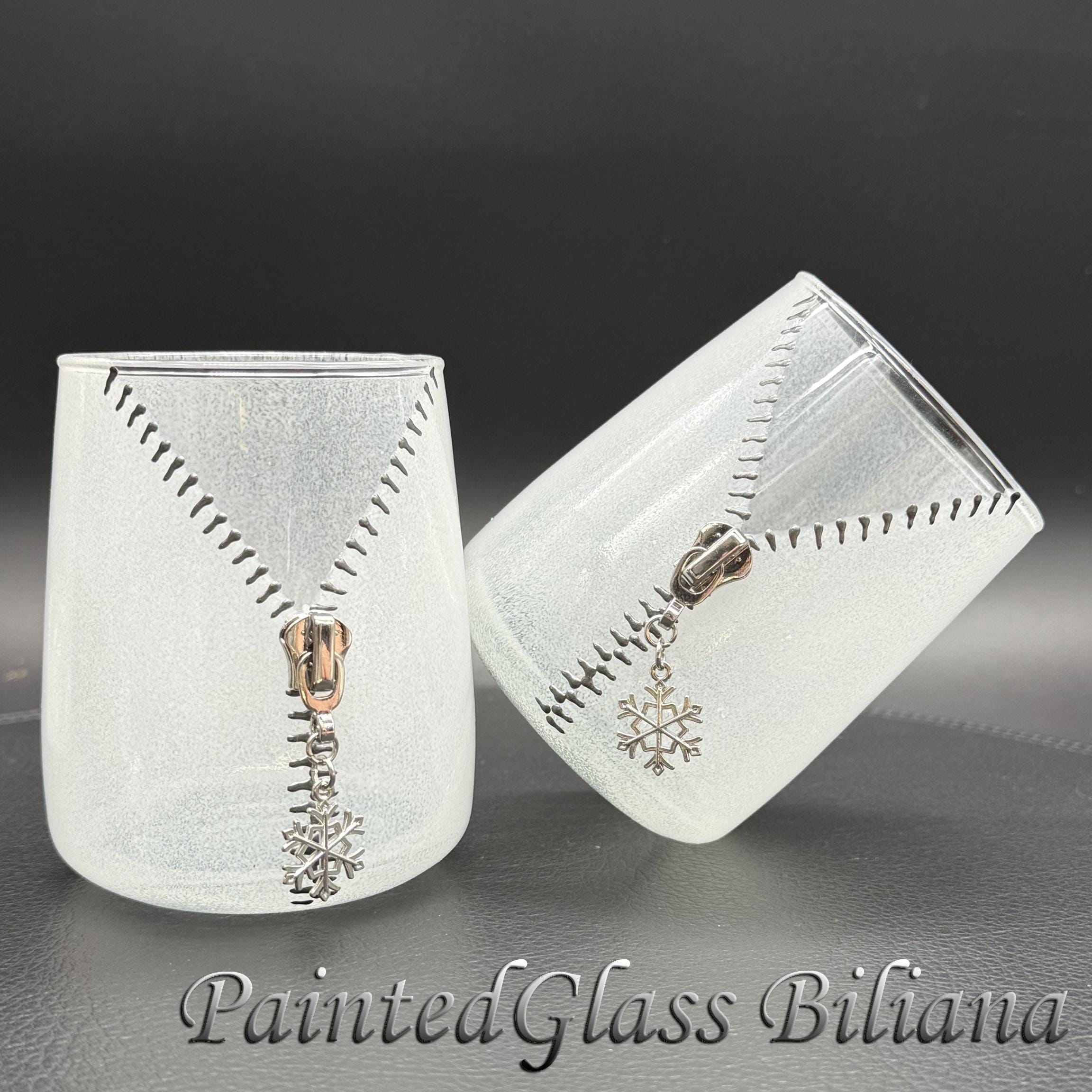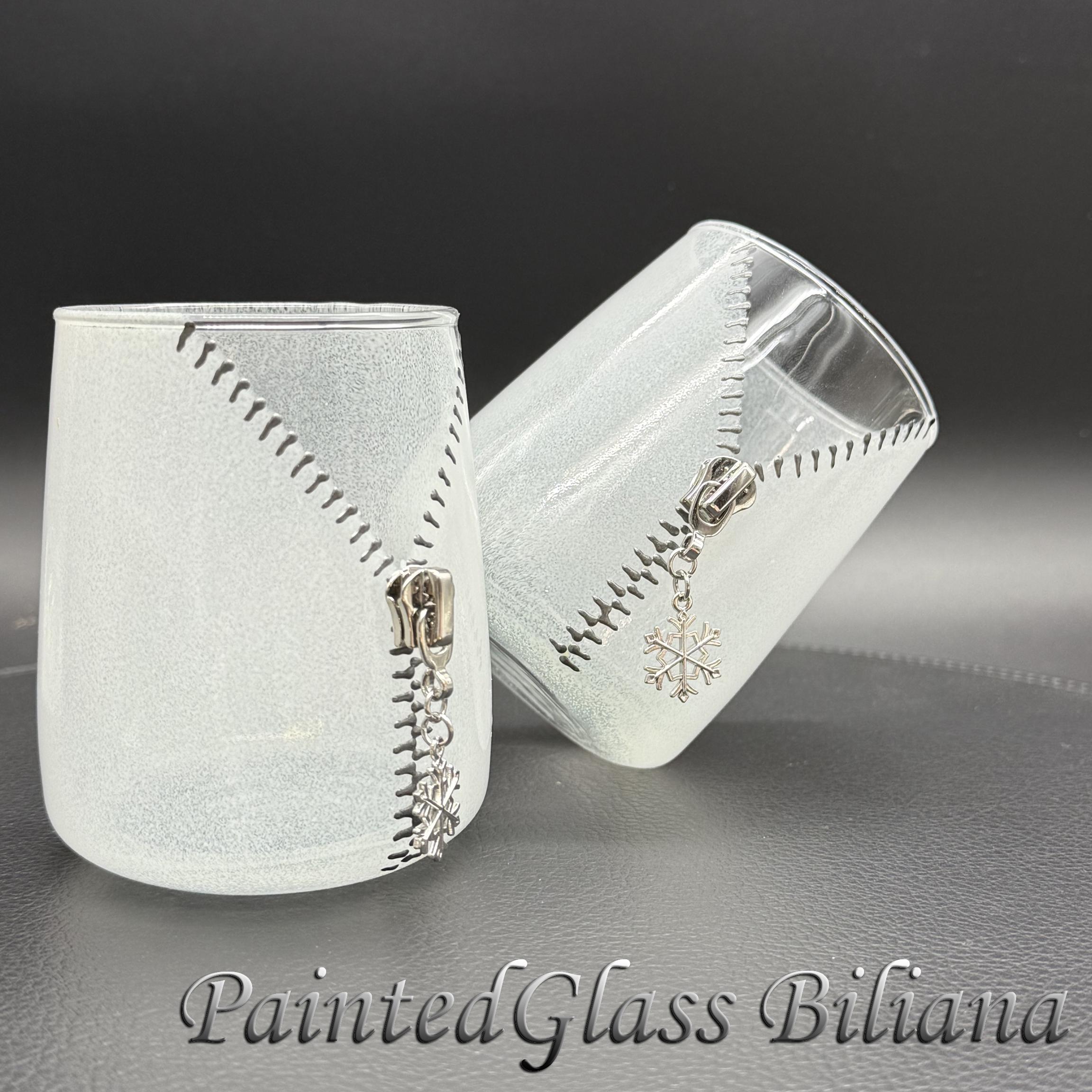 Set of 2 hand painted stemless wine glasses with modern zipper snowflake design, made with silver paints and white frost effect.