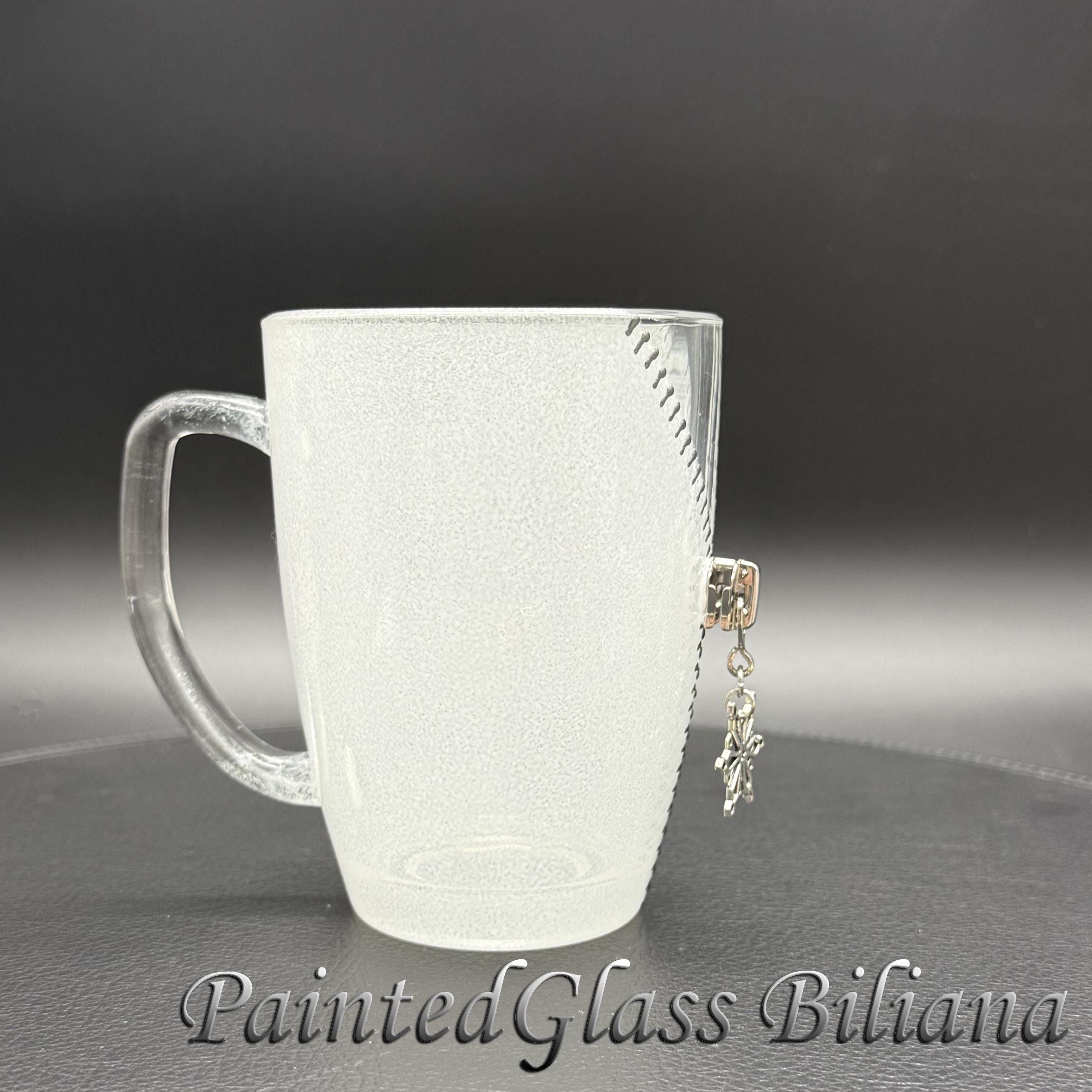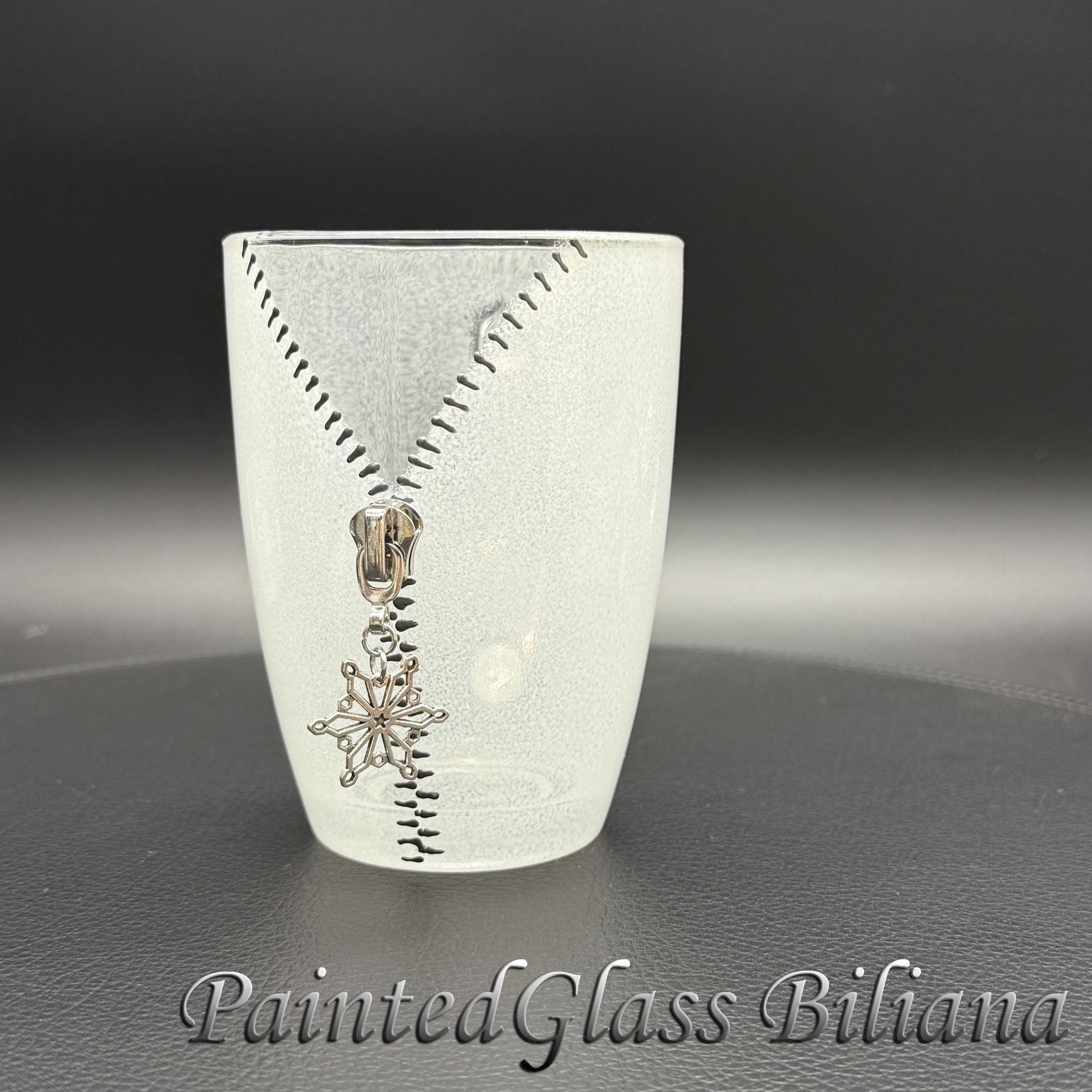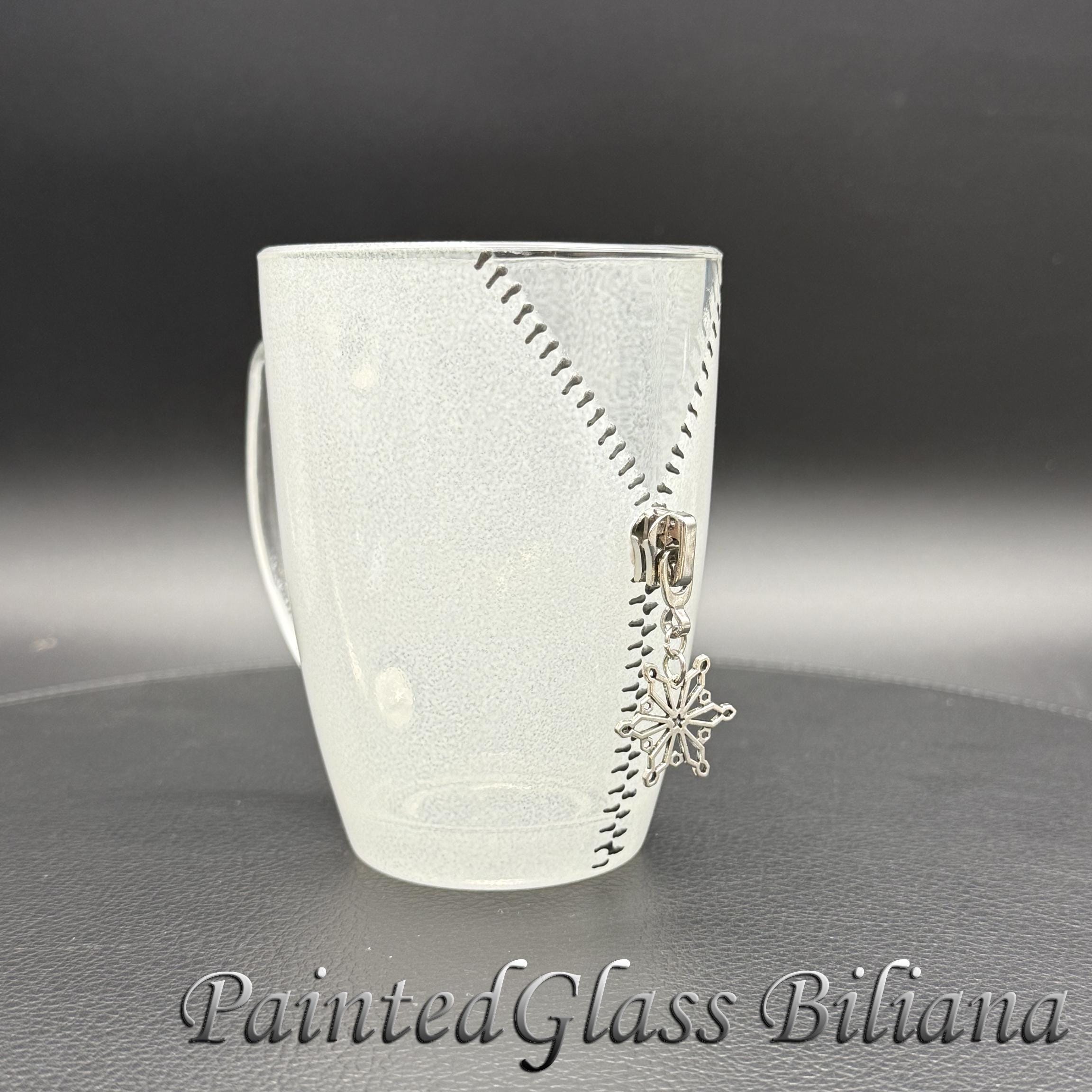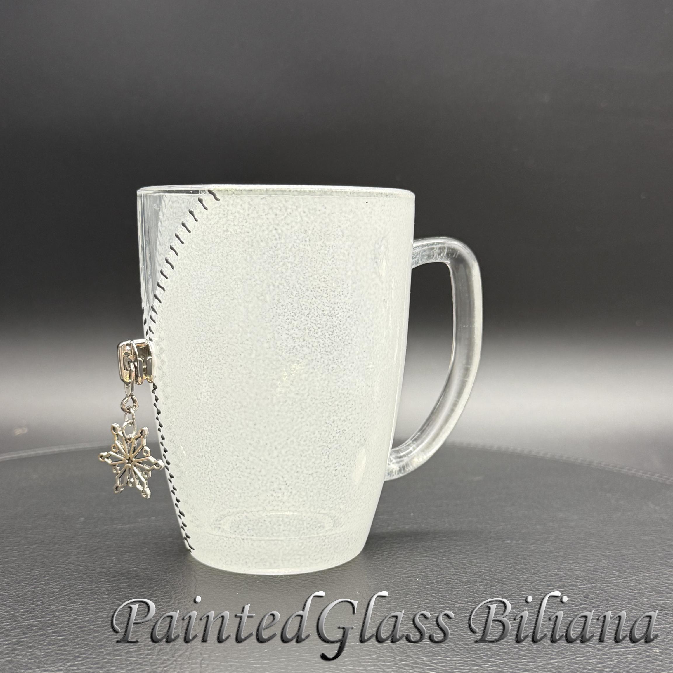 Hand painted glass coffee mug with modern zipper snowflake design, made with silver paints and white frost effect.