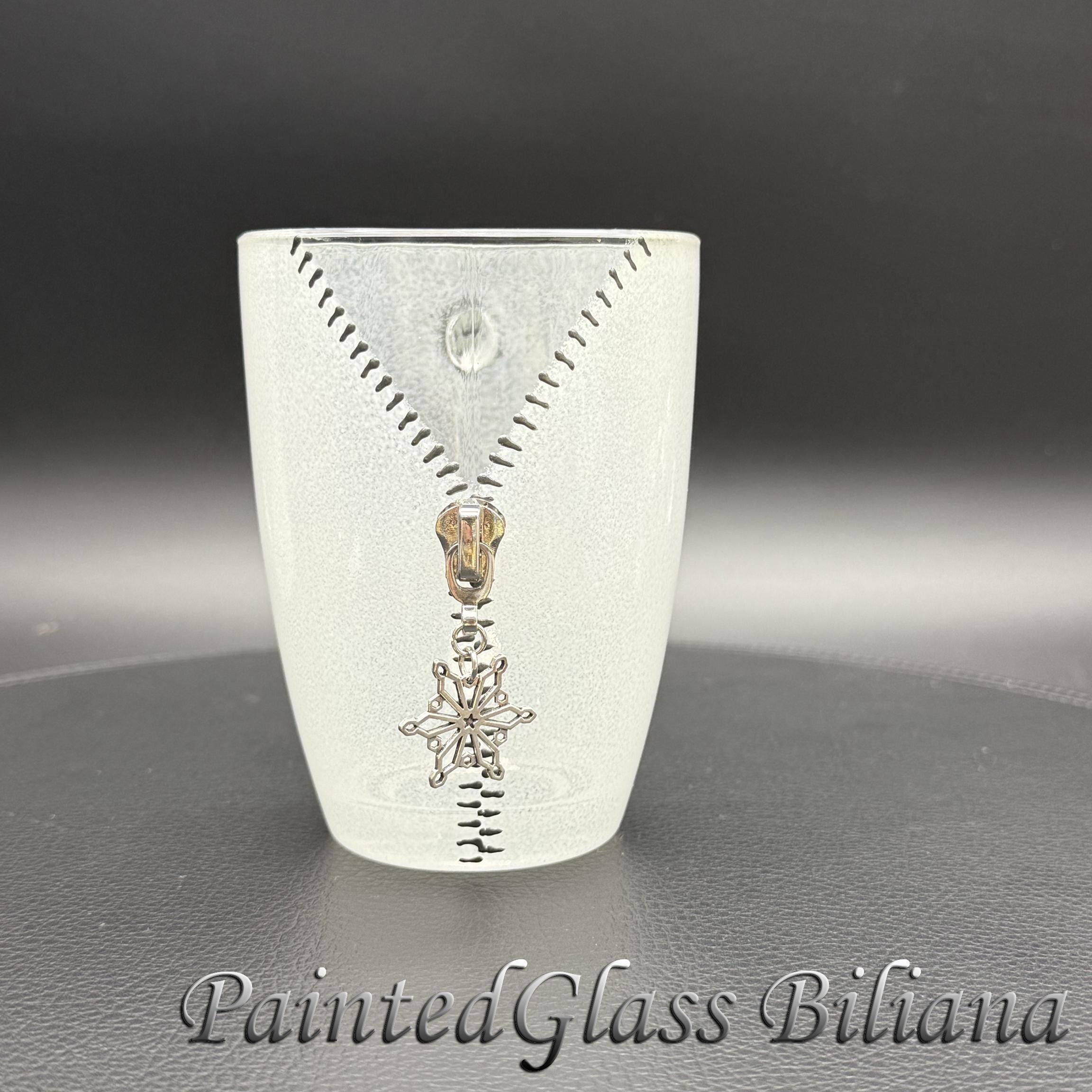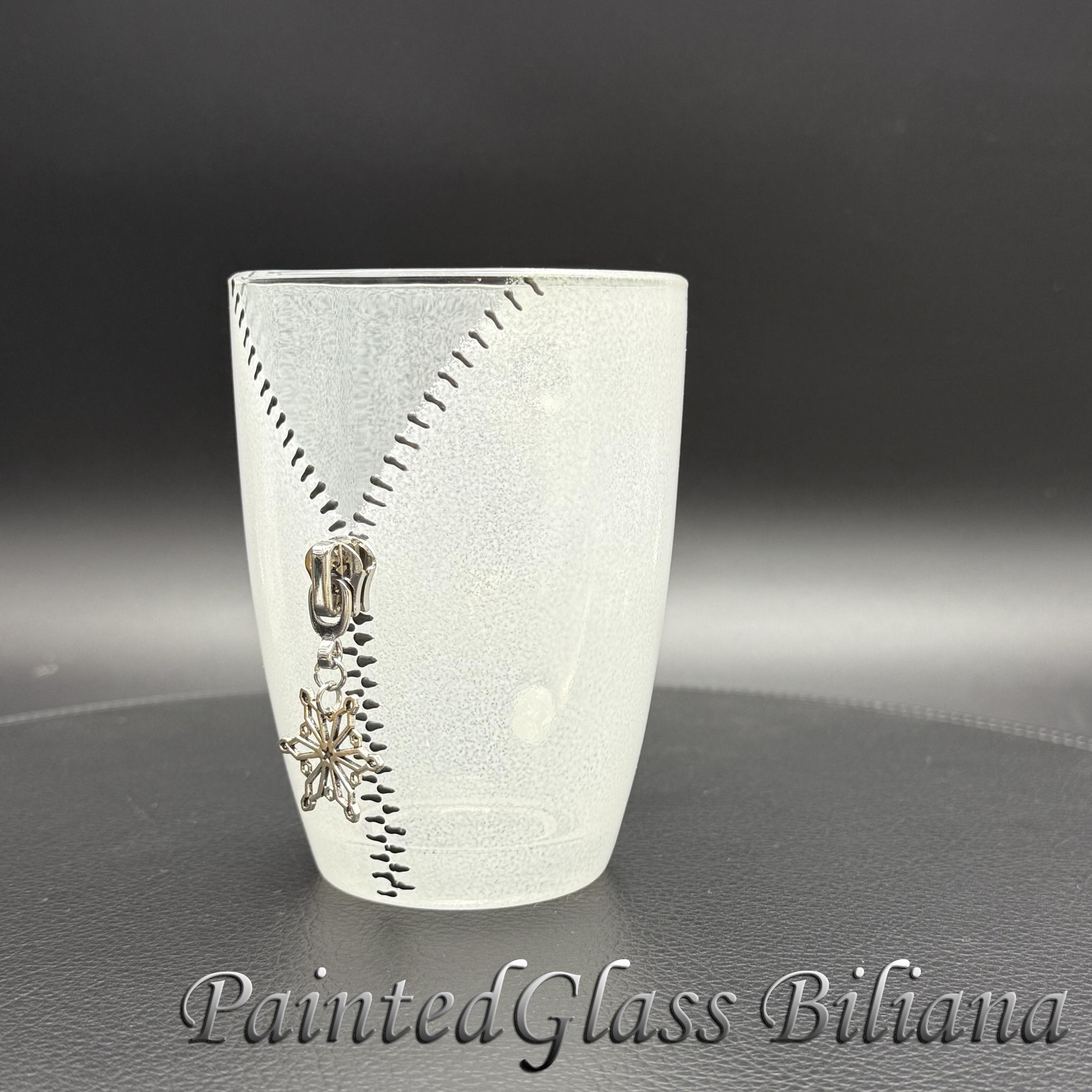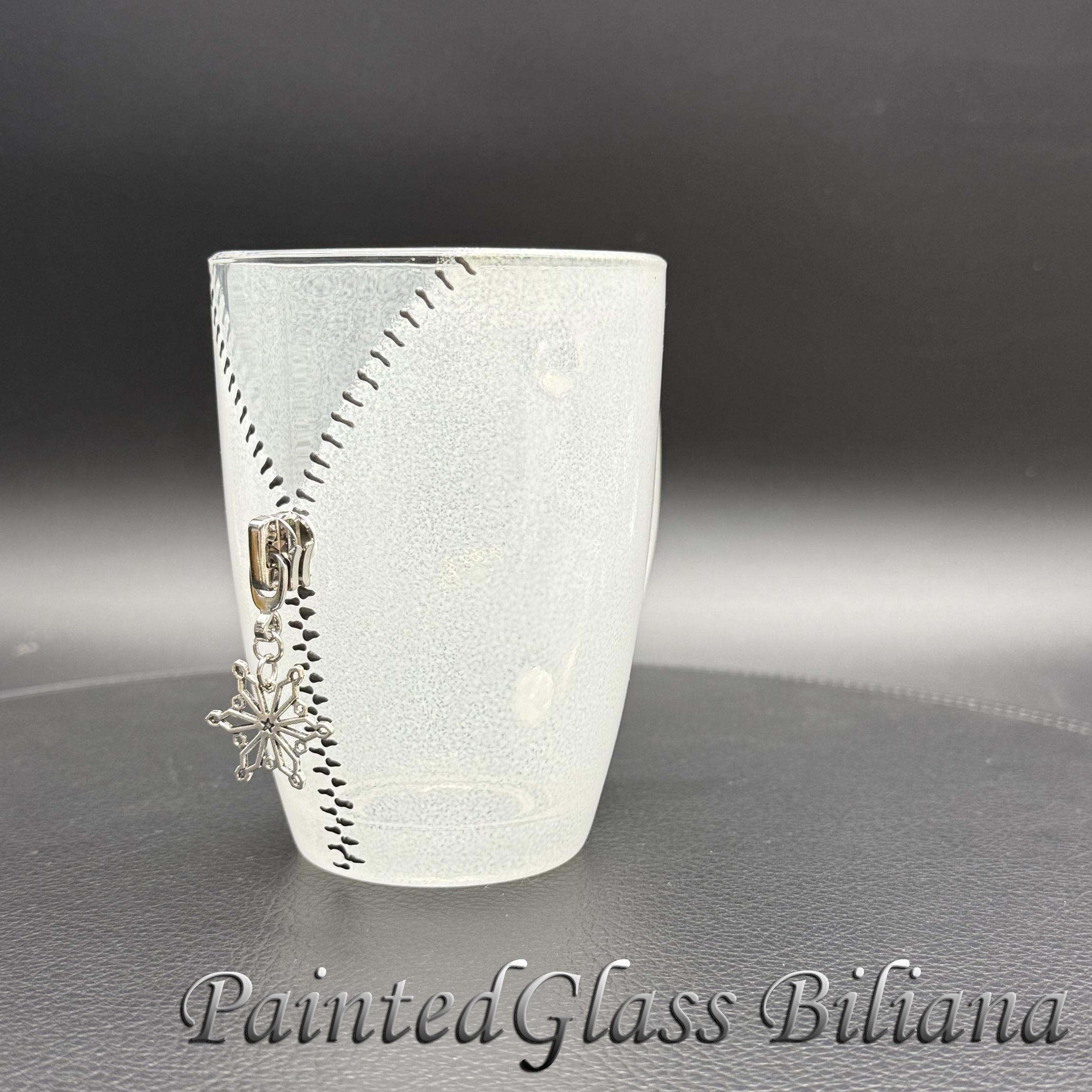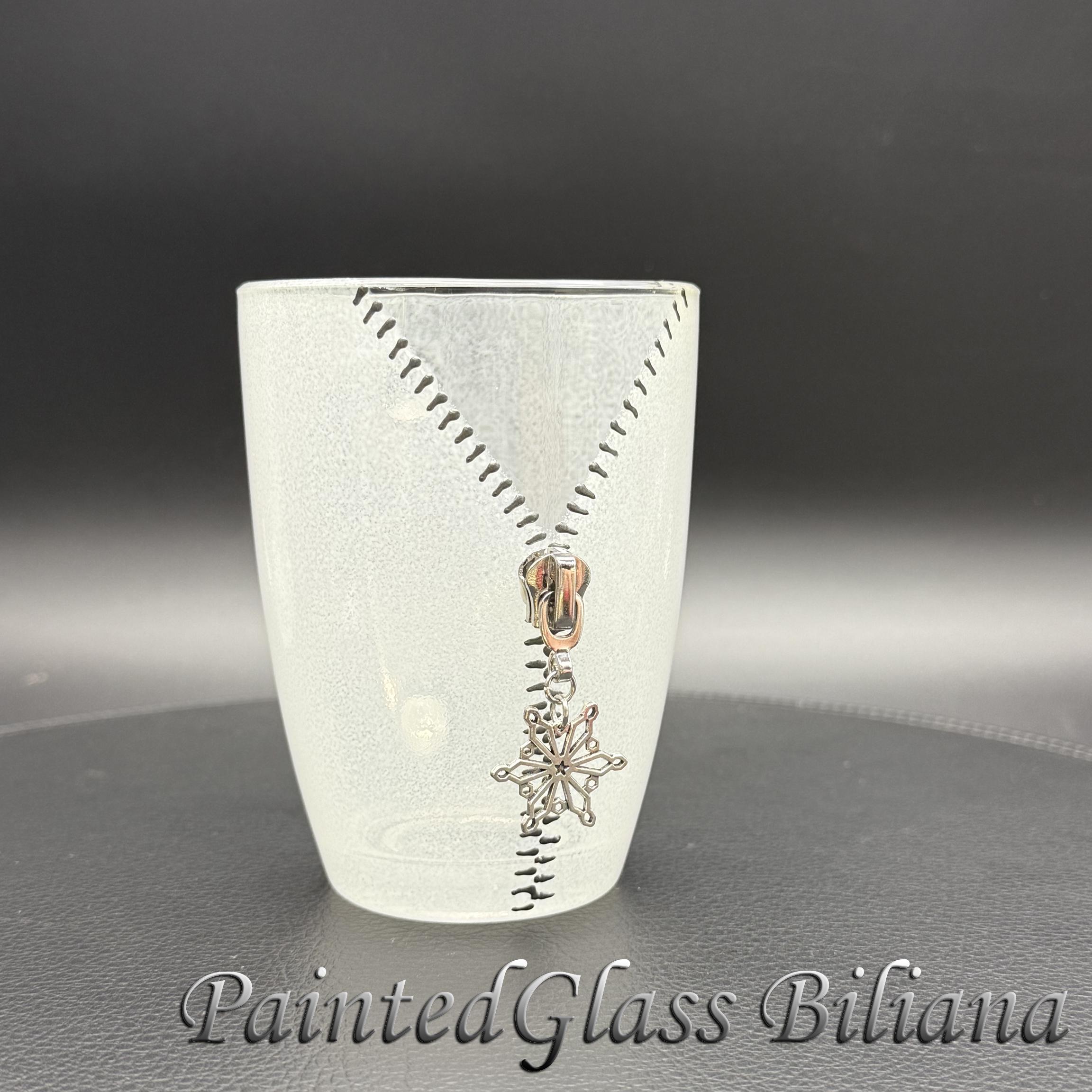 Hand painted glass coffee mug with modern zipper snowflake design, made with silver paints and white frost effect.