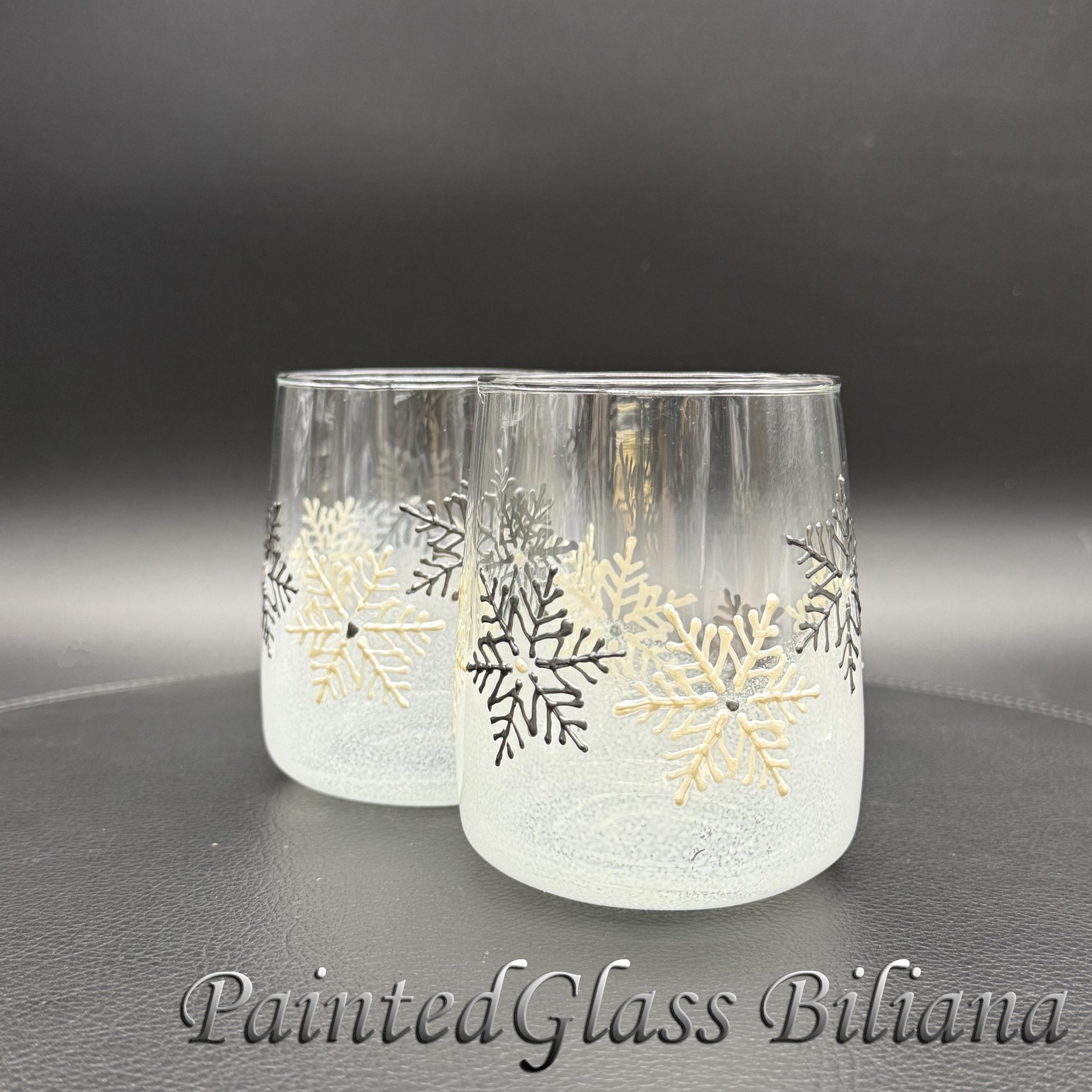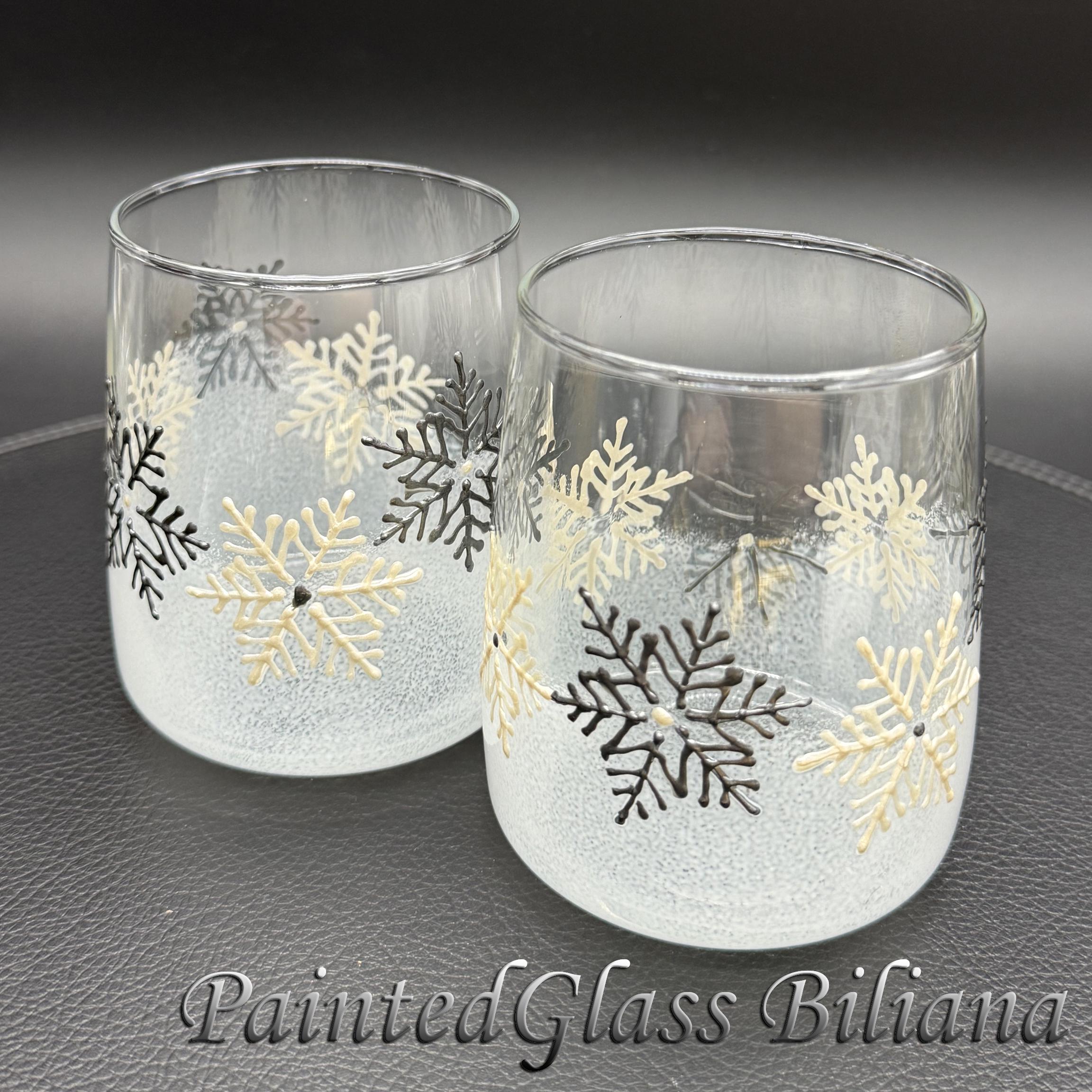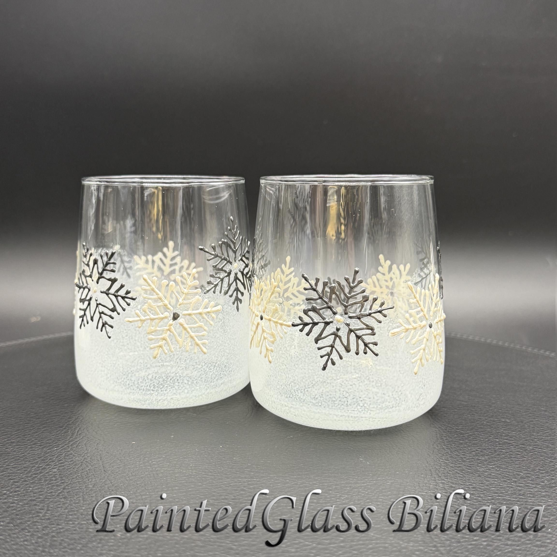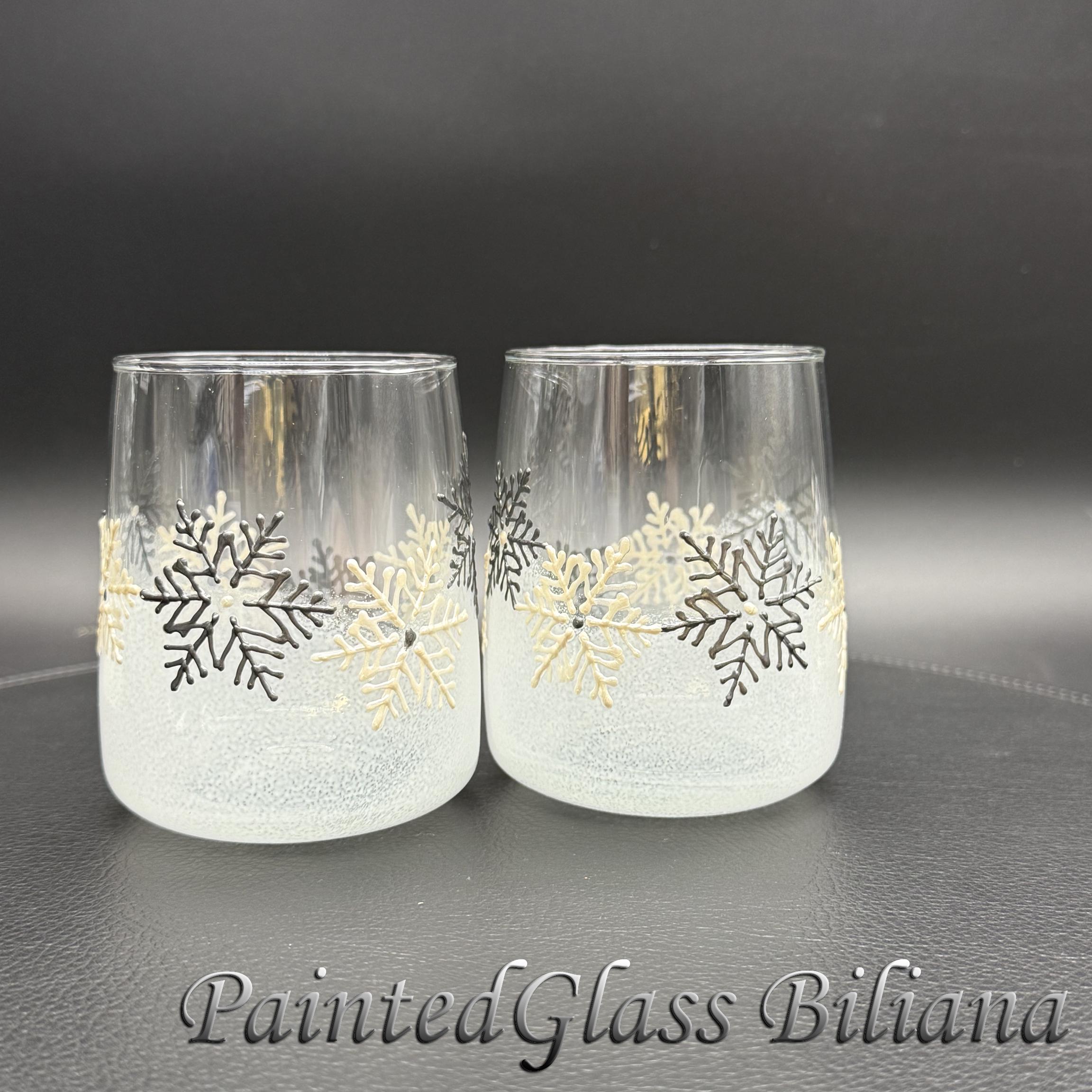 Delicate hand painted set of 2 stemless wine glasses with a lace of snowflakes in pearly white and silver and white frost effect.