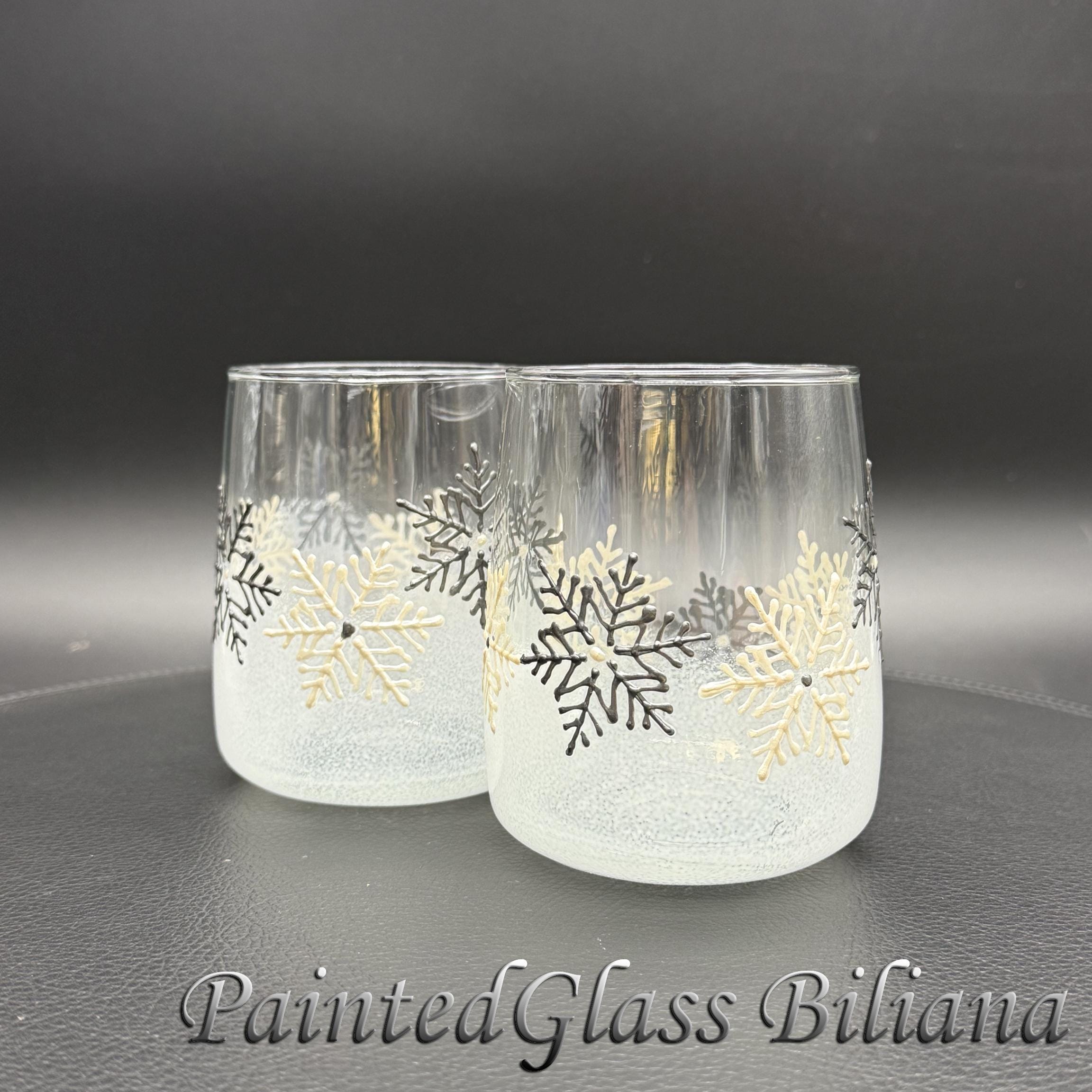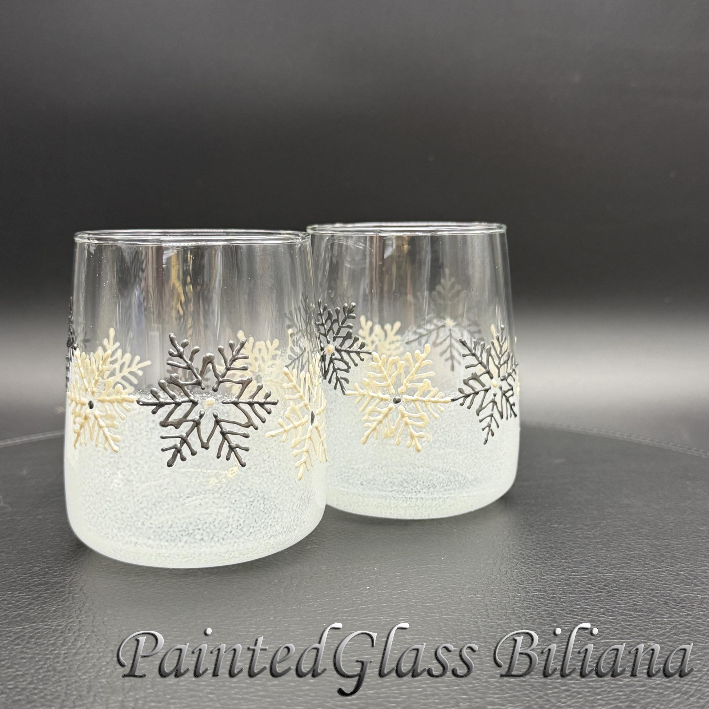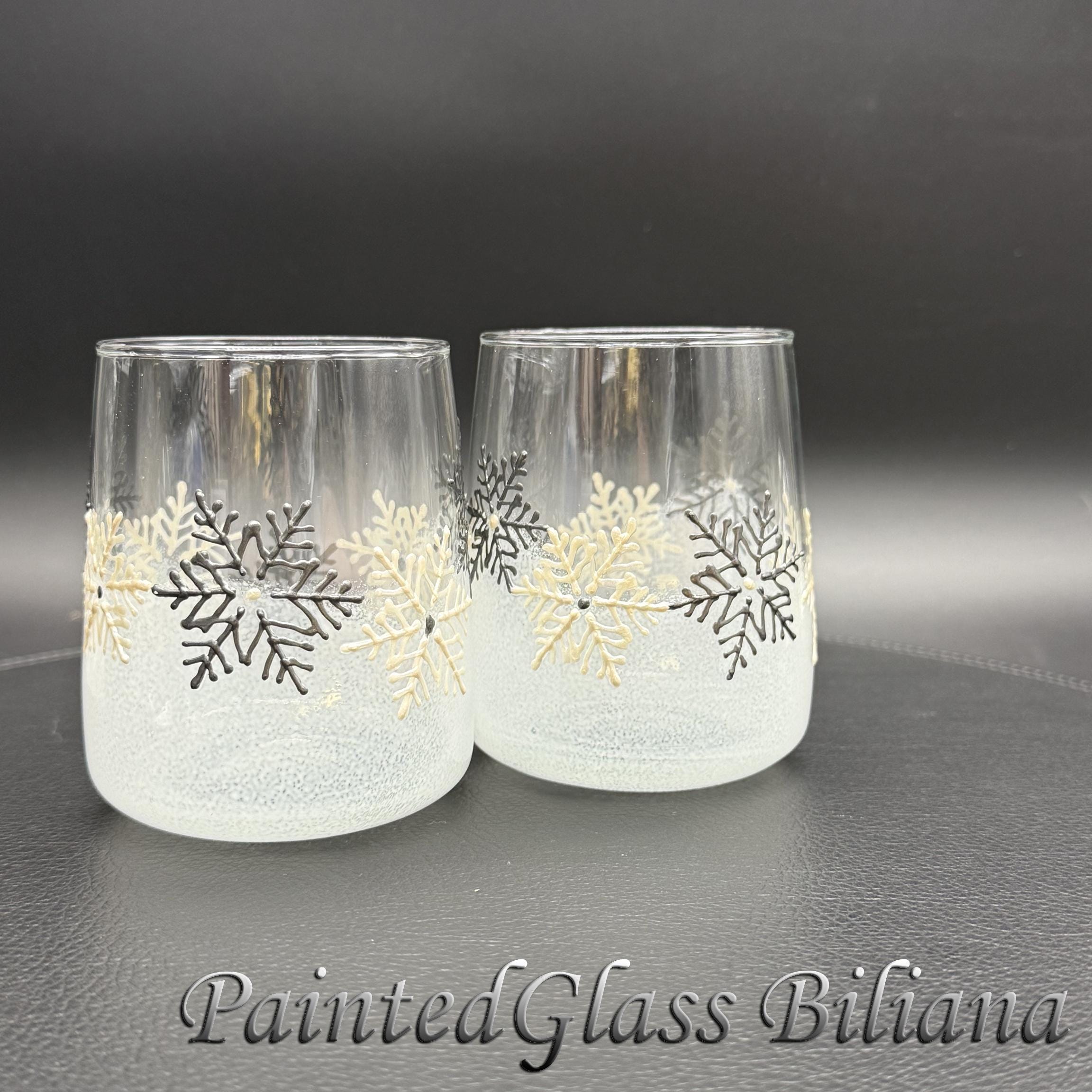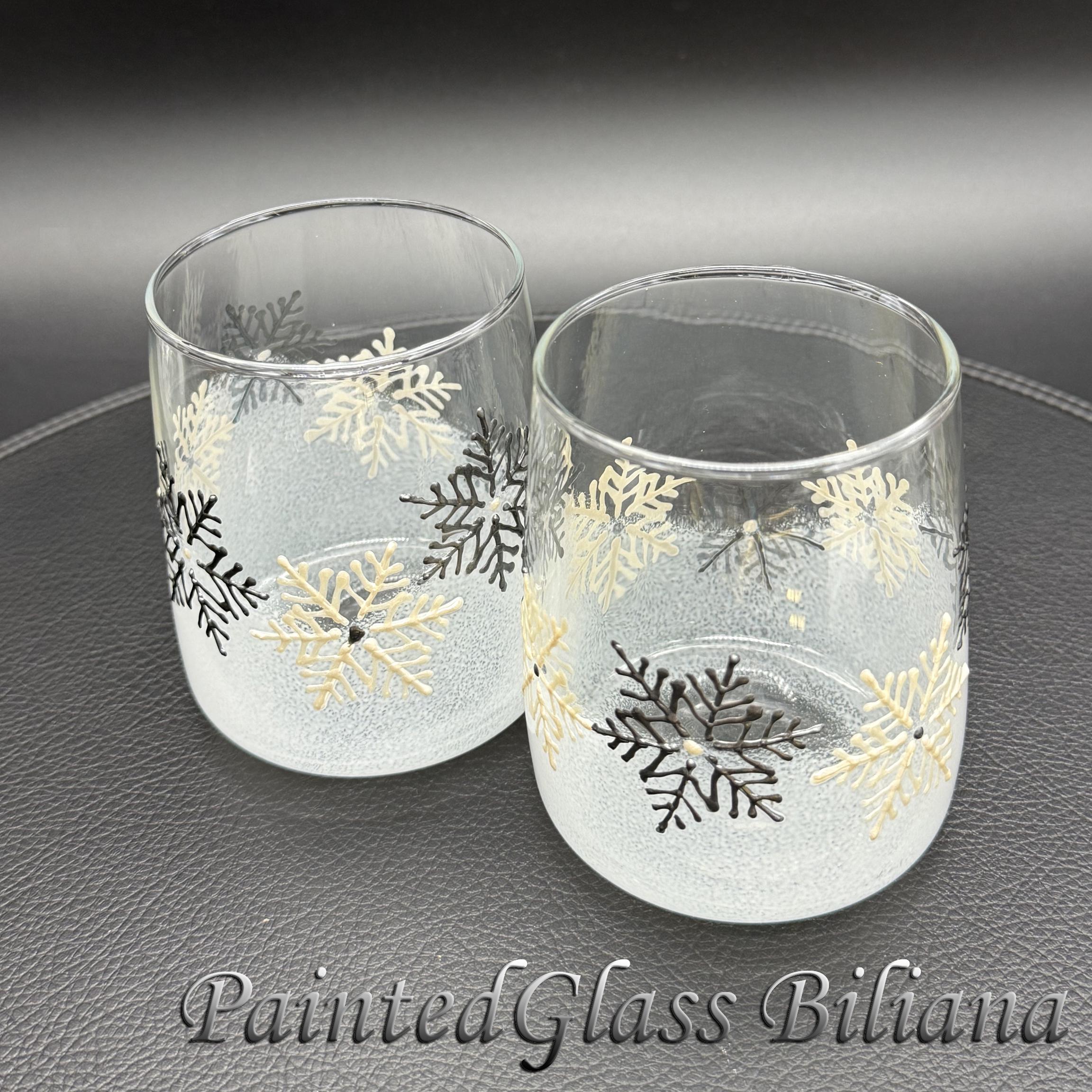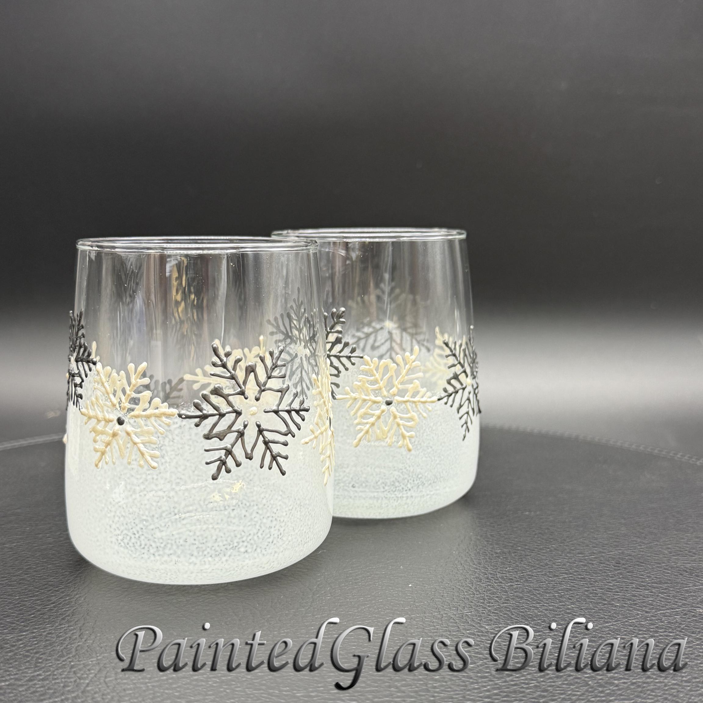 Delicate hand painted set of 2 stemless wine glasses with a lace of snowflakes in pearly white and silver and white frost effect.
