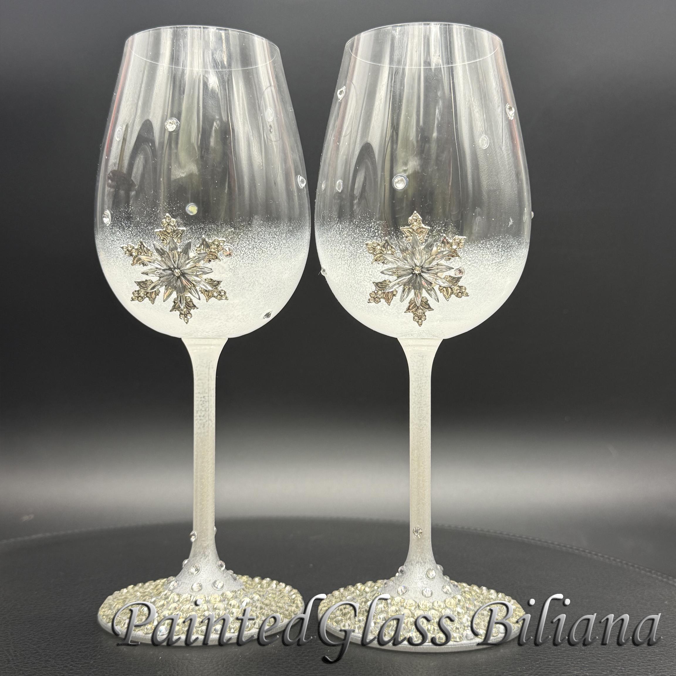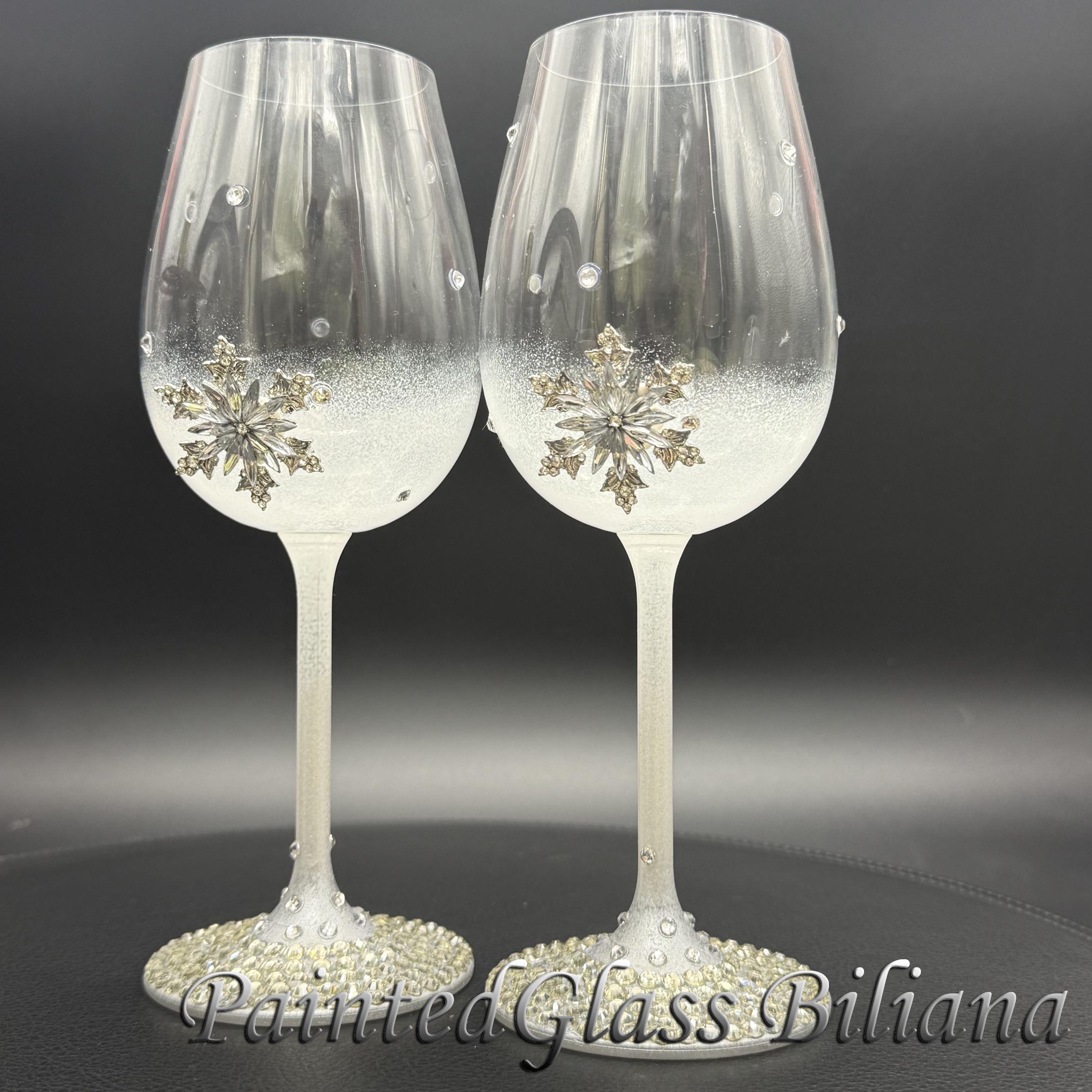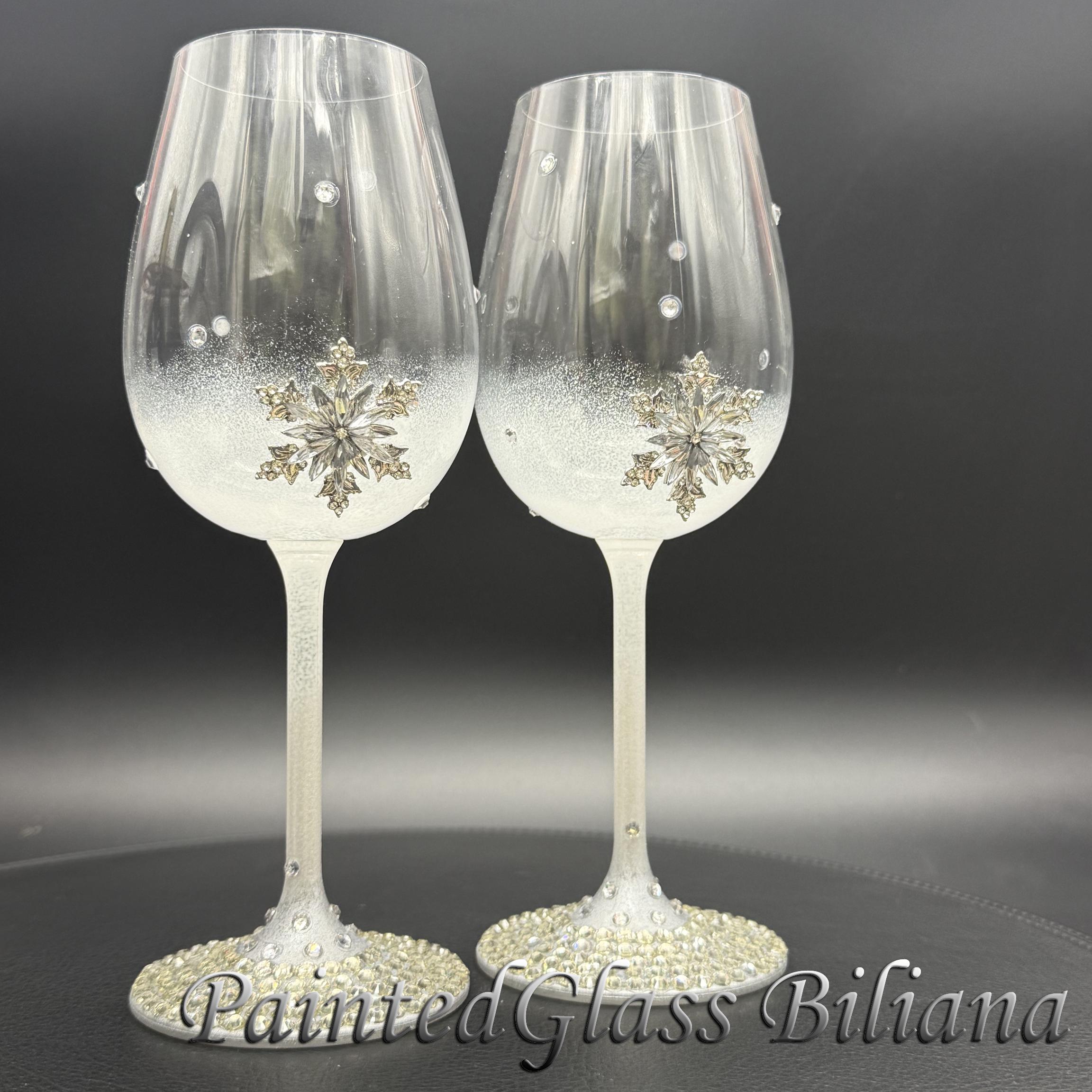 Set of 2 hand painted toasting wine glasses with tender crystal snowflake in silver at the stem of the glass.