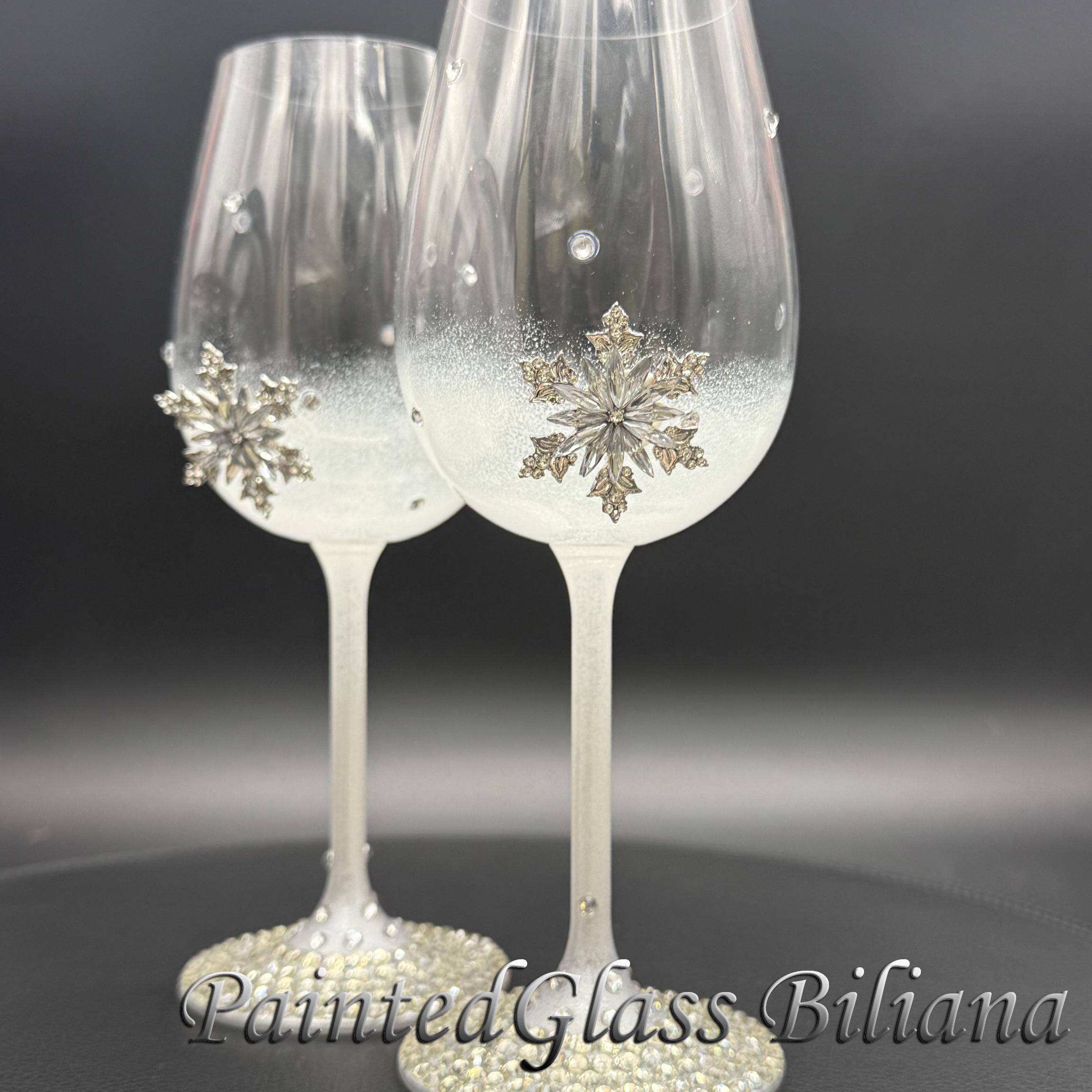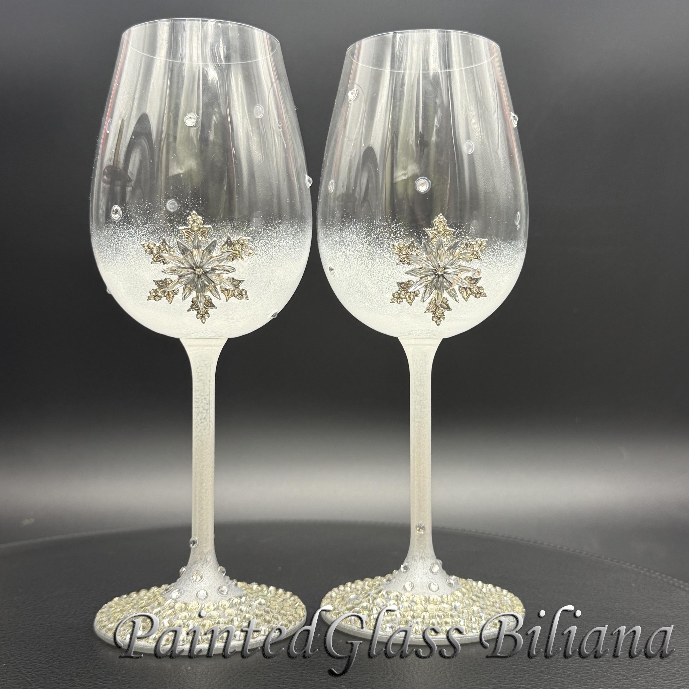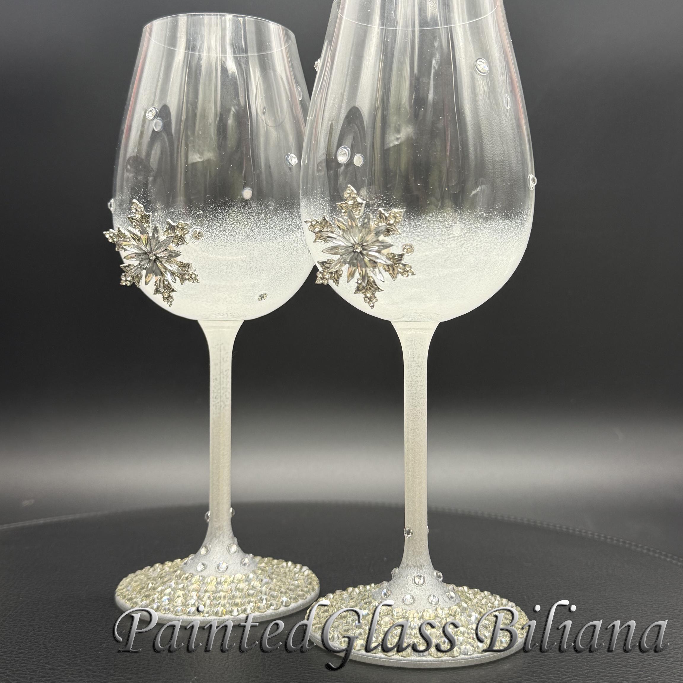 Set of 2 hand painted toasting wine glasses with tender crystal snowflake in silver at the stem of the glass.