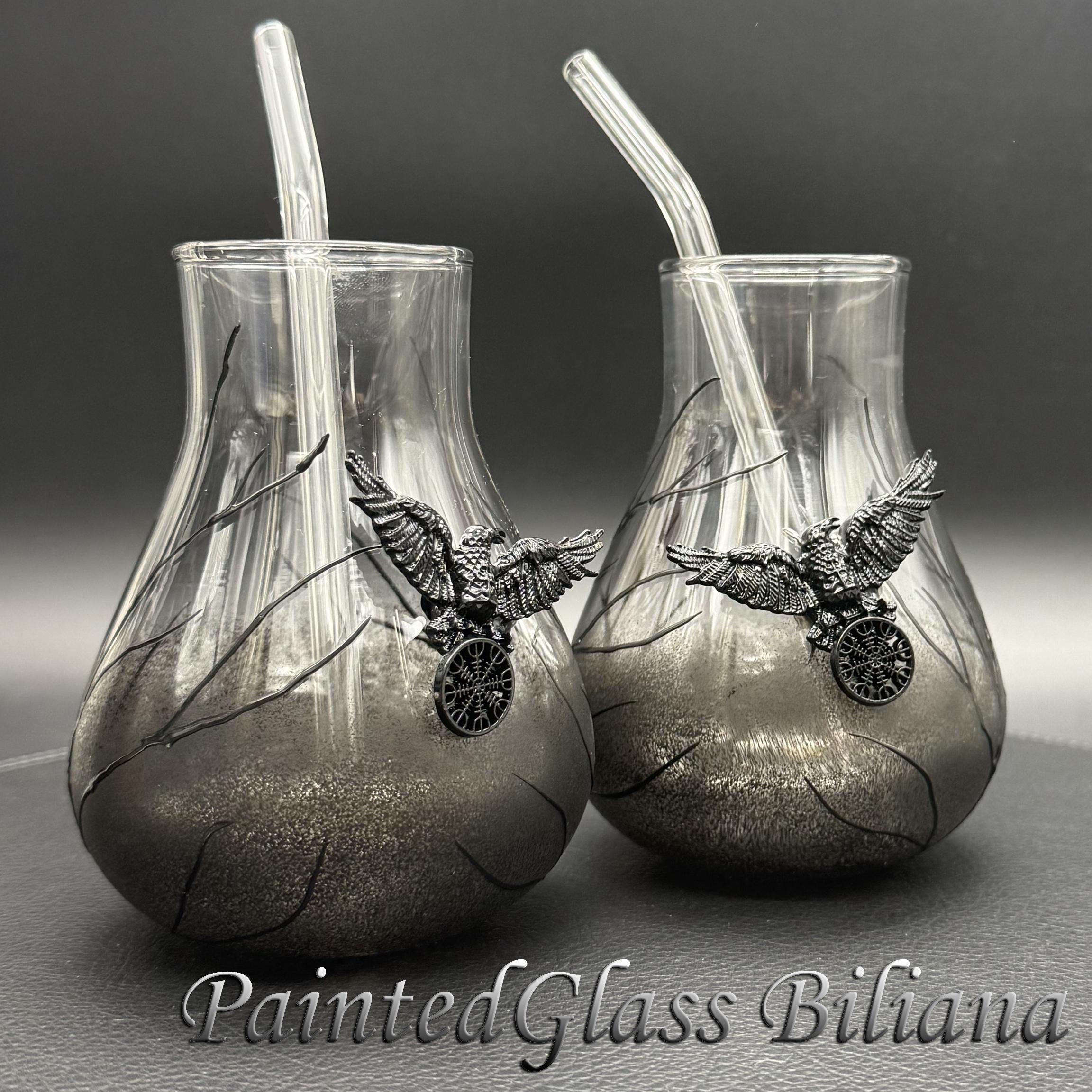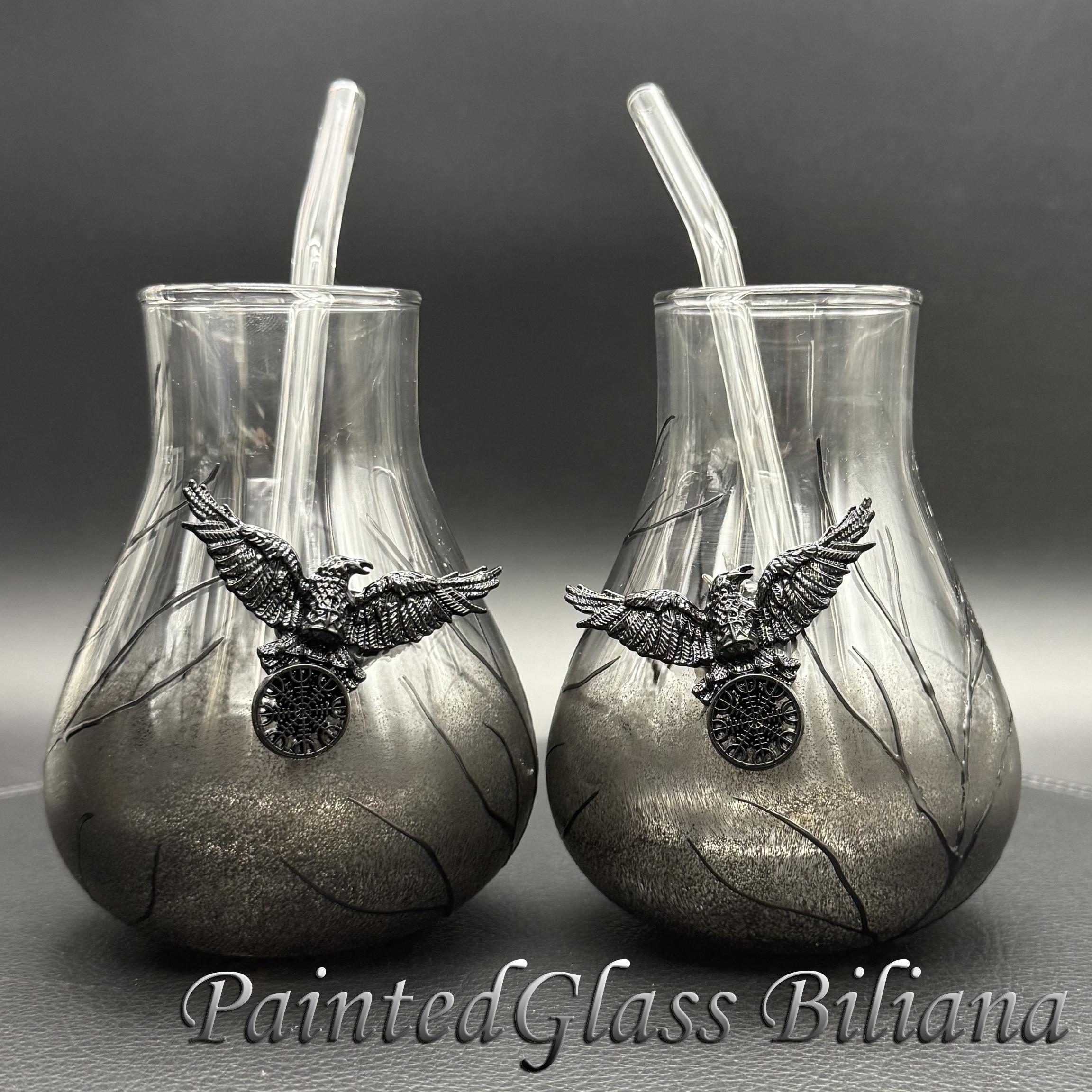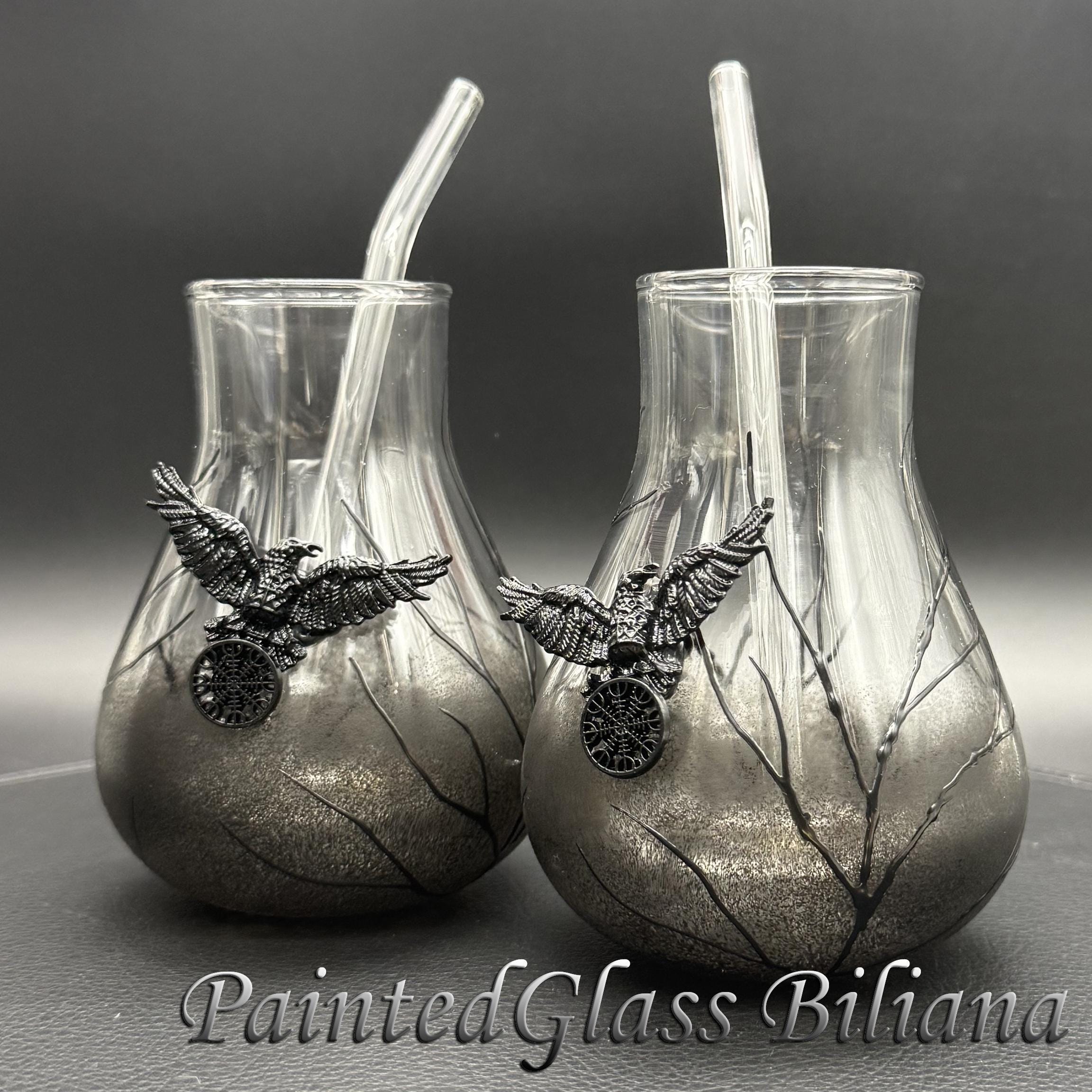 Hand painted cocktail glasses, decorated with black ravens, set of 2.