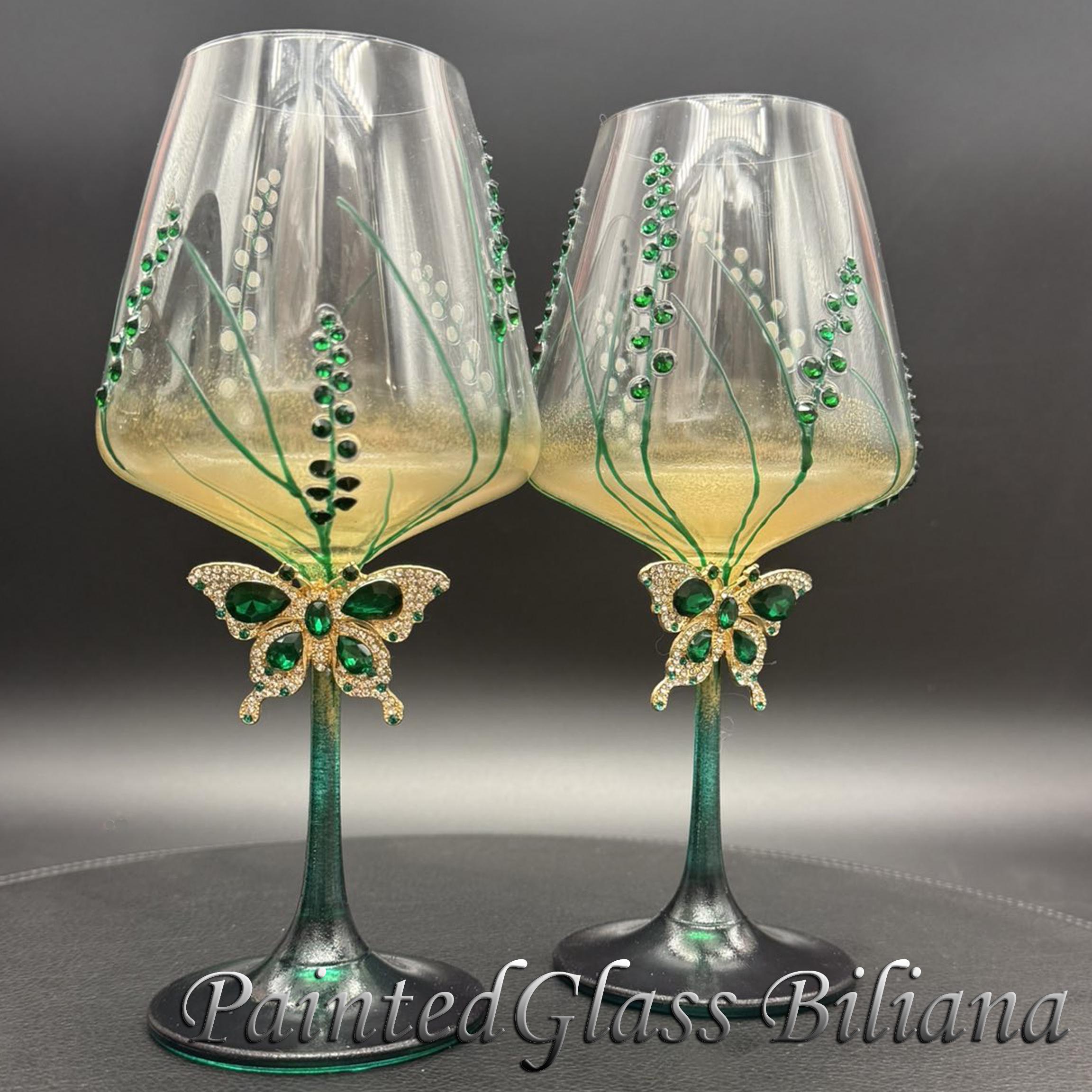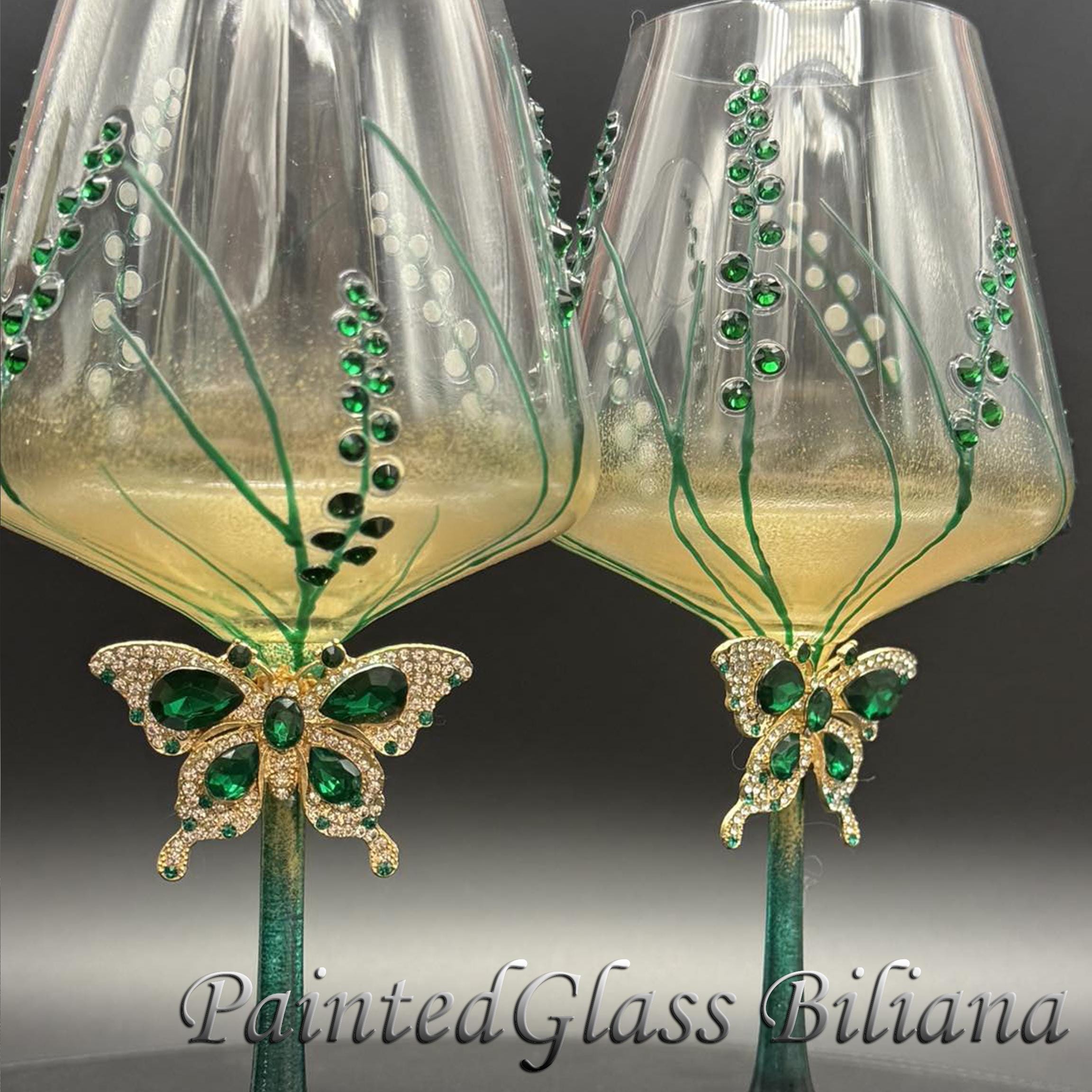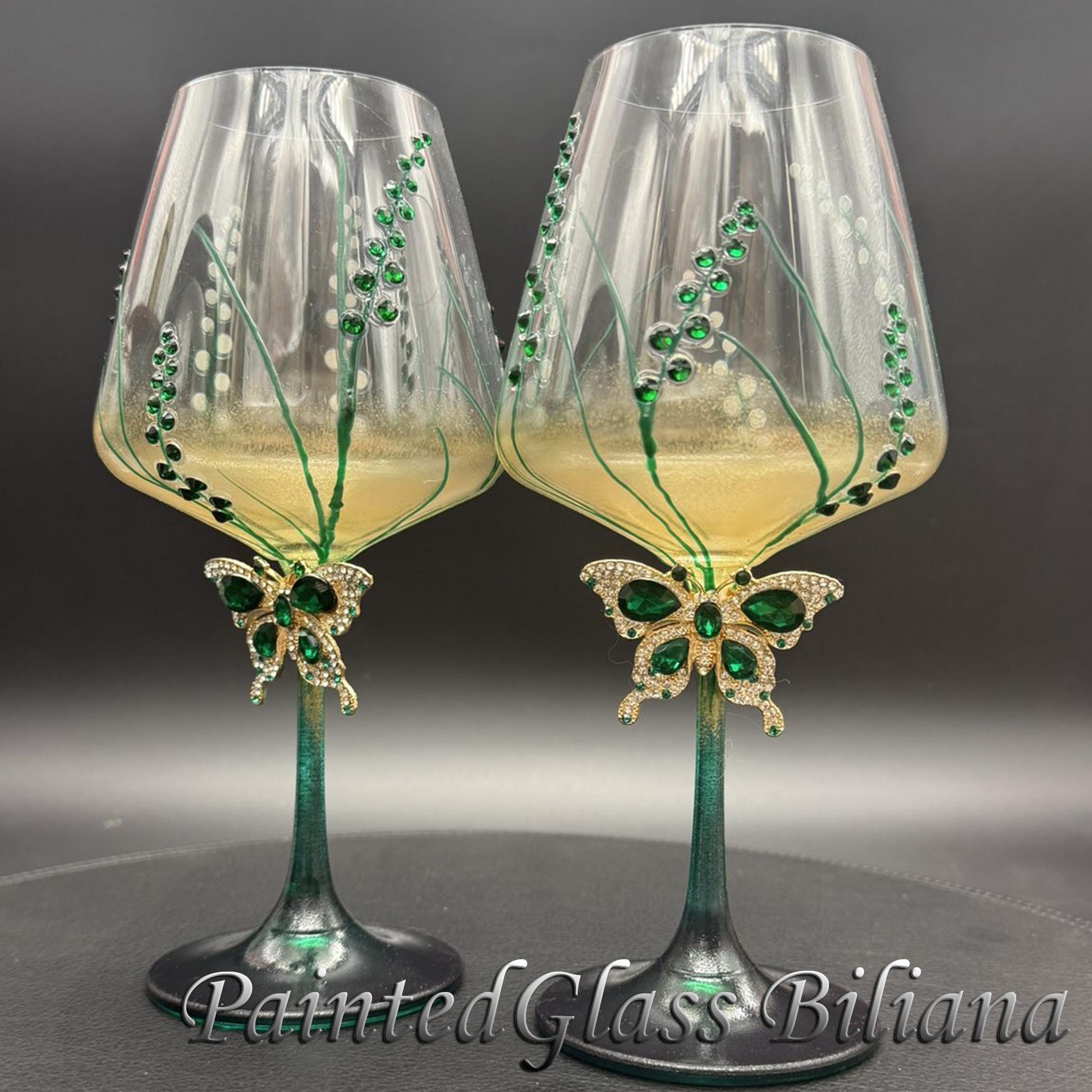 Set of 2 hand painted toasting wine glasses with emerald green crystals butterflies