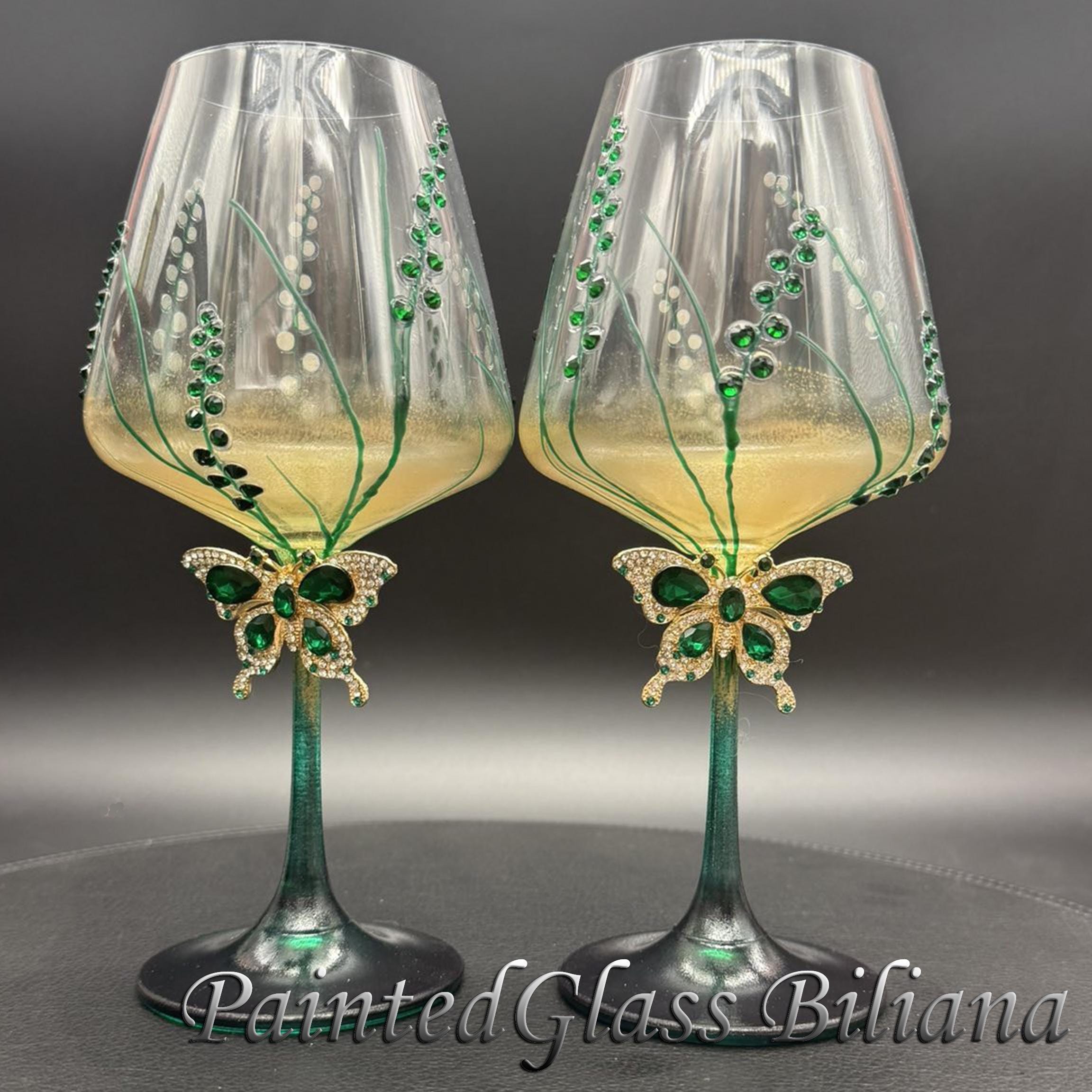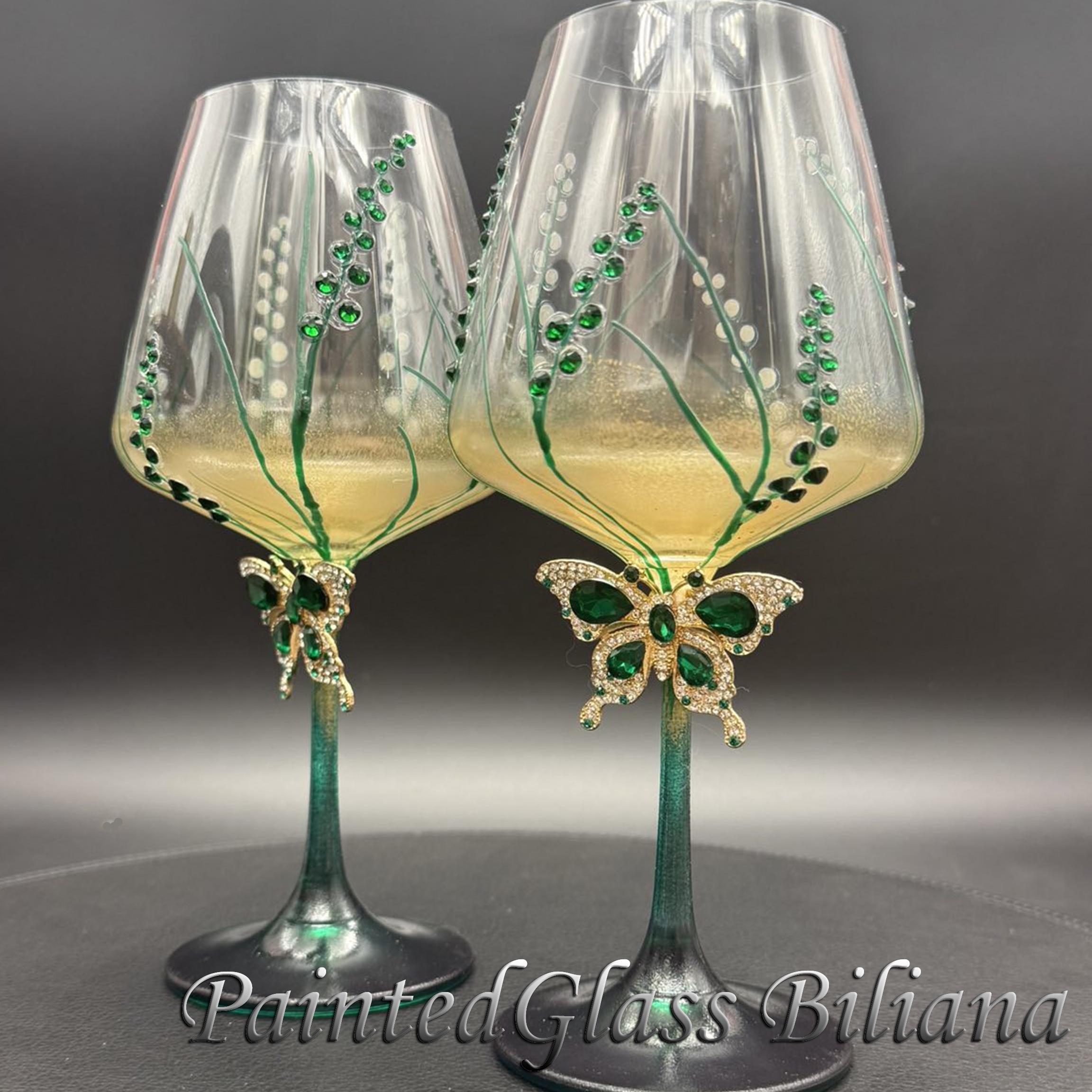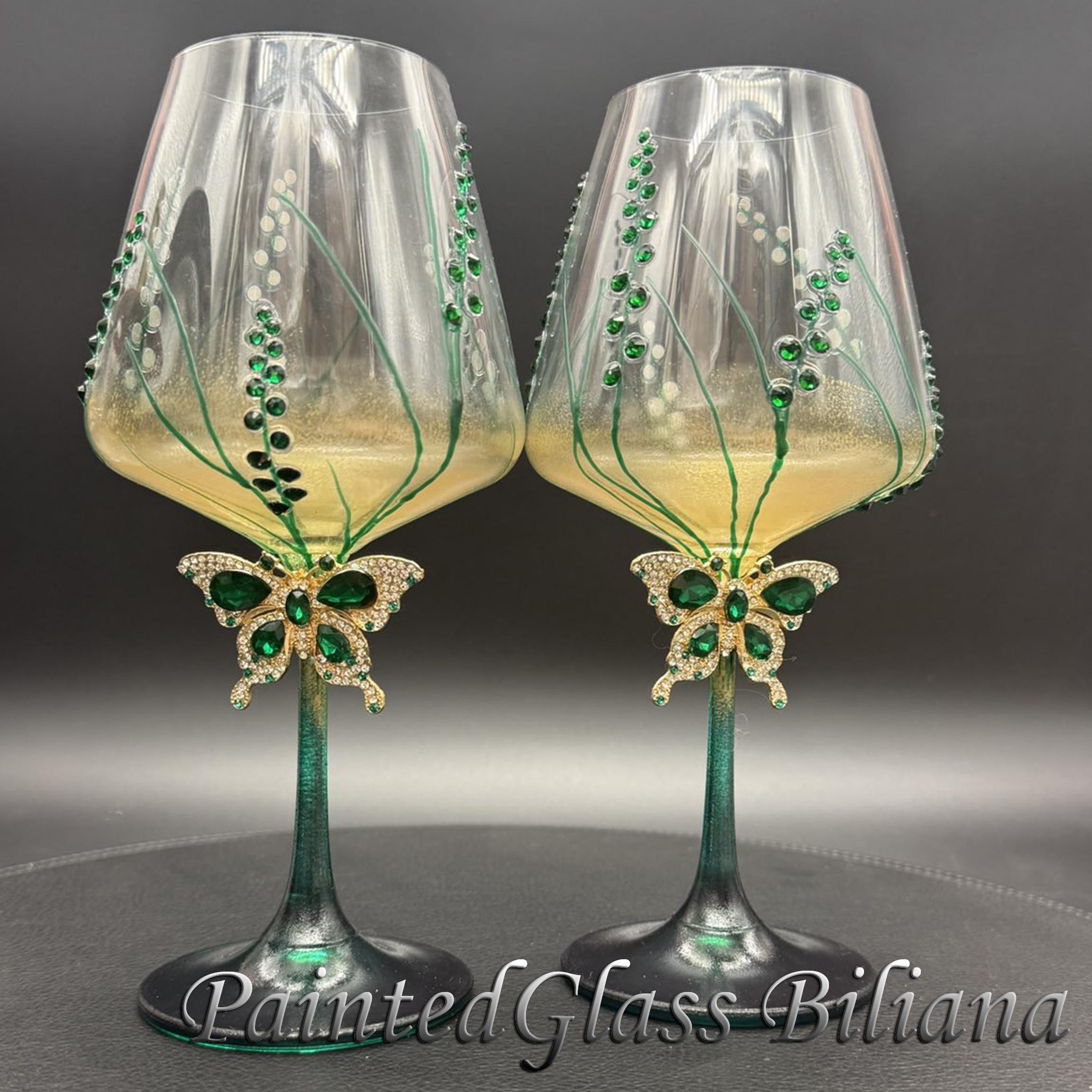 Set of 2 hand painted toasting wine glasses with emerald green crystals butterflies