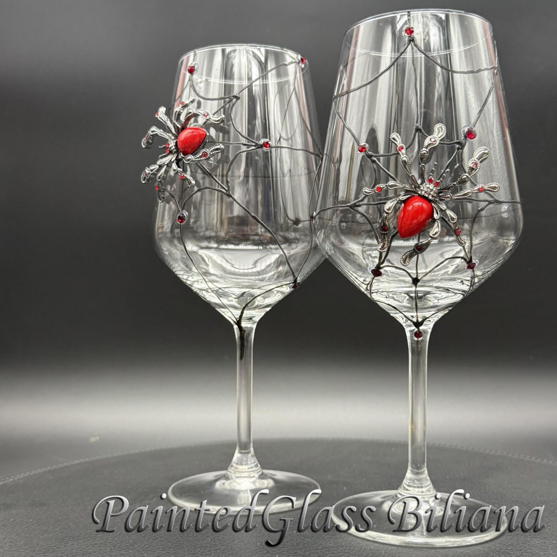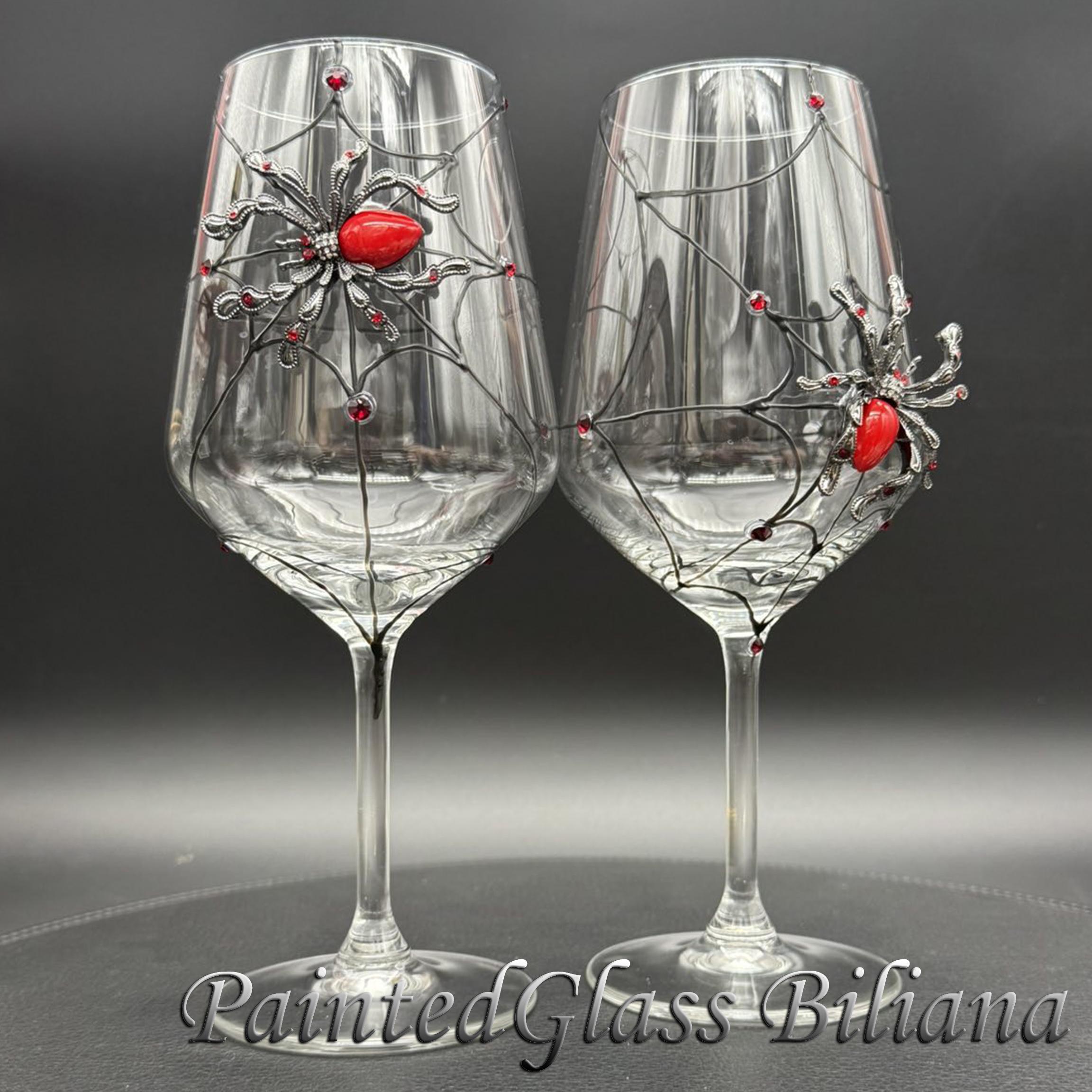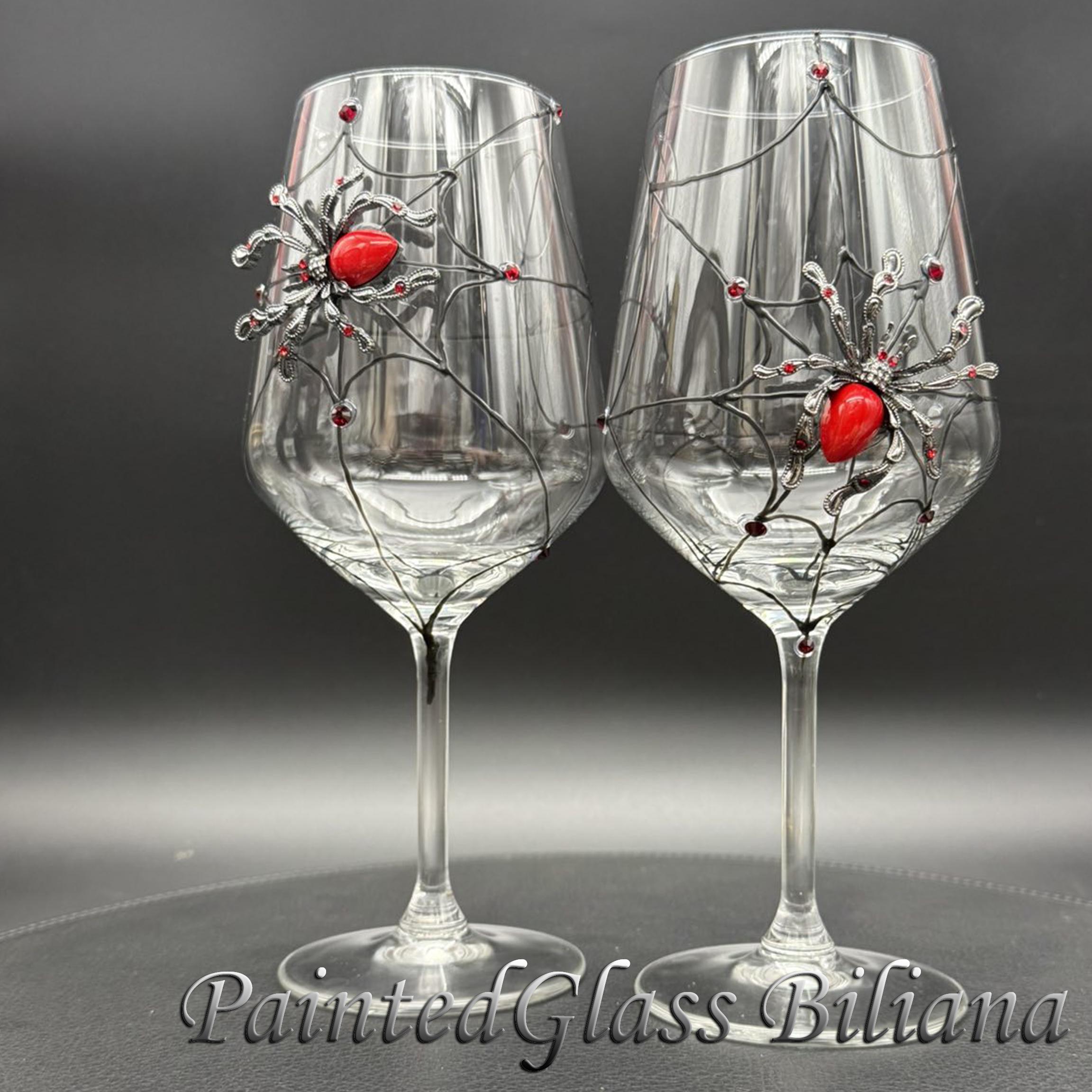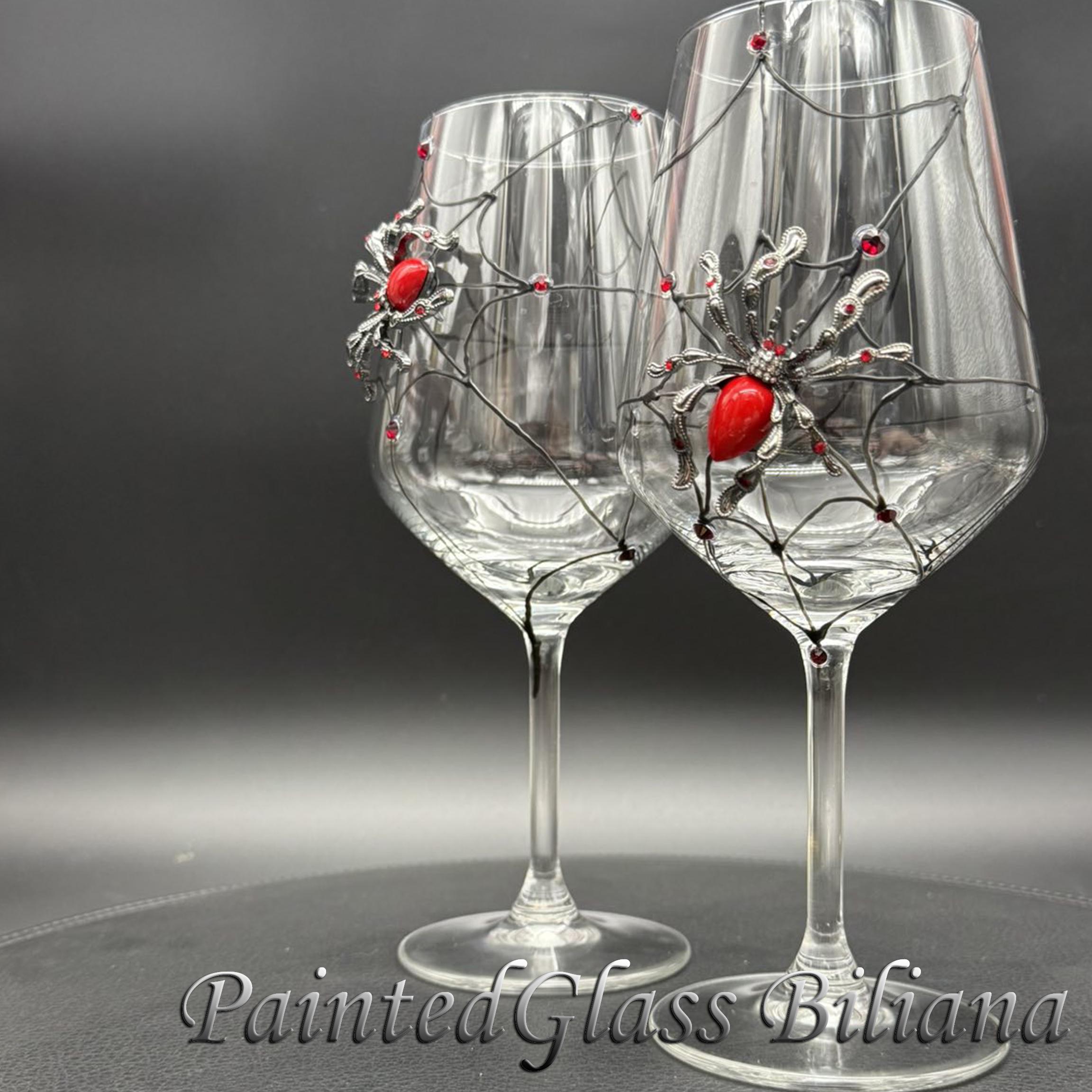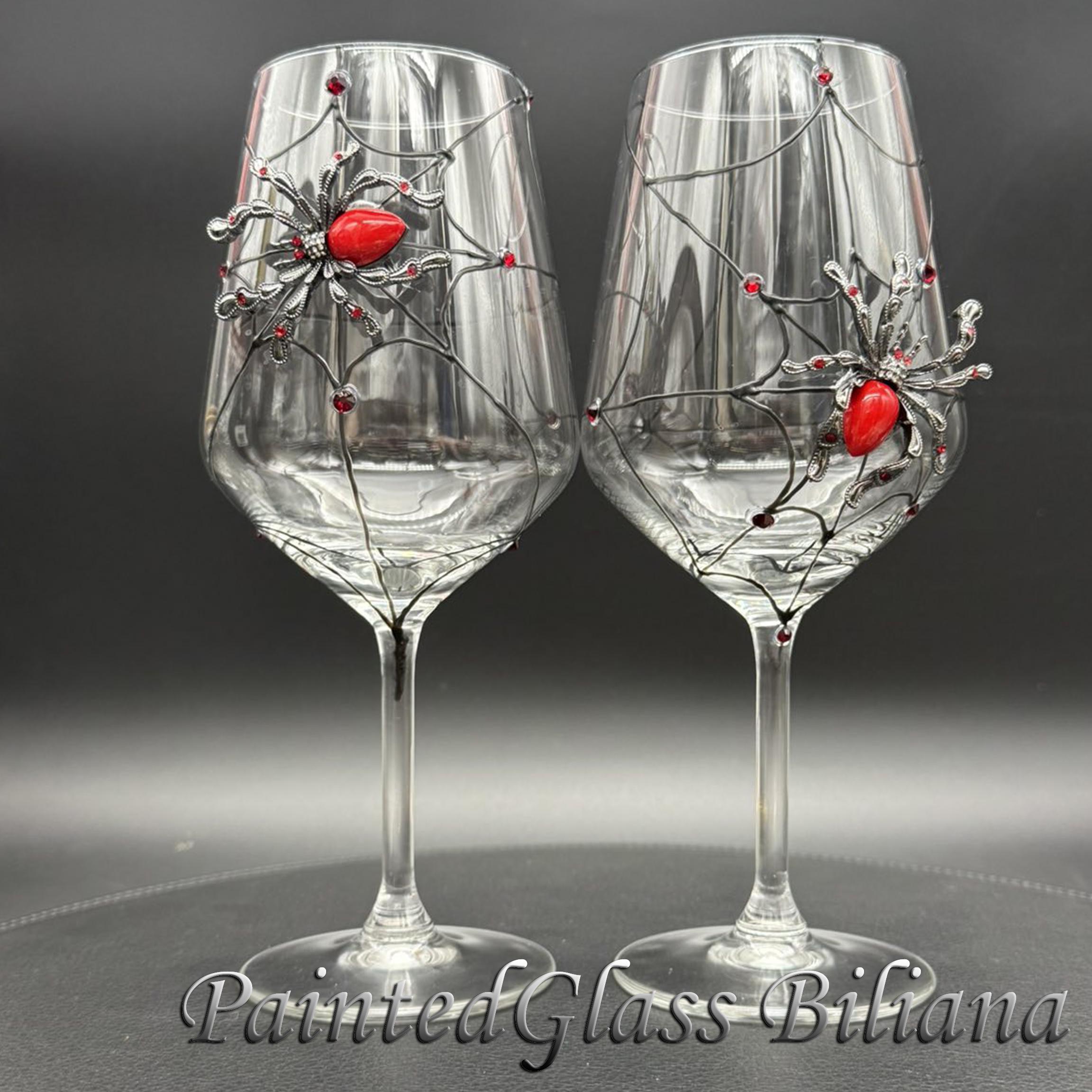 Hand painted wine glasses, decorated with red crystal spider.