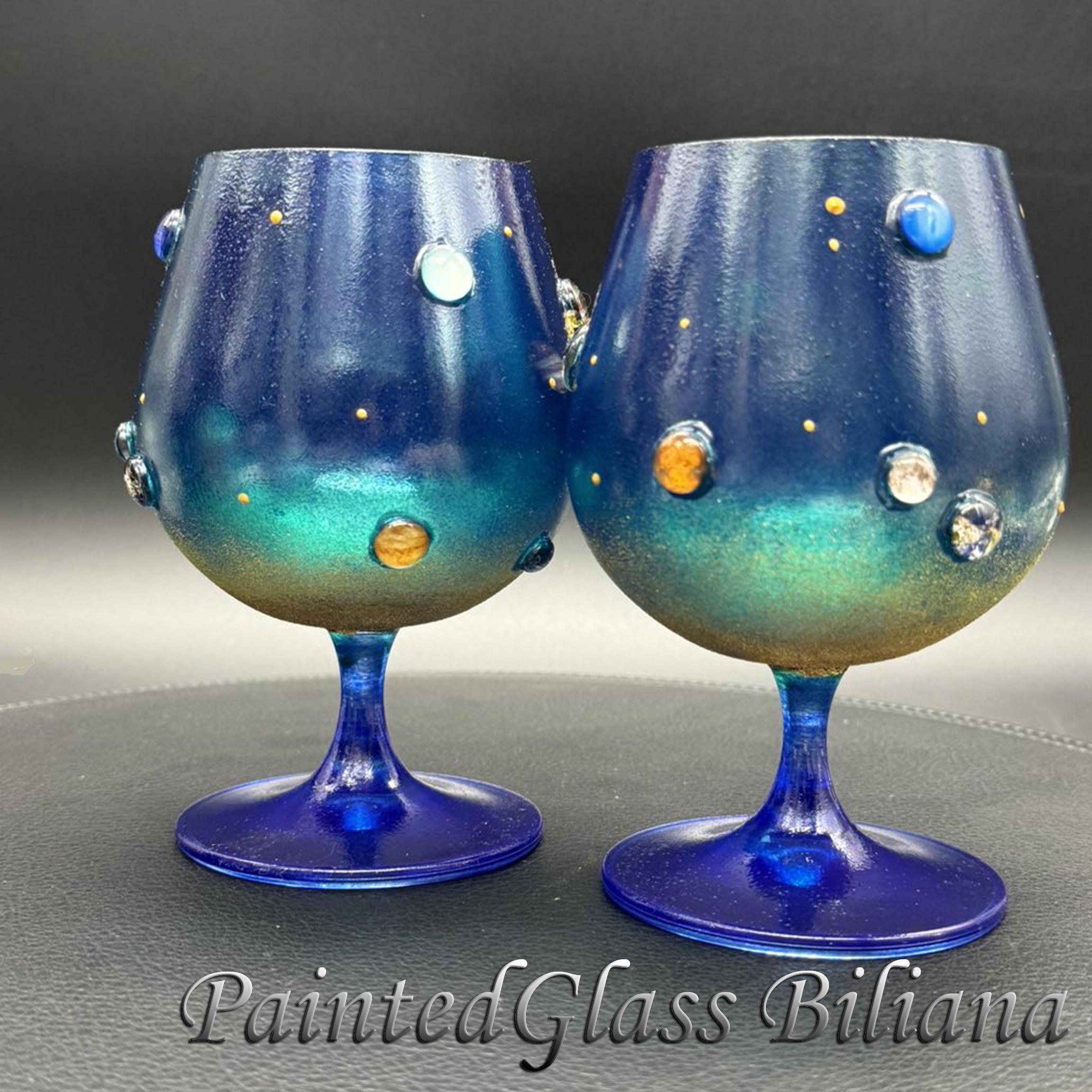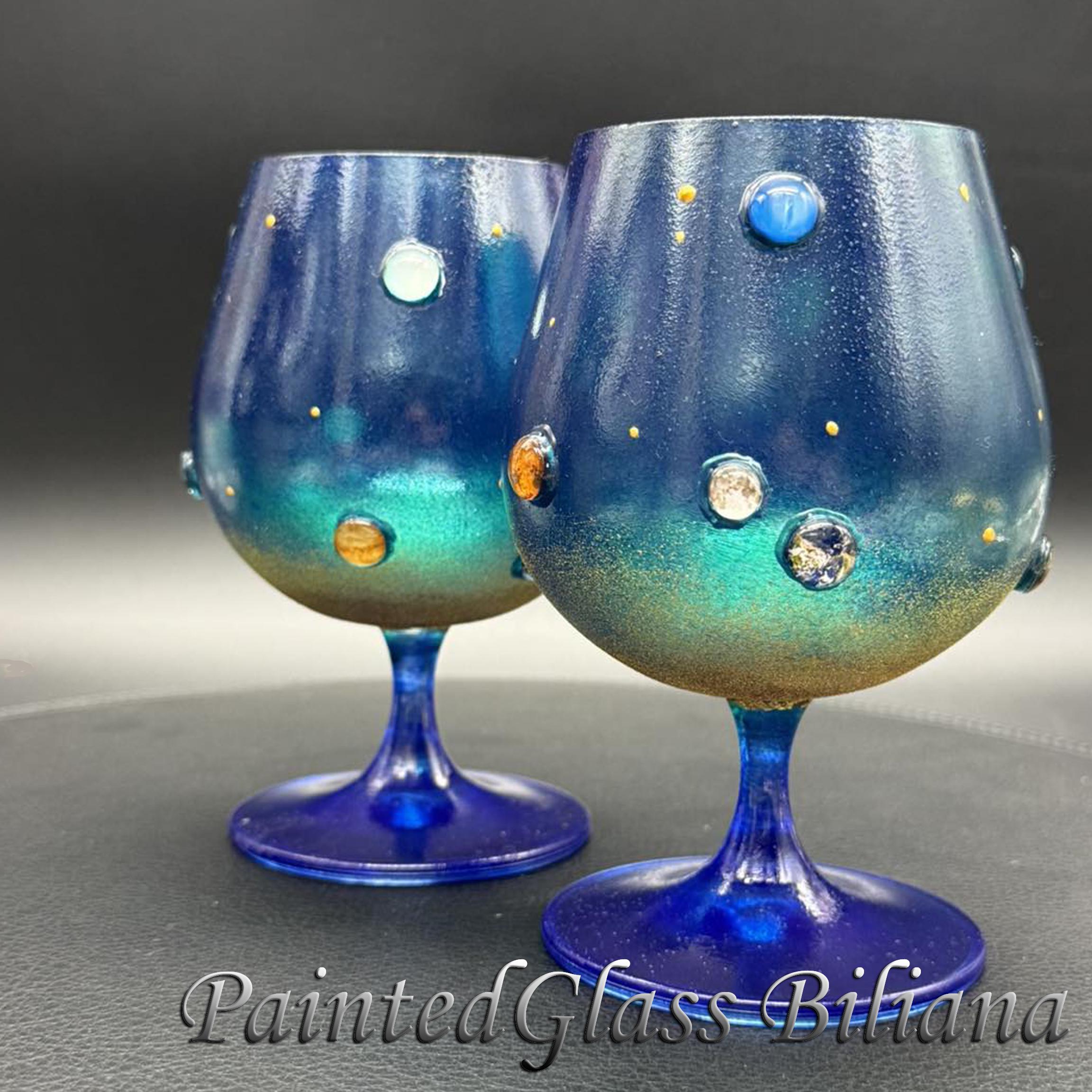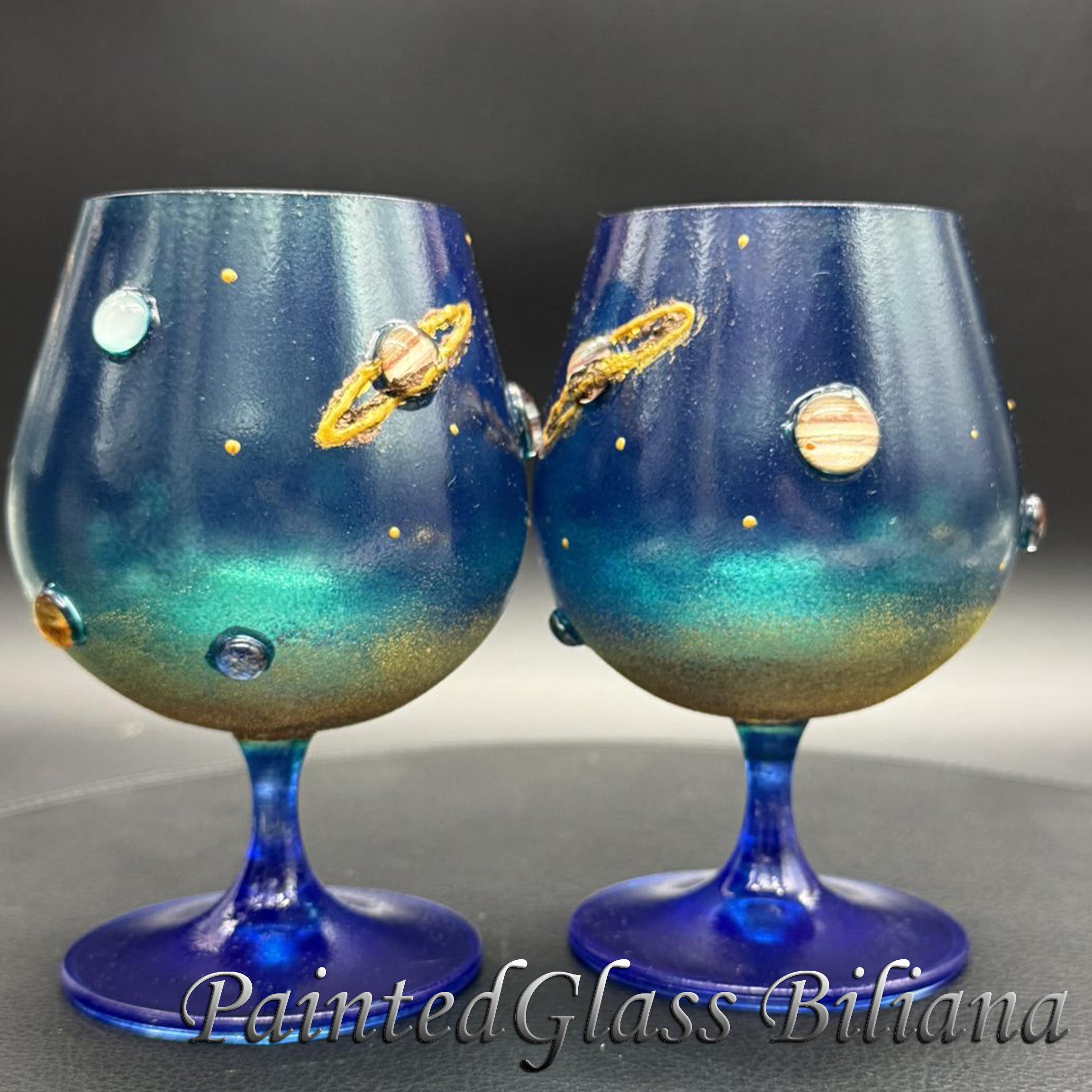 Set of 2 hand painted brandy glasses with solar system planet design.