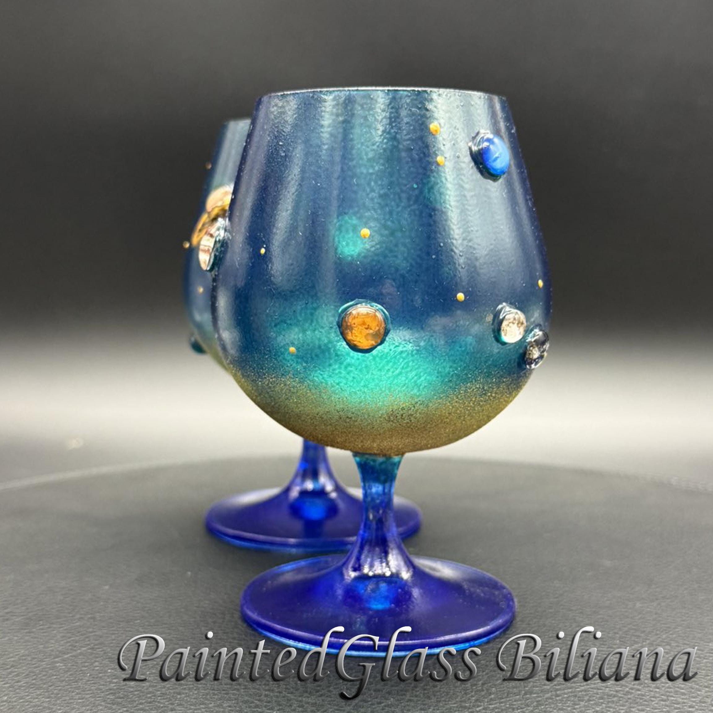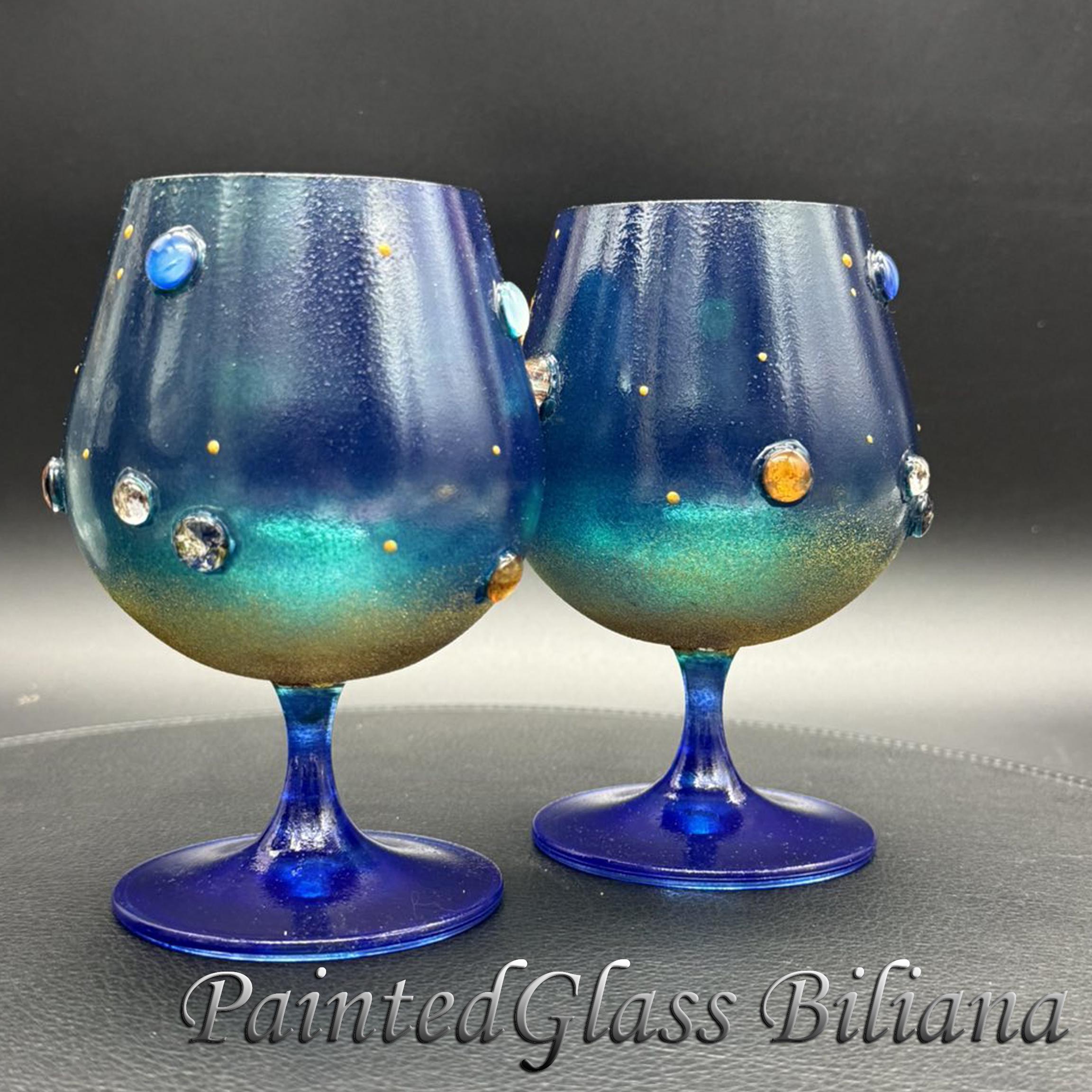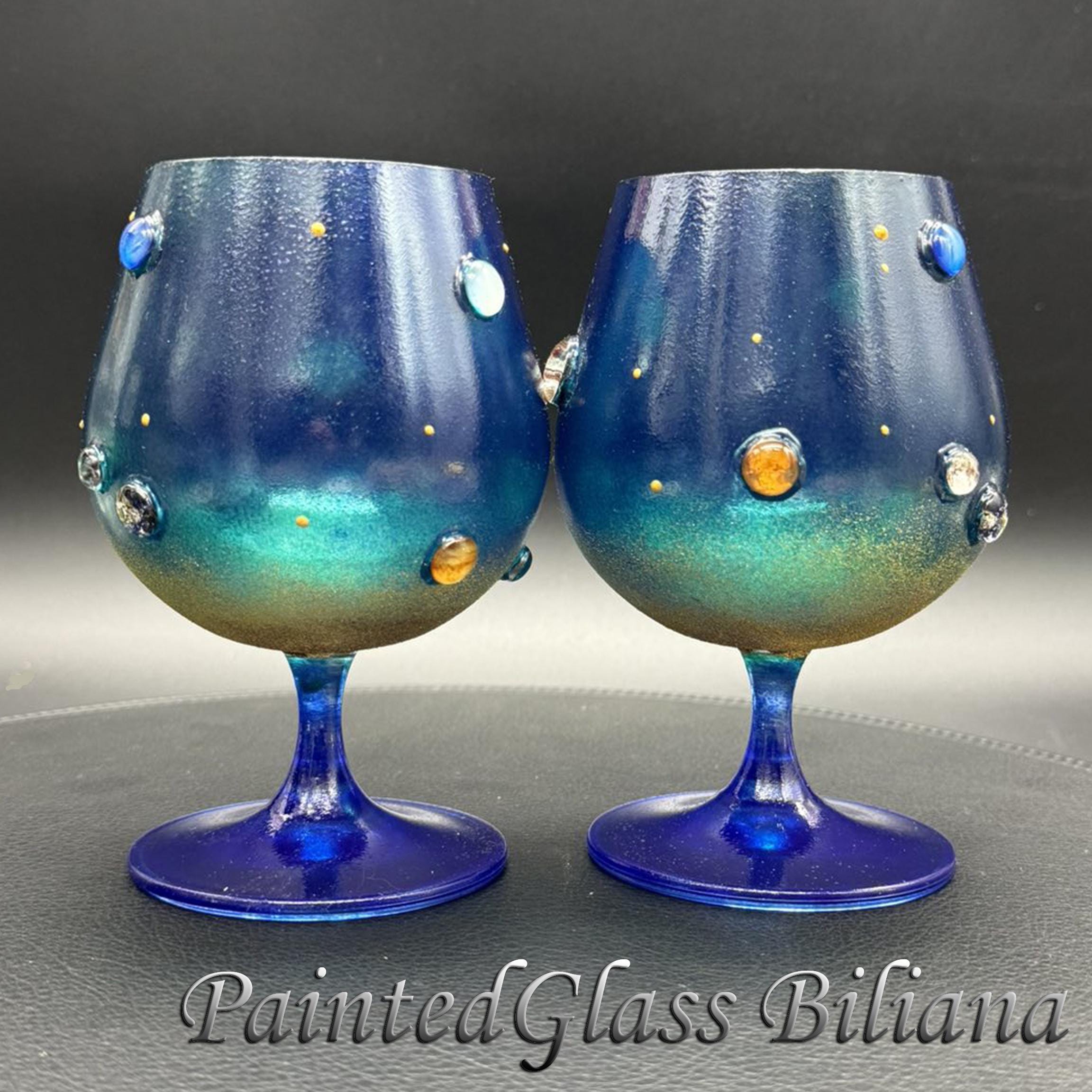 Set of 2 hand painted brandy glasses with solar system planet design.