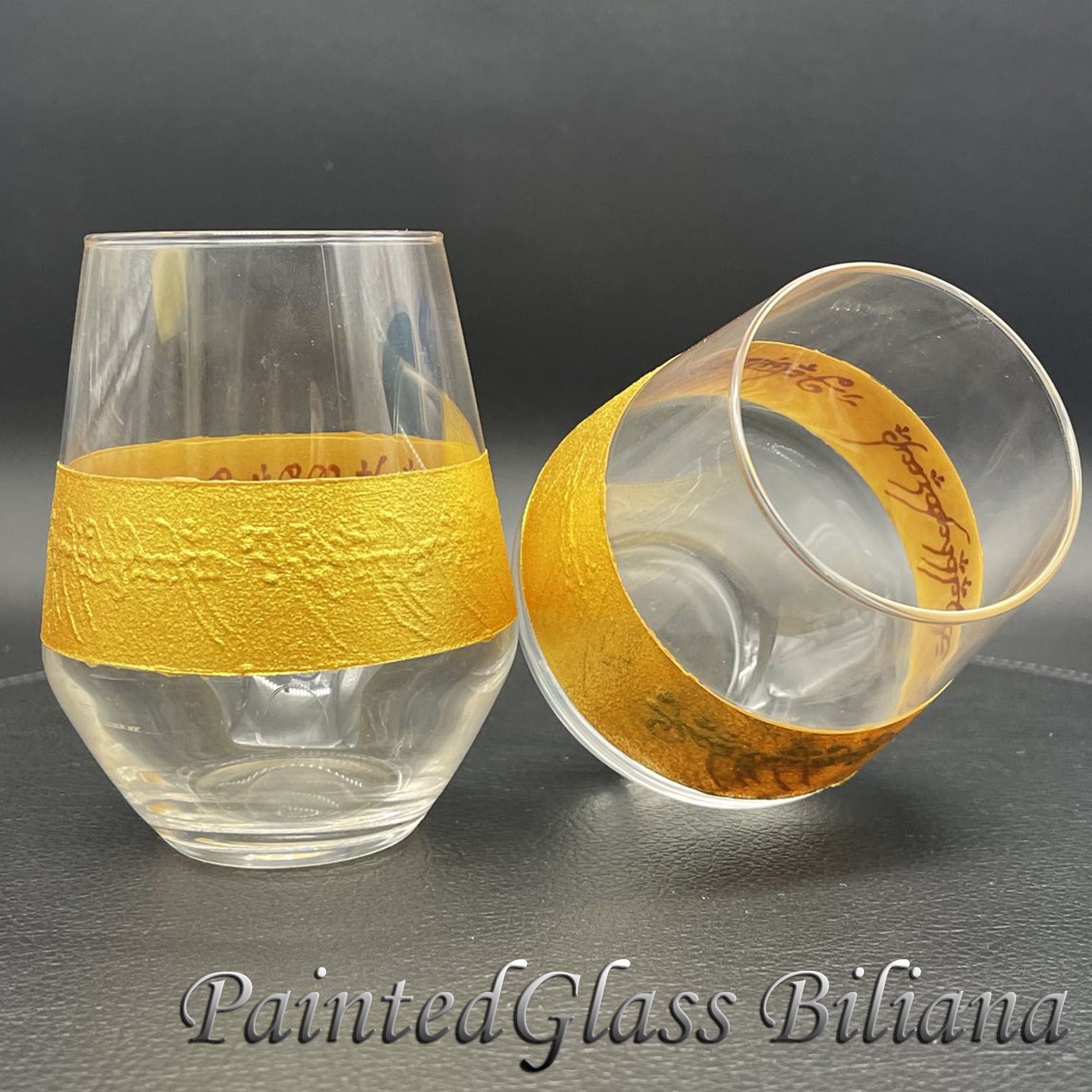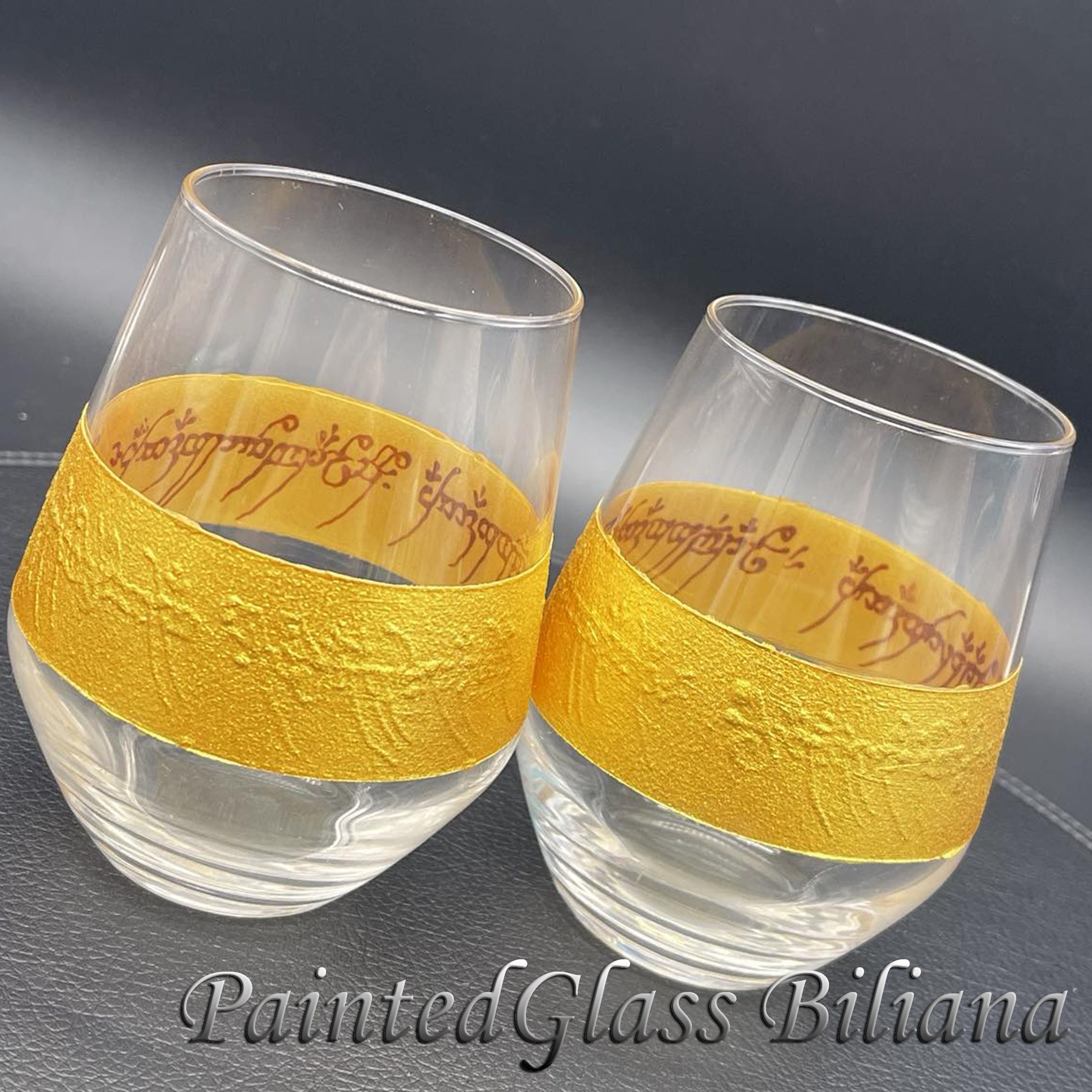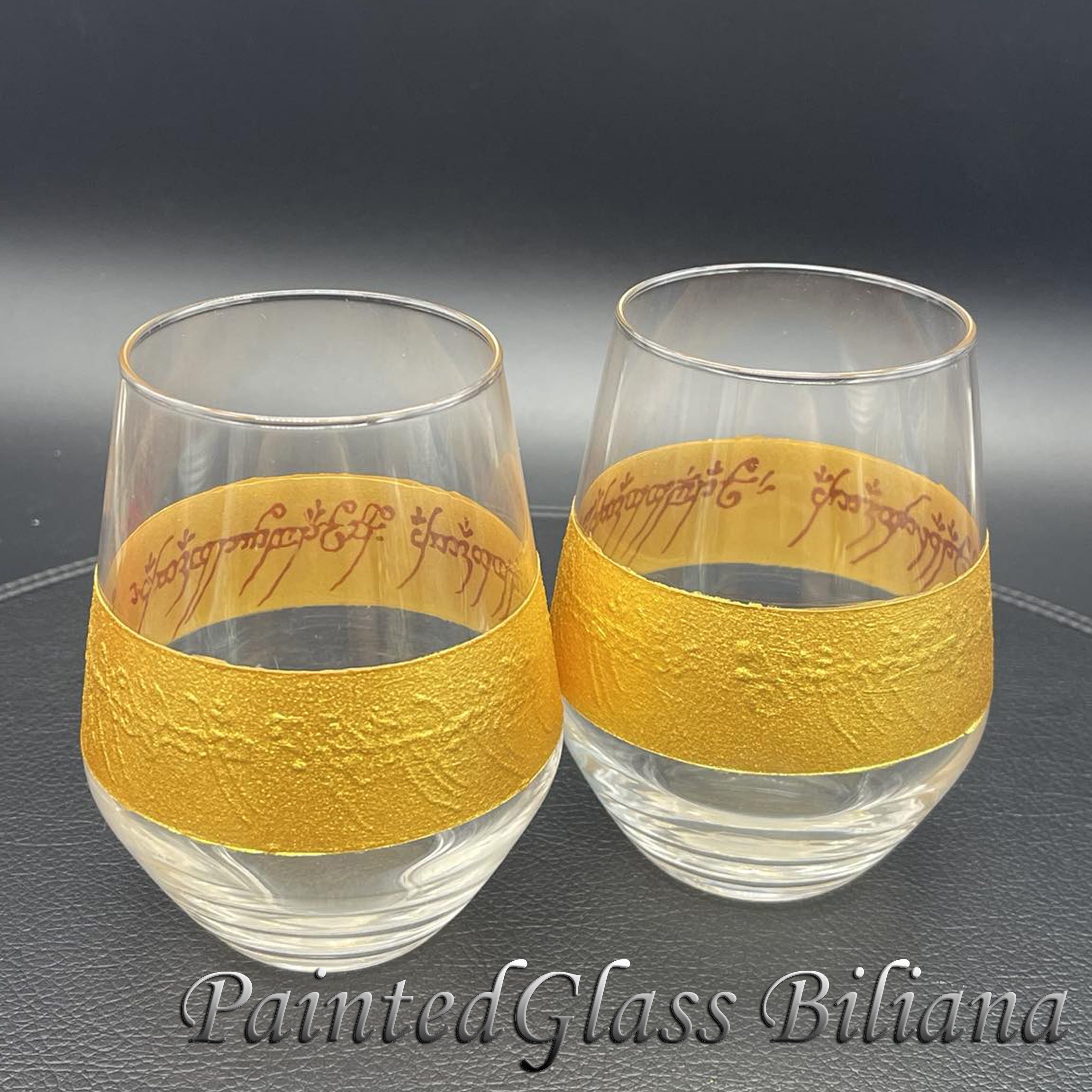 Set of 2 hand painted Lord of the rings toasting stemless wine glasses One ring to rule them all with delicate elvish text.