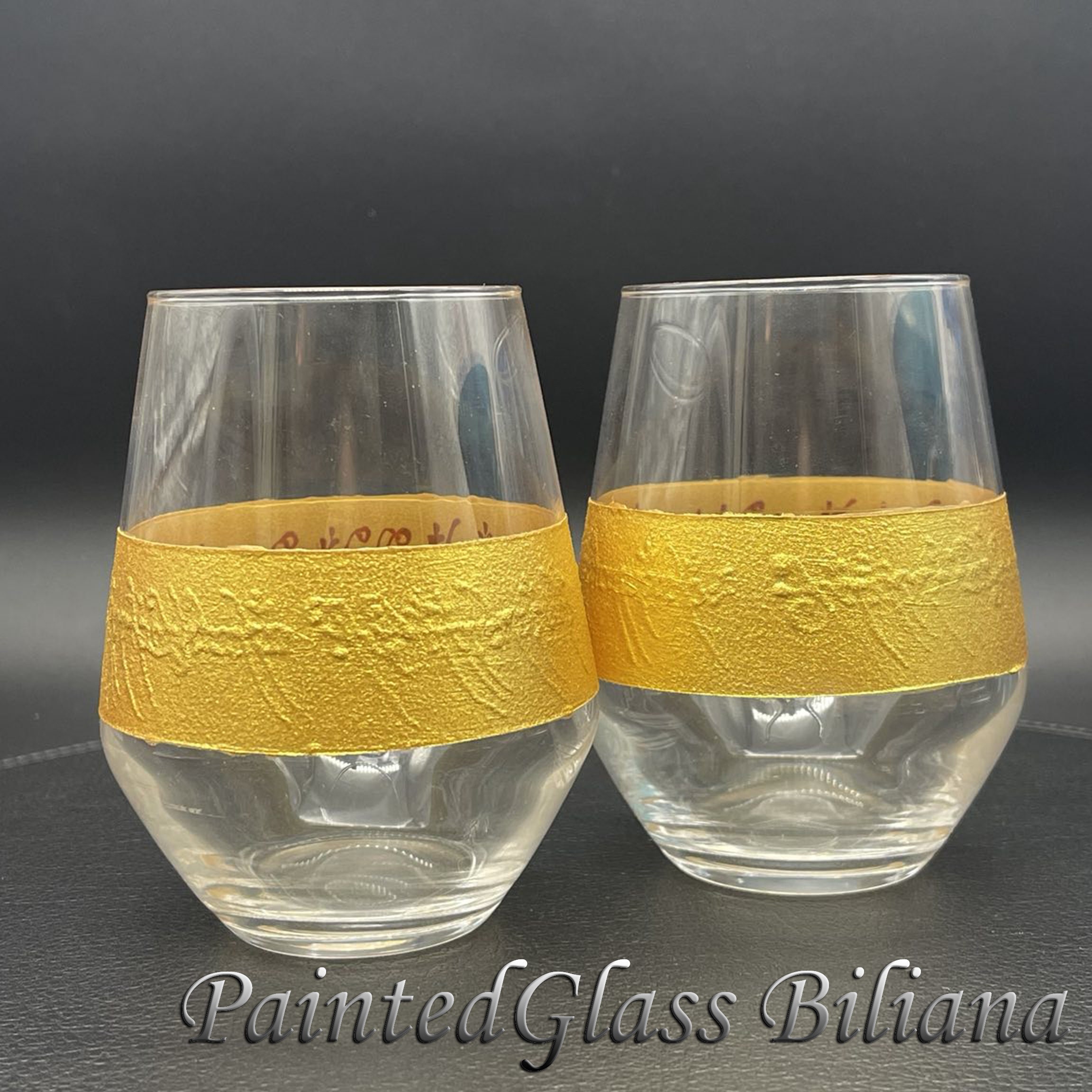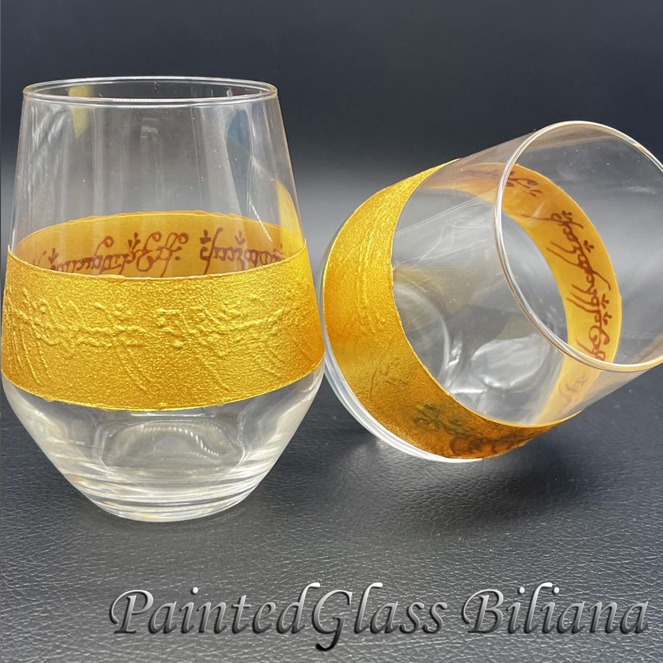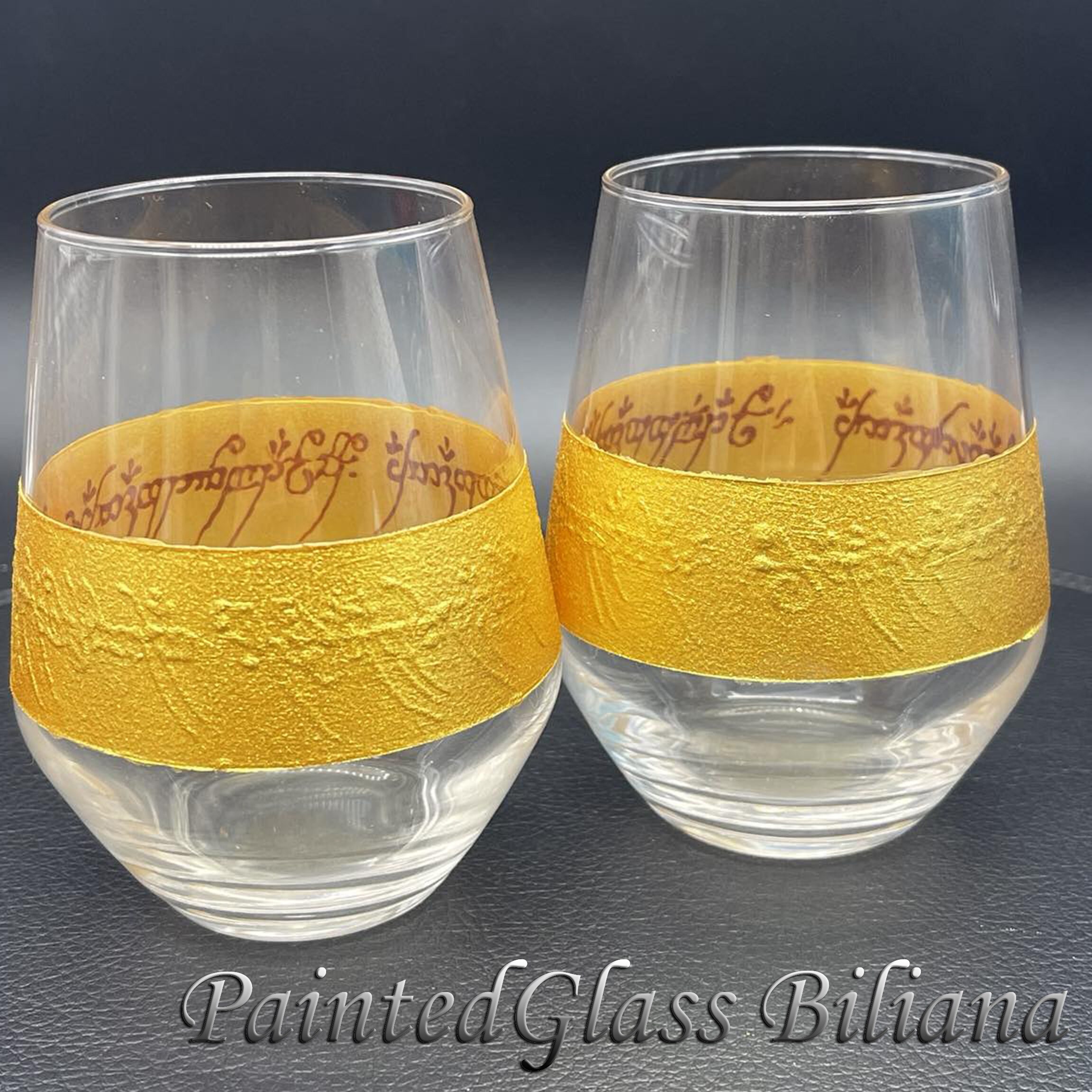 Set of 2 hand painted Lord of the rings toasting stemless wine glasses One ring to rule them all with delicate elvish text.