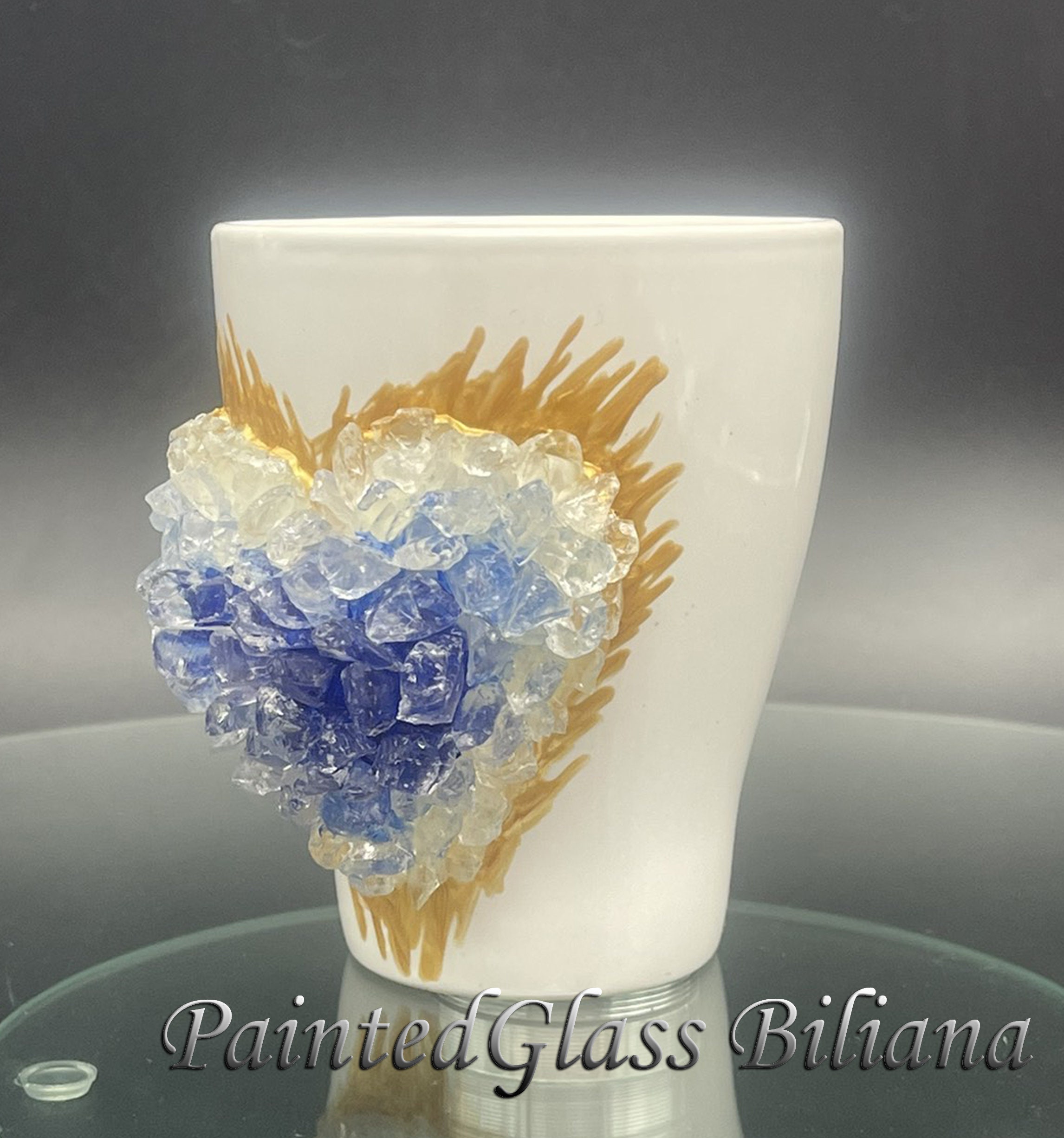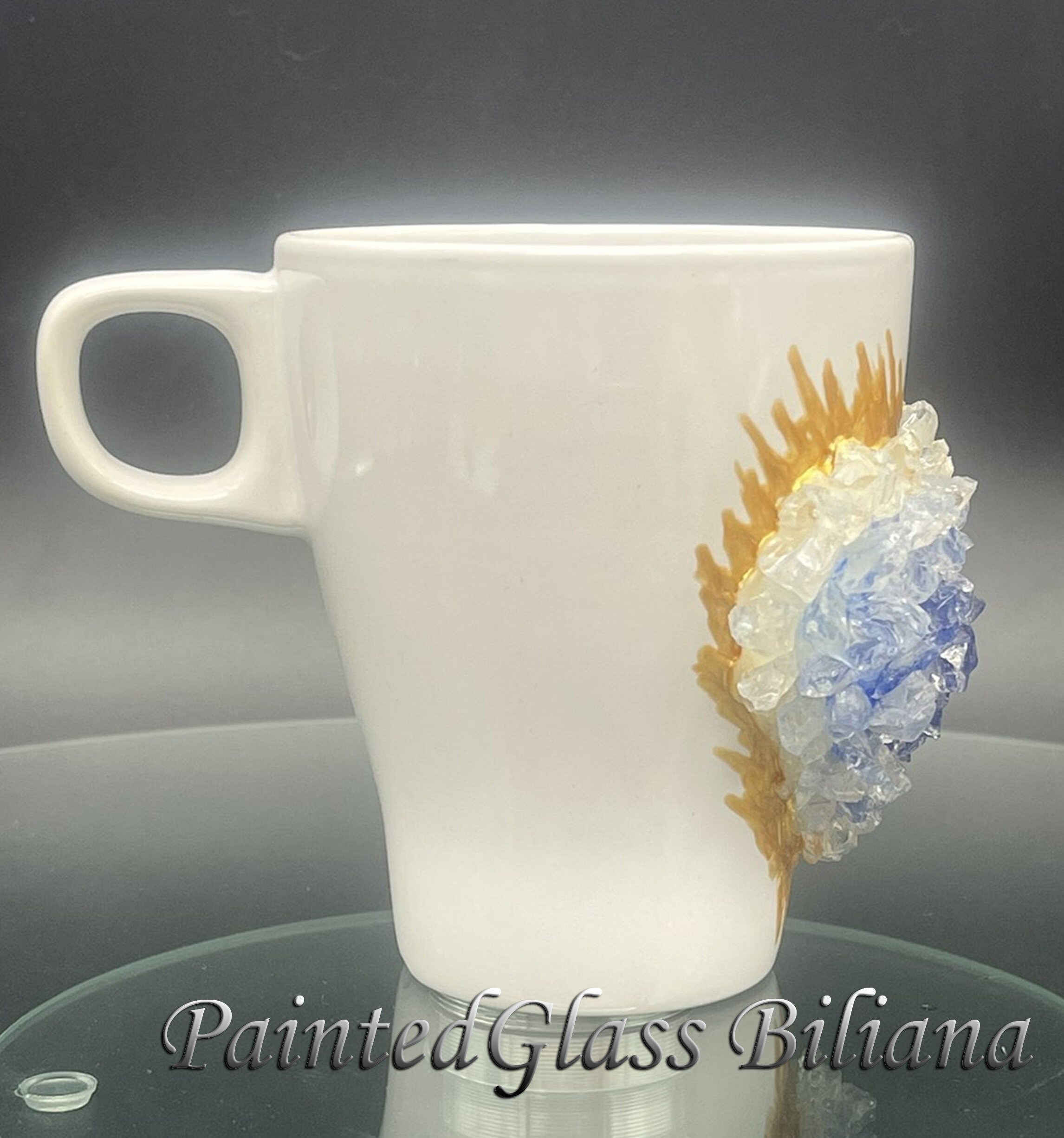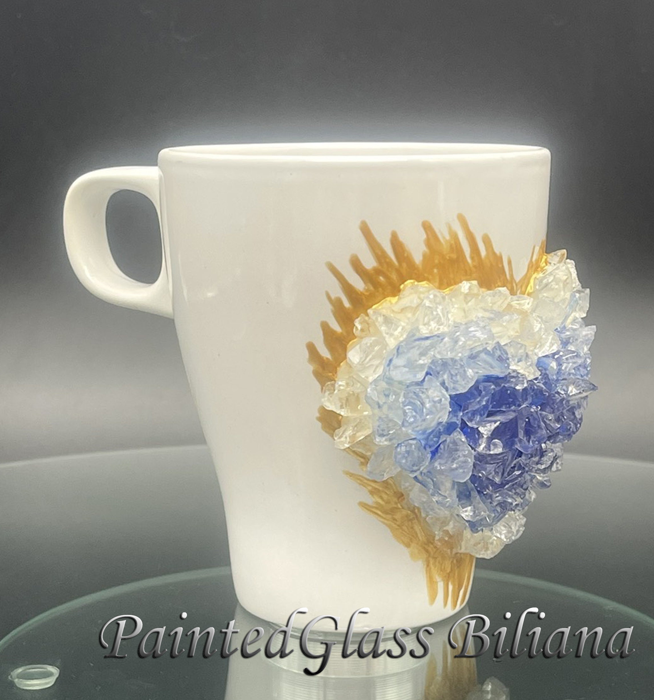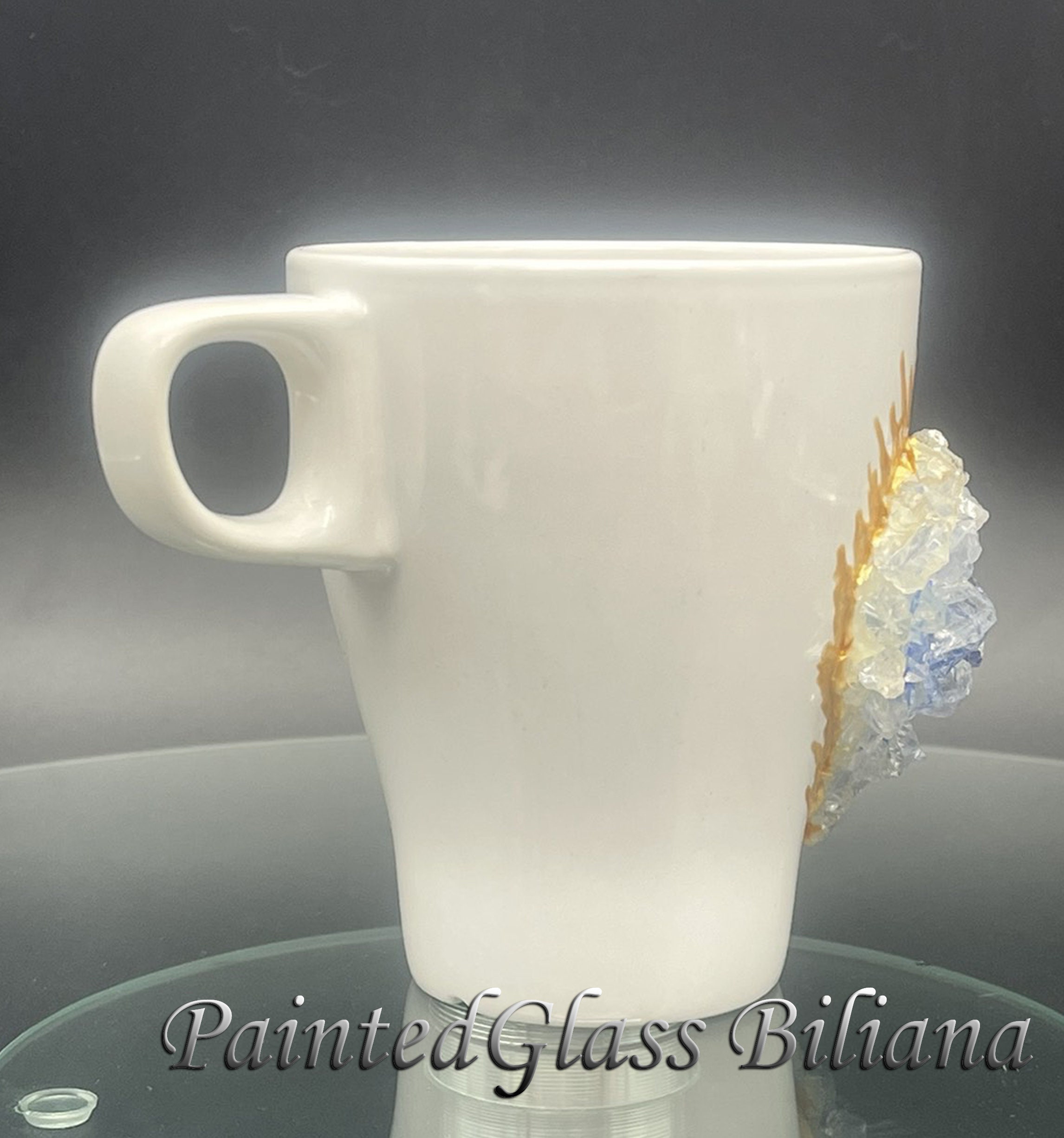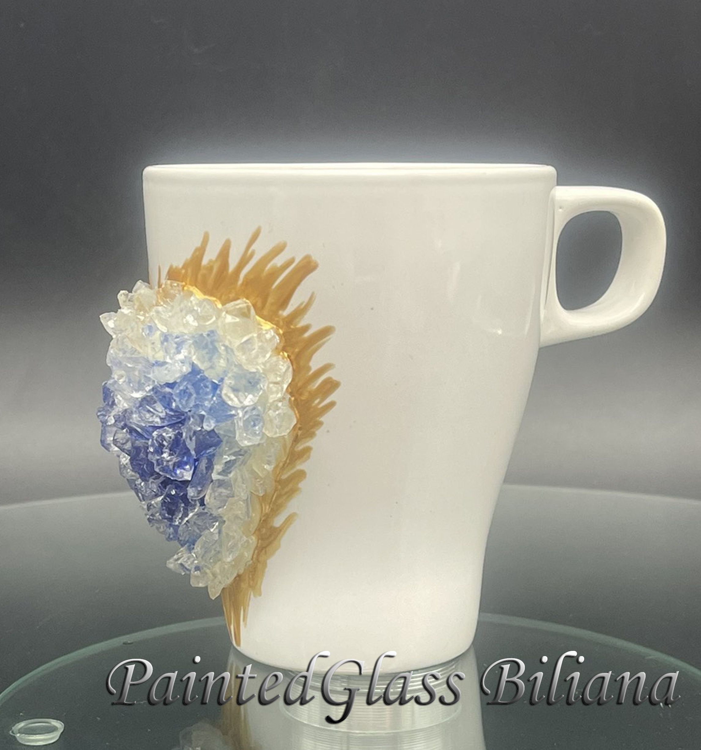 Beautiful blue coffee ceramic mug with geode heart design, decorated with crystals in blue color with gold accents.
